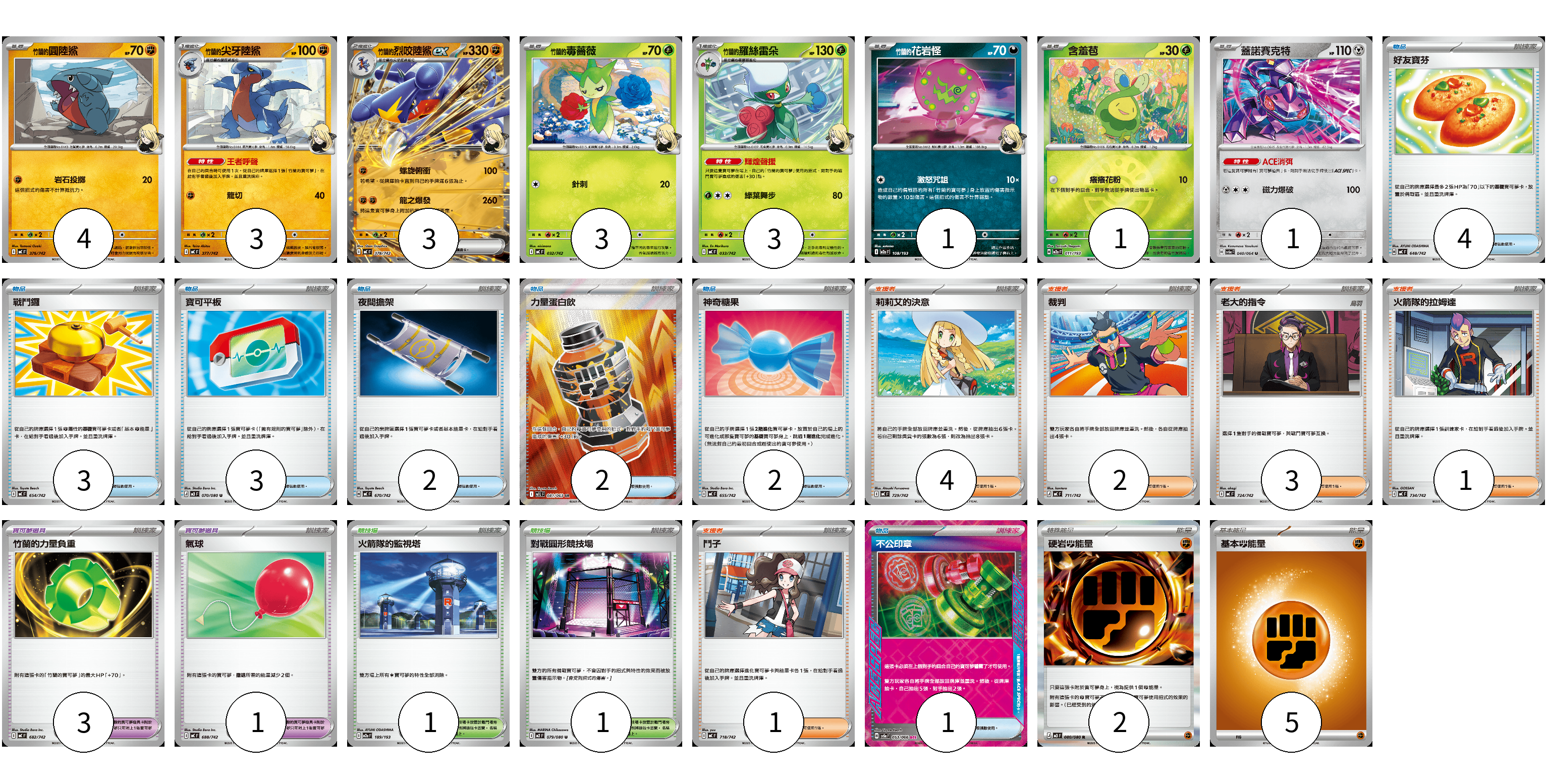 牌組構築方案 以此牌組為基礎新構築牌組 顯示卡面 顯示列表 寶可夢卡(19) 4 3 3 3 3 1 1 1 寶可夢道具(4) 3 1 物品卡(17) 4 3 3 2 2 2 1 支援者卡(11) 4 2 3 1 1 競技場卡(2) 1 1 能量卡(7) 2 5 寶可夢卡(19) 卡牌名稱 張數 卡牌名稱 張數 竹蘭的圓陸鯊 MC 376/742 04 竹蘭的尖牙陸鯊 MC 377/742 03 <竹蘭的>烈咬陸鯊ex MC 378/742 03 竹蘭的毒薔薇 MC 032/742 03 <竹蘭的>羅絲雷朵 MC 033/742 03 <竹蘭的>花岩怪 M2a 108/193 01 含羞苞 M2a 011/193 01 蓋諾賽克特 SV6a 040/064 01 寶可夢道具(4) 卡牌名稱 張數 卡牌名稱 張數 竹蘭的力量負重 MC 682/742 03 氣球 MC 688/742 01 物品卡(17) 卡牌名稱 張數 卡牌名稱 張數 好友寶芬 MC 648/742 04 戰鬥鑼 MC 654/742 03 寶可平板 M3 070/080 03 夜間擔架 MC 670/742 02 力量蛋白飲 M1L 081/063 02 神奇糖果 MC 655/742 02 不公印章 SV5a 053/066 01 支援者卡(11) 卡牌名稱 張數 卡牌名稱 張數 莉莉艾的決意 MC 729/742 04 裁判 MC 711/742 02 老大的指令 MC 724/742 03 火箭隊的拉姆達 MC 734/742 01 鬥子 MC 718/742 01 競技場卡(2) 卡牌名稱 張數 卡牌名稱 張數 火箭隊的監視塔 M2a 189/193 01 對戰圓形競技場 M2 079/080 01 能量卡(7) 卡牌名稱 張數 卡牌名稱 張數 硬岩【鬥】能量 M3 080/080 02 基本【鬥】能量 MC FIG 05 以此牌組為基礎新構築牌組 牌組編碼 rVnakp-KDjtZS-wCvWcy copy 列印牌組單 牌組編碼已複製 分享至SNS