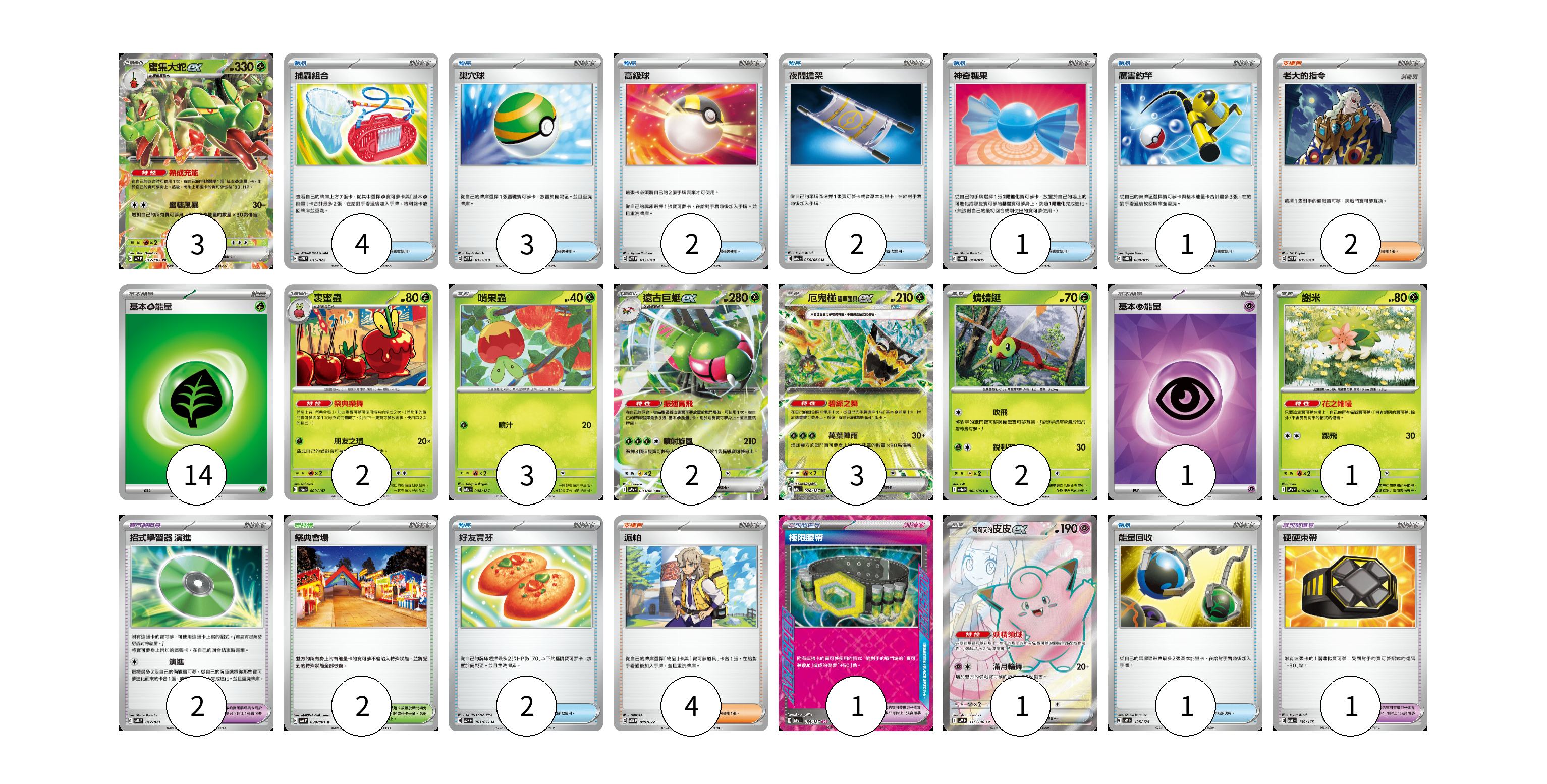 牌組構築方案 以此牌組為基礎新構築牌組 顯示卡面 顯示列表 寶可夢卡(17) 3 2 3 2 3 2 1 1 寶可夢道具(4) 2 1 1 物品卡(16) 4 3 2 2 1 1 2 1 支援者卡(6) 2 4 競技場卡(2) 2 能量卡(15) 14 1 寶可夢卡(17) 卡牌名稱 張數 卡牌名稱 張數 蜜集大蛇ex SV7 012/102 03 裹蜜蟲 SV8a 009/187 02 啃果蟲 SV8a 008/187 03 遠古巨蜓ex SV9a 003/063 02 厄鬼椪 碧草面具ex SV8a 020/187 03 蜻蜻蜓 SV9a 002/063 02 謝米 SV9a 006/063 01 莉莉艾的皮皮ex SV9 115/100 01 寶可夢道具(4) 卡牌名稱 張數 卡牌名稱 張數 招式學習器 演進 SVTL 017/021 02 極限腰帶 SV8a 159/187 01 硬硬束帶 SVM 139/175 01 物品卡(16) 卡牌名稱 張數 卡牌名稱 張數 捕蟲組合 SVTM 015/022 04 巢穴球 SVTG 012/019 03 高級球 SVTG 013/019 02 夜間擔架 SV6a 056/064 02 神奇糖果 SVTG 014/019 01 厲害釣竿 SVTG 009/019 01 好友寶芬 SV5K 063/071 02 能量回收 SVM 125/175 01 支援者卡(6) 卡牌名稱 張數 卡牌名稱 張數 老大的指令 SVTG 019/019 02 派帕 SVTM 019/022 04 競技場卡(2) 卡牌名稱 張數 卡牌名稱 張數 祭典會場 SV6 099/101 02 能量卡(15) 卡牌名稱 張數 卡牌名稱 張數 基本【草】能量 SVTM GRA 14 基本【超】能量 SVOD PSY 01 以此牌組為基礎新構築牌組 牌組編碼 rWplJh-PeISIT-PpKNqU copy 列印牌組單 牌組編碼已複製 分享至SNS