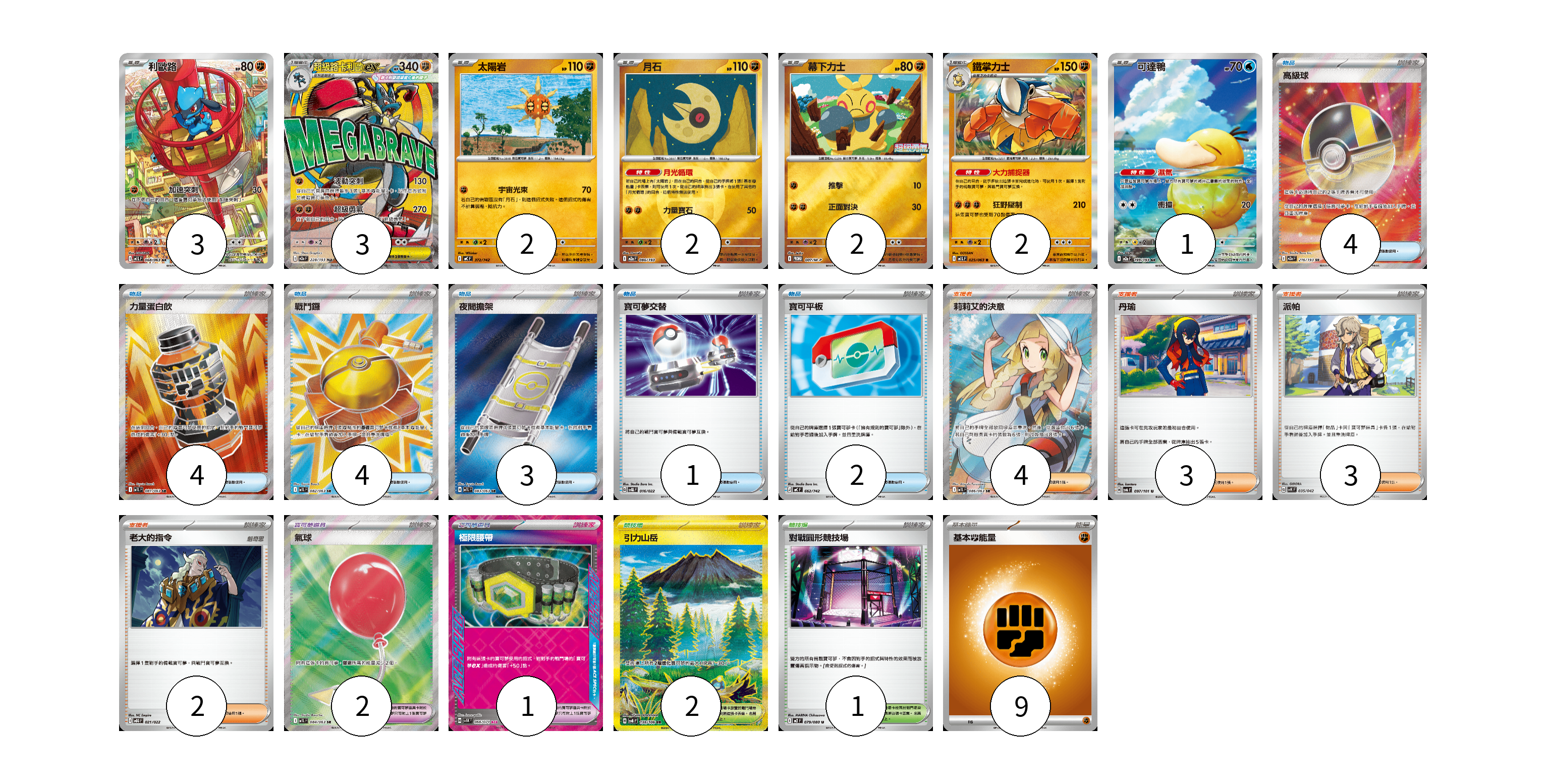 牌組構築方案 以此牌組為基礎新構築牌組 顯示卡面 顯示列表 寶可夢卡(15) 3 3 2 2 2 2 1 寶可夢道具(3) 2 1 物品卡(18) 4 4 4 3 1 2 支援者卡(12) 4 3 3 2 競技場卡(3) 2 1 能量卡(9) 9 寶可夢卡(15) 卡牌名稱 張數 卡牌名稱 張數 利歐路 M1L 068/063 03 超級路卡利歐ex M2a 228/193 03 太陽岩 MC 372/742 02 月石 M2a 086/193 02 幕下力士 M-P 007/M-P 02 鐵掌力士 M1L 025/063 02 可達鴨 M2a 199/193 01 寶可夢道具(3) 卡牌名稱 張數 卡牌名稱 張數 氣球 M1L 084/063 02 極限腰帶 SV5K 066/071 01 物品卡(18) 卡牌名稱 張數 卡牌名稱 張數 高級球 M2a 216/193 04 力量蛋白飲 M1L 081/063 04 戰鬥鑼 M1L 082/063 04 夜間擔架 M1L 083/063 03 寶可夢交替 SVQL 016/022 01 寶可平板 MC 662/742 02 支援者卡(12) 卡牌名稱 張數 卡牌名稱 張數 莉莉艾的決意 M1L 086/063 04 丹瑜 SV6 097/101 03 派帕 SVK 035/042 03 老大的指令 MBG 021/022 02 競技場卡(3) 卡牌名稱 張數 卡牌名稱 張數 引力山岳 SV8 138/106 02 對戰圓形競技場 M2 079/080 01 能量卡(9) 卡牌名稱 張數 卡牌名稱 張數 基本【鬥】能量 MC FIG 09 以此牌組為基礎新構築牌組 牌組編碼 rcRtth-KnwHYx-rQGPbG copy 列印牌組單 牌組編碼已複製 分享至SNS