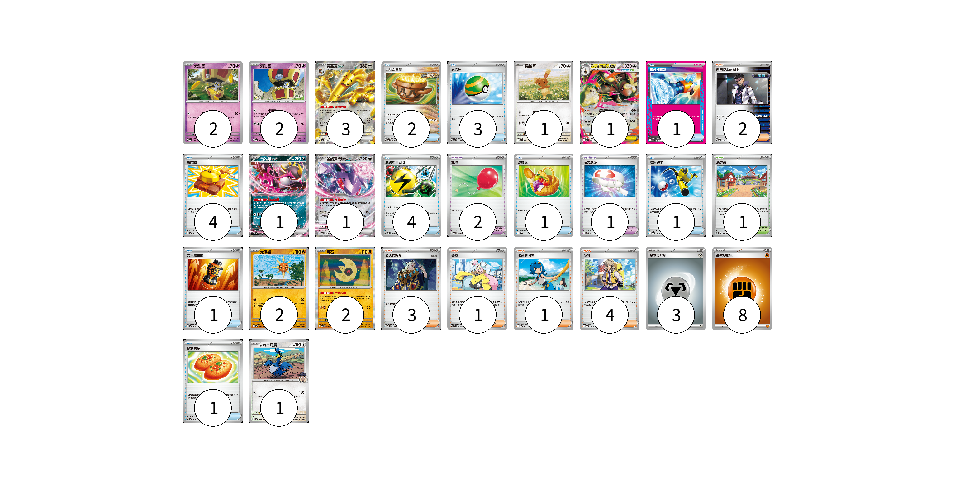 牌組構築方案 以此牌組為基礎新構築牌組 顯示卡面 顯示列表 寶可夢卡(16) 2 2 3 1 1 1 1 2 2 1 寶可夢道具(3) 2 1 物品卡(18) 2 3 1 4 4 1 1 1 1 支援者卡(11) 2 3 1 1 4 競技場卡(1) 1 能量卡(11) 3 8 寶可夢卡(16) 卡牌名稱 張數 卡牌名稱 張數 索財靈 SV8a 073/187 02 索財靈 SV7a 024/064 02 賽富豪ex SV8a 117/187 03 捲捲耳 M2 071/080 01 超級長耳兔ex M2 072/080 01 吉雉雞ex M2a 114/193 01 蓋諾賽克特ex M2a 119/193 01 太陽岩 M2a 087/193 02 月石 M2a 086/193 02 赫普的古月鳥 M2a 143/193 01 寶可夢道具(3) 卡牌名稱 張數 卡牌名稱 張數 氣球 M2a 165/193 02 活力頭帶 SVAW 019/023 01 物品卡(18) 卡牌名稱 張數 卡牌名稱 張數 大地之容器 SV8a 143/187 02 巢穴球 SVM 133/175 03 頂尖捕捉器 MBG 014/022 01 戰鬥鑼 M2a 155/193 04 超級能量回收 SV8a 141/187 04 野餐籃 SV1V 071/078 01 厲害釣竿 SVOD 010/020 01 力量蛋白飲 M2a 154/193 01 好友寶芬 M2a 153/193 01 支援者卡(11) 卡牌名稱 張數 卡牌名稱 張數 弗圖博士的劇本 SV8a 175/187 02 老大的指令 MBD 020/022 03 奇樹 SVTG 017/019 01 水蓮的照顧 SV8a 168/187 01 派帕 SVOD 018/020 04 競技場卡(1) 卡牌名稱 張數 卡牌名稱 張數 深缽鎮 SV4a 185/190 01 能量卡(11) 卡牌名稱 張數 卡牌名稱 張數 基本【鋼】能量 SVTH MET 03 基本【鬥】能量 M-P FIG 08 以此牌組為基礎新構築牌組 牌組編碼 rdbdaB-RFQdGY-RPQnHN copy 列印牌組單 牌組編碼已複製 分享至SNS