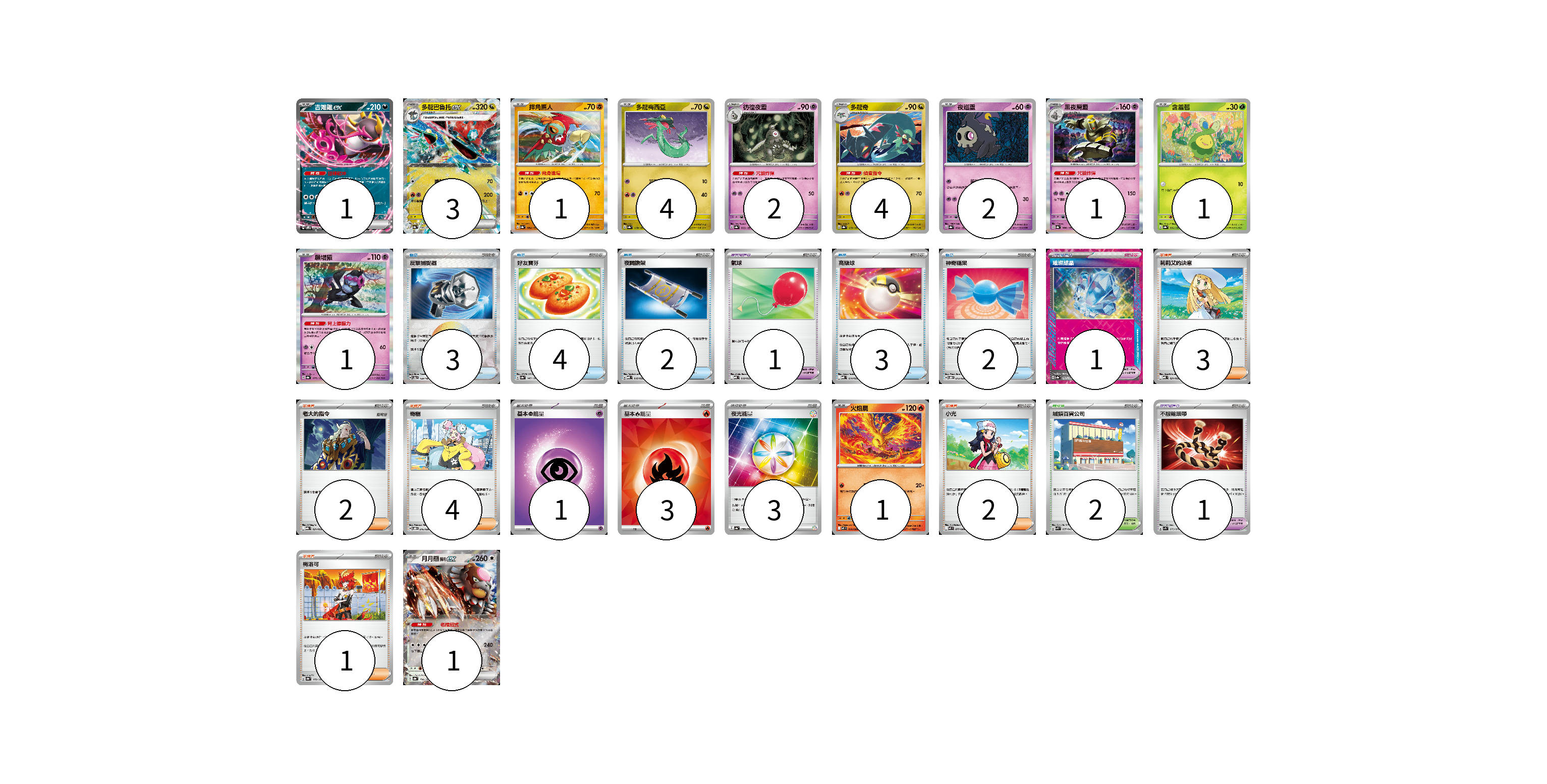 牌組構築方案 以此牌組為基礎新構築牌組 顯示卡面 顯示列表 寶可夢卡(22) 1 3 1 4 2 4 2 1 1 1 1 1 寶可夢道具(2) 1 1 物品卡(15) 3 4 2 1 3 2 支援者卡(12) 3 2 4 2 1 競技場卡(2) 2 能量卡(7) 1 3 3 寶可夢卡(22) 卡牌名稱 張數 卡牌名稱 張數 吉雉雞ex SVOM 009/021 01 多龍巴魯托ex SV8a 120/187 03 摔角鷹人 SV8a 084/187 01 多龍梅西亞 SV8a 118/187 04 彷徨夜靈 SV8a 065/187 02 多龍奇 SV8a 119/187 04 夜巡靈 SV8a 064/187 02 黑夜魔靈 SV8a 066/187 01 含羞苞 SV8a 001/187 01 願增猿 SV8a 075/187 01 火焰鳥 M2 014/080 01 月月熊 赫月ex SV8a 134/187 01 寶可夢道具(2) 卡牌名稱 張數 卡牌名稱 張數 璀璨結晶 SV8a 152/187 01 不服輸頭帶 SV1S 073/078 01 物品卡(15) 卡牌名稱 張數 卡牌名稱 張數 反擊捕捉器 SV8a 139/187 03 好友寶芬 SV8a 147/187 04 夜間擔架 MBD 016/022 02 氣球 MBD 018/022 01 高級球 MBD 014/022 03 神奇糖果 SVOD 013/020 02 支援者卡(12) 卡牌名稱 張數 卡牌名稱 張數 莉莉艾的決意 MBD 021/022 03 老大的指令 MBG 021/022 02 奇樹 SVOD 016/020 04 小光 M2 077/080 02 梅洛可 SV8a 179/187 01 競技場卡(2) 卡牌名稱 張數 卡牌名稱 張數 城鎮百貨公司 SVK 037/042 02 能量卡(7) 卡牌名稱 張數 卡牌名稱 張數 基本【超】能量 MBD PSY 01 基本【火】能量 SVQL FIR 03 夜光能量 SV4a 190/190 03 以此牌組為基礎新構築牌組 牌組編碼 riSBlY-kzzeGX-whTEVm copy 列印牌組單 牌組編碼已複製 分享至SNS