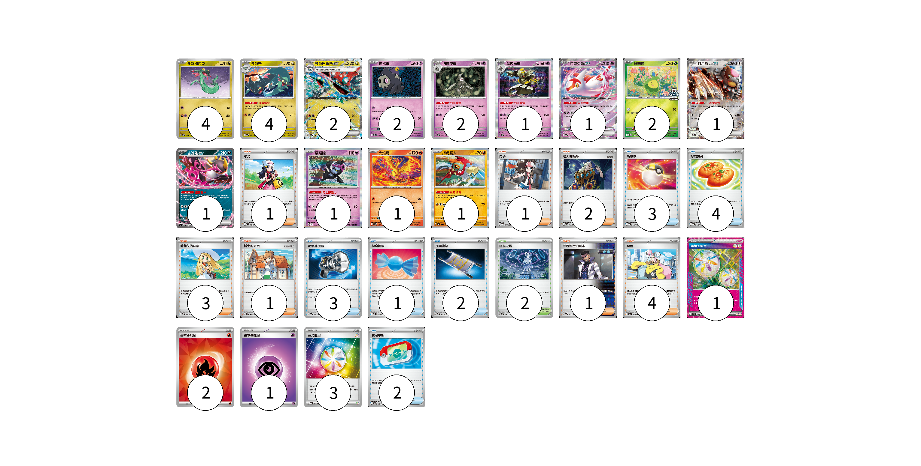 牌組構築方案 以此牌組為基礎新構築牌組 顯示卡面 顯示列表 寶可夢卡(23) 4 4 2 2 2 1 1 2 1 1 1 1 1 物品卡(15) 3 4 3 1 2 2 支援者卡(13) 1 1 2 3 1 1 4 競技場卡(2) 2 能量卡(7) 1 2 1 3 寶可夢卡(23) 卡牌名稱 張數 卡牌名稱 張數 多龍梅西亞 SV8a 118/187 04 多龍奇 SV8a 119/187 04 多龍巴魯托ex SV8a 120/187 02 夜巡靈 SV8a 064/187 02 彷徨夜靈 SV8a 065/187 02 黑夜魔靈 SV8a 066/187 01 拉帝亞斯ex SV7a 019/064 01 含羞苞 M-P 037/M-P 02 月月熊 赫月ex SV8a 134/187 01 吉雉雞ex SVOD 004/020 01 願增猿 SV6 055/101 01 火焰鳥 M2 014/080 01 摔角鷹人 SV8a 084/187 01 物品卡(15) 卡牌名稱 張數 卡牌名稱 張數 高級球 MBD 014/022 03 好友寶芬 MBD 013/022 04 反擊捕捉器 SV8a 139/187 03 神奇糖果 MBG 013/022 01 夜間擔架 MBD 016/022 02 寶可平板 MC 662/742 02 支援者卡(13) 卡牌名稱 張數 卡牌名稱 張數 小光 M2 077/080 01 鬥子 SV11W 085/086 01 老大的指令 MBD 020/022 02 莉莉艾的決意 MBD 021/022 03 博士的研究 SV11B 084/086 01 弗圖博士的劇本 SV8a 175/187 01 奇樹 SVOD 016/020 04 競技場卡(2) 卡牌名稱 張數 卡牌名稱 張數 阻礙之塔 SV8a 181/187 02 能量卡(7) 卡牌名稱 張數 卡牌名稱 張數 新衝天能量 SV5K 071/071 01 基本【火】能量 SVQL FIR 02 基本【超】能量 M-P PSY 01 夜光能量 SV4a 190/190 03 以此牌組為基礎新構築牌組 牌組編碼 roVRxk-uvnanR-GCwXJd copy 列印牌組單 牌組編碼已複製 分享至SNS