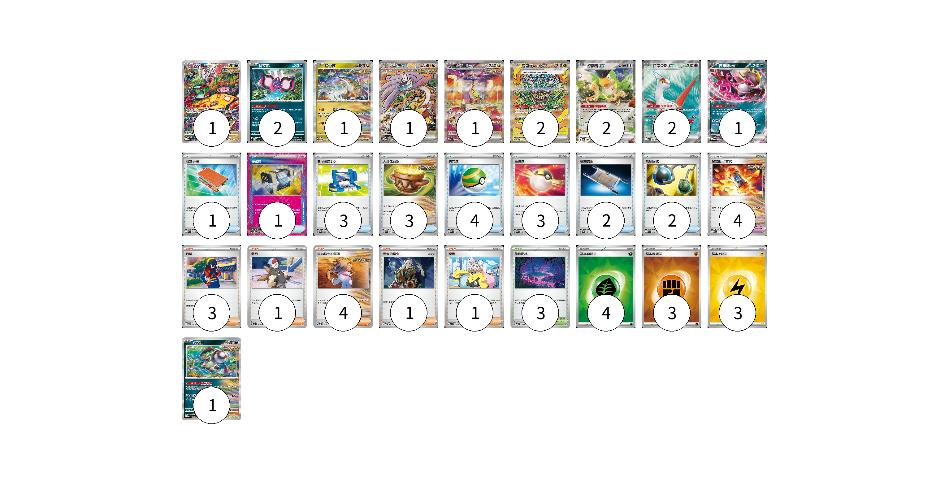 牌組構築方案 以此牌組為基礎新構築牌組 顯示卡面 顯示列表 寶可夢卡(14) 1 2 1 1 1 2 2 2 1 1 寶可夢道具(4) 4 物品卡(19) 1 1 3 3 4 3 2 2 支援者卡(10) 3 1 4 1 1 競技場卡(3) 3 能量卡(10) 4 3 3 寶可夢卡(14) 卡牌名稱 張數 卡牌名稱 張數 猛惡菇 SV4K 077/066 01 桃歹郎 SV8 075/106 02 猛雷鼓 SV7 075/102 01 猛雷鼓ex SV8a 222/187 01 猛雷鼓ex SV5K 095/071 01 厄鬼椪 碧草面具ex SV8a 201/187 02 怒鸚哥ex SV4a 154/190 02 拉帝亞斯ex SV7a 078/064 02 吉雉雞ex SV6a 038/064 01 猛惡菇 SV4K 053/066 01 寶可夢道具(4) 卡牌名稱 張數 卡牌名稱 張數 驅勁能量 古代 SV5K 065/071 04 物品卡(19) 卡牌名稱 張數 卡牌名稱 張數 朋友手冊 SVK 014/042 01 秘密箱 SV6 092/101 01 寶可裝置3.0 SVK 021/042 03 大地之容器 SVK 012/042 03 巢穴球 SVK 016/042 04 高級球 SVK 018/042 03 夜間擔架 SV8a 151/187 02 能量回收 SVM 125/175 02 支援者卡(10) 卡牌名稱 張數 卡牌名稱 張數 丹瑜 SVTR 016/021 03 牡丹 SV4a 182/190 01 奧琳博士的氣魄 SV8a 167/187 04 老大的指令 SVK 036/042 01 奇樹 SVK 031/042 01 競技場卡(3) 卡牌名稱 張數 卡牌名稱 張數 危險密林 SV5K 070/071 03 能量卡(10) 卡牌名稱 張數 卡牌名稱 張數 基本【草】能量 SVK GRA 04 基本【鬥】能量 SVK FIG 03 基本【雷】能量 SVK LIG 03 以此牌組為基礎新構築牌組 牌組編碼 sAuDXc-GCFqsR-VFaazp copy 列印牌組單 牌組編碼已複製 分享至SNS