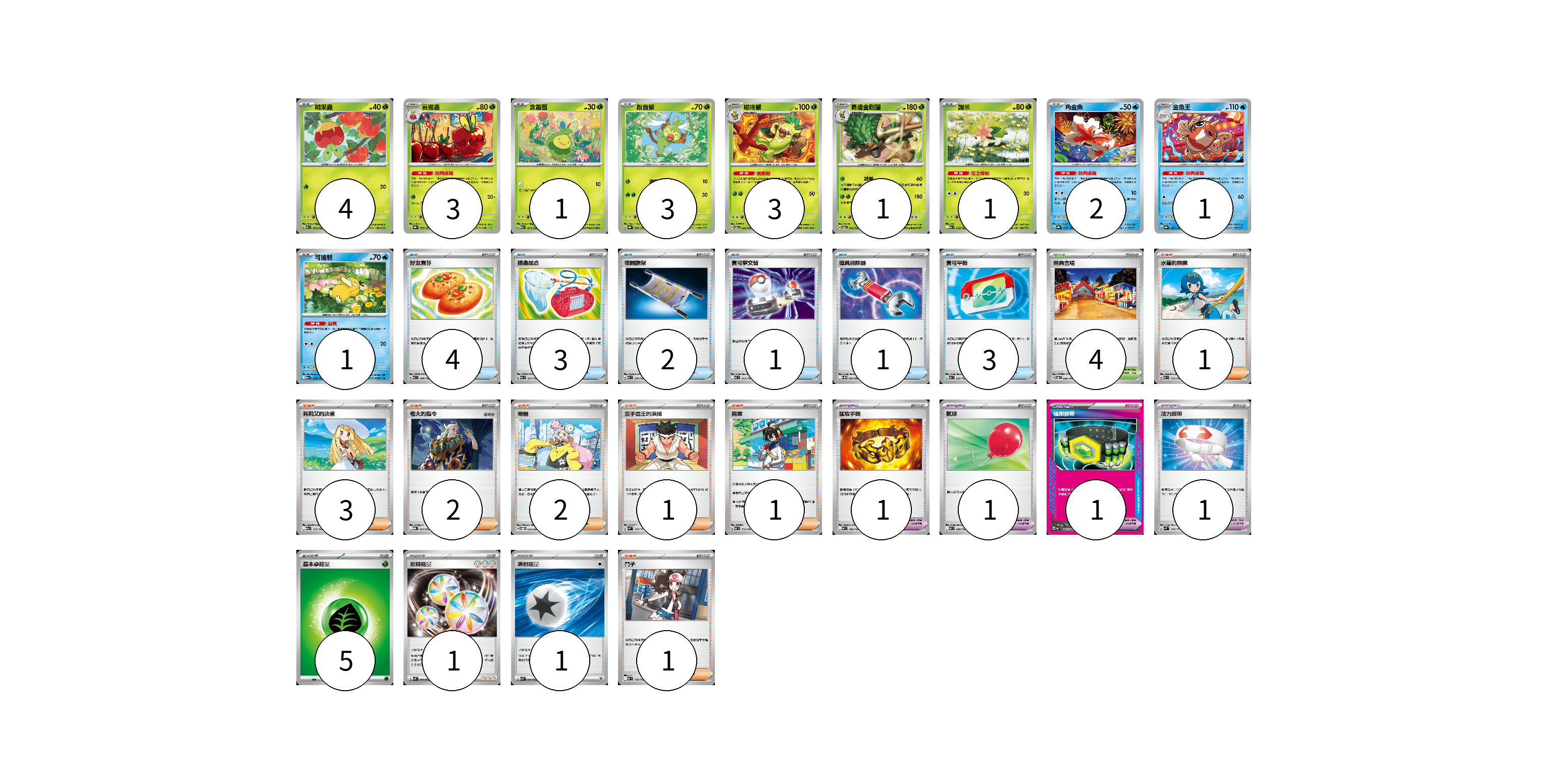 牌組構築方案 以此牌組為基礎新構築牌組 顯示卡面 顯示列表 寶可夢卡(20) 4 3 1 3 3 1 1 2 1 1 寶可夢道具(4) 1 1 1 1 物品卡(14) 4 3 2 1 1 3 支援者卡(11) 1 3 2 2 1 1 1 競技場卡(4) 4 能量卡(7) 5 1 1 寶可夢卡(20) 卡牌名稱 張數 卡牌名稱 張數 啃果蟲 MC 062/742 04 裹蜜蟲 SV8a 009/187 03 含羞苞 M2a 011/193 01 敲音猴 SV8a 006/187 03 啪咚猴 SV6 009/101 03 轟擂金剛猩 SV6 010/101 01 謝米 M2a 012/193 01 角金魚 SV8a 028/187 02 金魚王 SV8a 029/187 01 可達鴨 M2a 032/193 01 寶可夢道具(4) 卡牌名稱 張數 卡牌名稱 張數 猛攻手鐲 MC 689/742 01 氣球 MC 688/742 01 極限腰帶 MC 691/742 01 活力頭帶 SVM 140/175 01 物品卡(14) 卡牌名稱 張數 卡牌名稱 張數 好友寶芬 MC 648/742 04 捕蟲組合 MC 667/742 03 夜間擔架 MC 670/742 02 寶可夢交替 MC 663/742 01 道具拆除器 SV11W 080/086 01 寶可平板 MC 662/742 03 支援者卡(11) 卡牌名稱 張數 卡牌名稱 張數 水蓮的照顧 MC 712/742 01 莉莉艾的決意 M2a 175/193 03 老大的指令 MBG 021/022 02 奇樹 SVOD 016/020 02 空手道王的演練 SVM 143/175 01 烏栗 MC 713/742 01 鬥子 MC 718/742 01 競技場卡(4) 卡牌名稱 張數 卡牌名稱 張數 祭典會場 SV6 099/101 04 能量卡(7) 卡牌名稱 張數 卡牌名稱 張數 基本【草】能量 MC GRA 05 反轉能量 SVK 041/042 01 噴射能量 SVK 040/042 01 以此牌組為基礎新構築牌組 牌組編碼 sCMPNx-EOYjZX-cGTHtl copy 列印牌組單 牌組編碼已複製 分享至SNS