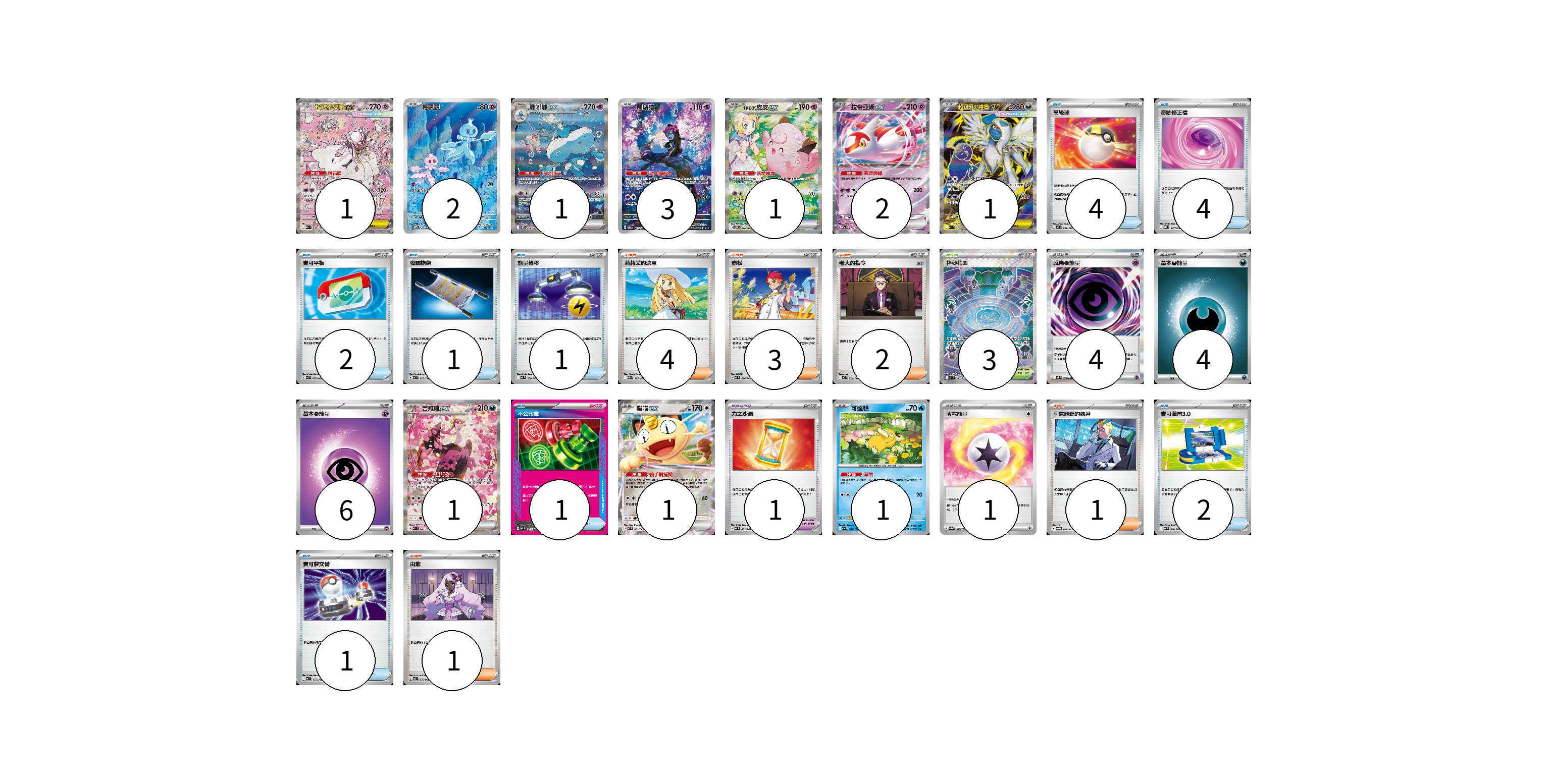 牌組構築方案 以此牌組為基礎新構築牌組 顯示卡面 顯示列表 寶可夢卡(14) 1 2 1 3 1 2 1 1 1 1 寶可夢道具(1) 1 物品卡(16) 4 4 2 1 1 1 2 1 支援者卡(11) 4 3 2 1 1 競技場卡(3) 3 能量卡(15) 4 4 6 1 寶可夢卡(14) 卡牌名稱 張數 卡牌名稱 張數 超級蒂安希ex M2a 238/193 01 輕飄飄 SV11W 124/086 02 胖嘟嘟ex SV11W 170/086 01 願增猿 SV6 107/101 03 莉莉艾的皮皮ex SV9 126/100 01 拉帝亞斯ex M2a 075/193 02 超級阿勃梭魯ex M1L 079/063 01 吉雉雞ex M2a 244/193 01 喵喵ex M3 061/080 01 可達鴨 M2a 032/193 01 寶可夢道具(1) 卡牌名稱 張數 卡牌名稱 張數 力之沙漏 MC 683/742 01 物品卡(16) 卡牌名稱 張數 卡牌名稱 張數 高級球 MC 651/742 04 奇跡修正檔 MBD 017/022 04 寶可平板 M3 070/080 02 夜間擔架 MC 670/742 01 能量轉移 MC 638/742 01 不公印章 MC 633/742 01 寶可裝置3.0 MC 660/742 02 寶可夢交替 MC 663/742 01 支援者卡(11) 卡牌名稱 張數 卡牌名稱 張數 莉莉艾的決意 M2a 175/193 04 赤松 MC 696/742 03 老大的指令 MC 724/742 02 阿克羅瑪的執著 SVOM 017/021 01 由紫 M3 076/080 01 競技場卡(3) 卡牌名稱 張數 卡牌名稱 張數 神秘花園 M1S 086/063 03 能量卡(15) 卡牌名稱 張數 卡牌名稱 張數 感應【超】能量 M3 079/080 04 基本【惡】能量 MC DAR 04 基本【超】能量 MC PSY 06 薄霧能量 SV8a 186/187 01 以此牌組為基礎新構築牌組 牌組編碼 sCzVko-tyWyaM-zRNhQk copy 列印牌組單 牌組編碼已複製 分享至SNS