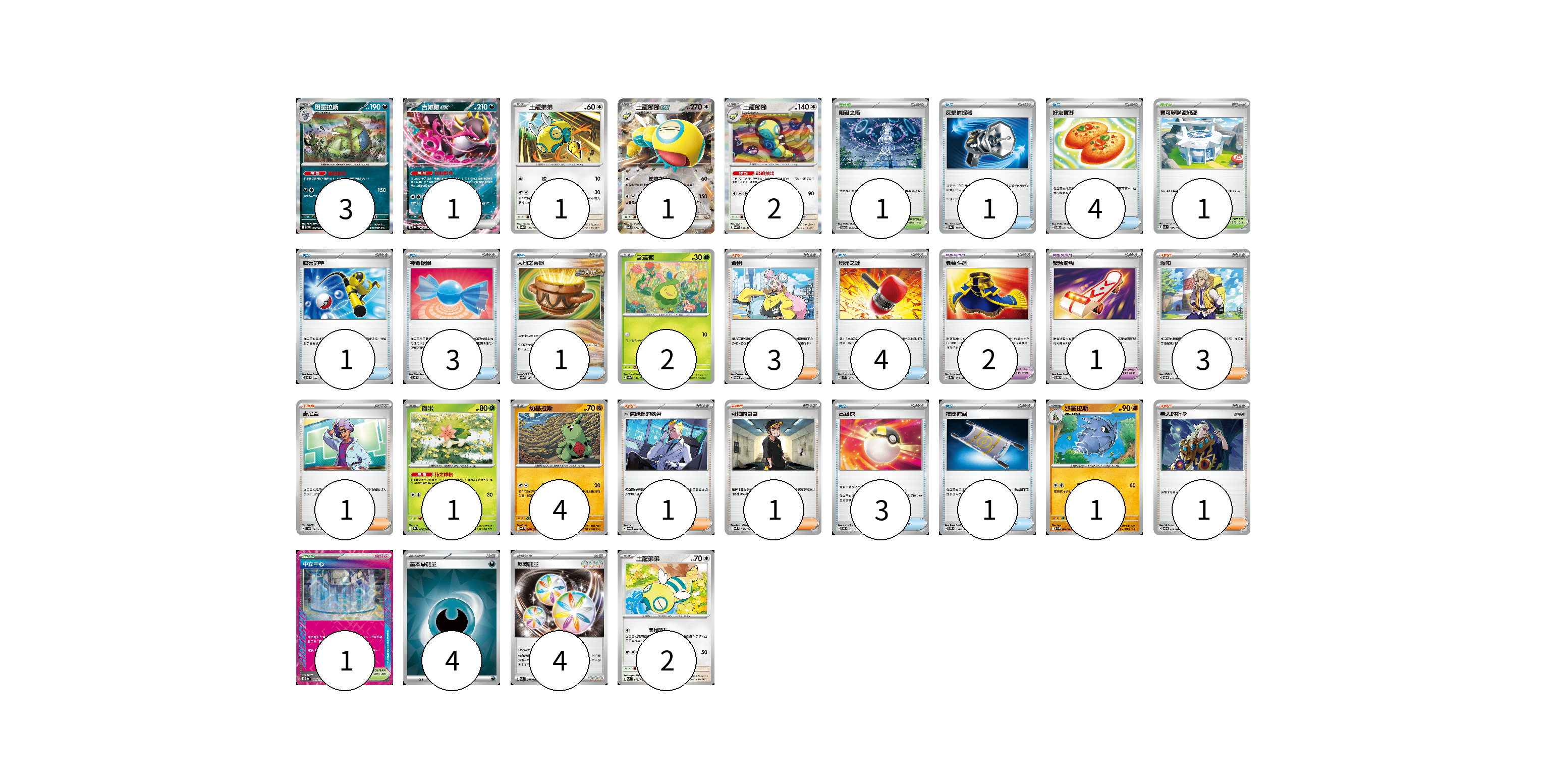 牌組構築方案 以此牌組為基礎新構築牌組 顯示卡面 顯示列表 寶可夢卡(18) 3 1 1 1 2 2 1 4 1 2 寶可夢道具(3) 2 1 物品卡(18) 1 4 1 3 1 4 3 1 支援者卡(10) 3 3 1 1 1 1 競技場卡(3) 1 1 1 能量卡(8) 4 4 寶可夢卡(18) 卡牌名稱 張數 卡牌名稱 張數 班基拉斯 SV9 058/100 03 吉雉雞ex SV8a 104/187 01 土龍弟弟 SV8a 129/187 01 土龍節節ex SV9 079/100 01 土龍節節 SV5K 057/071 02 含羞苞 SV8a 001/187 02 謝米 SV9a 006/063 01 幼基拉斯 SV9 047/100 04 沙基拉斯 SV9 048/100 01 土龍弟弟 SVM 095/175 02 寶可夢道具(3) 卡牌名稱 張數 卡牌名稱 張數 豪華斗篷 SV8a 155/187 02 緊急滑板 SVOD 015/020 01 物品卡(18) 卡牌名稱 張數 卡牌名稱 張數 反擊捕捉器 SV8a 139/187 01 好友寶芬 SVOD 011/020 04 厲害釣竿 SVOD 010/020 01 神奇糖果 SVOD 013/020 03 大地之容器 SV8a 143/187 01 粉碎之錘 SVM 131/175 04 高級球 SVOD 012/020 03 夜間擔架 SVOM 016/021 01 支援者卡(10) 卡牌名稱 張數 卡牌名稱 張數 奇樹 SVOD 016/020 03 派帕 SVOD 018/020 03 吉尼亞 SVD 129/139 01 阿克羅瑪的執著 SVOM 017/021 01 可怕的哥哥 SV9 095/100 01 老大的指令 SVOD 019/020 01 競技場卡(3) 卡牌名稱 張數 卡牌名稱 張數 阻礙之塔 SV6 100/101 01 寶可夢聯盟總部 SV3 108/108 01 中立中心 SV8a 184/187 01 能量卡(8) 卡牌名稱 張數 卡牌名稱 張數 基本【惡】能量 SVOM DAR 04 反轉能量 SVK 041/042 04 以此牌組為基礎新構築牌組 牌組編碼 sDZVQE-zAJIOv-wspvBY copy 列印牌組單 牌組編碼已複製 分享至SNS