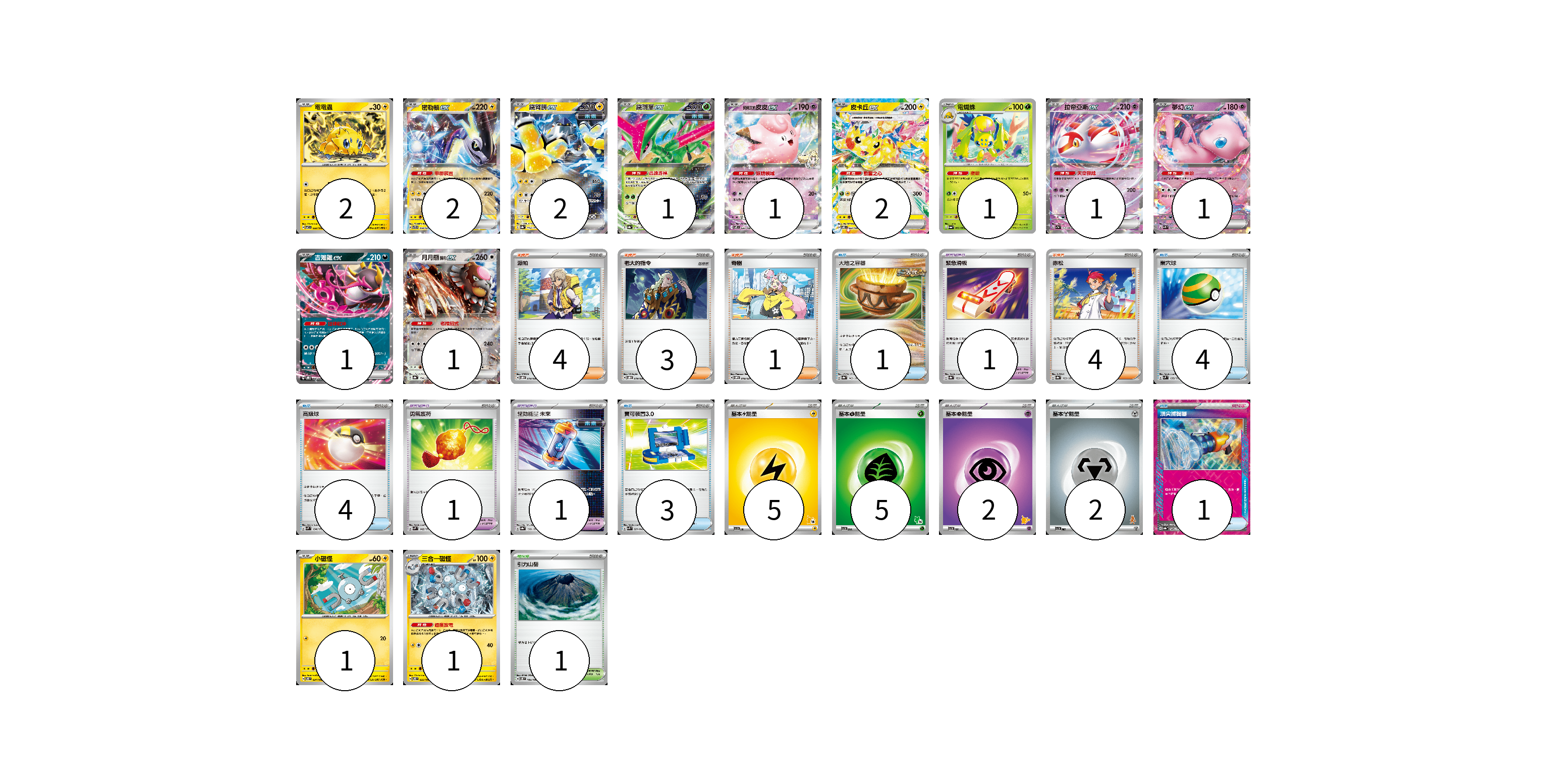 牌組構築方案 以此牌組為基礎新構築牌組 顯示卡面 顯示列表 寶可夢卡(17) 2 2 2 1 1 2 1 1 1 1 1 1 1 寶可夢道具(3) 1 1 1 物品卡(13) 1 4 4 3 1 支援者卡(12) 4 3 1 4 競技場卡(1) 1 能量卡(14) 5 5 2 2 寶可夢卡(17) 卡牌名稱 張數 卡牌名稱 張數 電電蟲 SV7 032/102 02 密勒頓ex SVTR 008/021 02 鐵臂膀ex SV8a 054/187 02 鐵斑葉ex SV8a 016/187 01 莉莉艾的皮皮ex SV9 033/100 01 皮卡丘ex SV8 033/106 02 電蜘蛛 SV6a 002/064 01 拉帝亞斯ex SV7a 019/064 01 夢幻ex SVK 001/042 01 吉雉雞ex SVOD 004/020 01 月月熊 赫月ex SV8a 134/187 01 小磁怪 SV8 034/106 01 三合一磁怪 SV8 035/106 01 寶可夢道具(3) 卡牌名稱 張數 卡牌名稱 張數 緊急滑板 SV8a 153/187 01 勇氣護符 SVM 142/175 01 驅勁能量 未來 SV8a 158/187 01 物品卡(13) 卡牌名稱 張數 卡牌名稱 張數 大地之容器 SV8a 143/187 01 巢穴球 SVM 133/175 04 高級球 SVM 134/175 04 寶可裝置3.0 SVK 021/042 03 頂尖捕捉器 SV8a 148/187 01 支援者卡(12) 卡牌名稱 張數 卡牌名稱 張數 派帕 SVOD 018/020 04 老大的指令 SVOD 019/020 03 奇樹 SVOM 018/021 01 赤松 SV8a 163/187 04 競技場卡(1) 卡牌名稱 張數 卡牌名稱 張數 引力山岳 SV8 106/106 01 能量卡(14) 卡牌名稱 張數 卡牌名稱 張數 基本【雷】能量 SVI LIG 05 基本【草】能量 SVI GRA 05 基本【超】能量 SVI PSY 02 基本【鋼】能量 SVI MET 02 以此牌組為基礎新構築牌組 牌組編碼 sEAFXO-ooPdyh-NgOONp copy 列印牌組單 牌組編碼已複製 分享至SNS