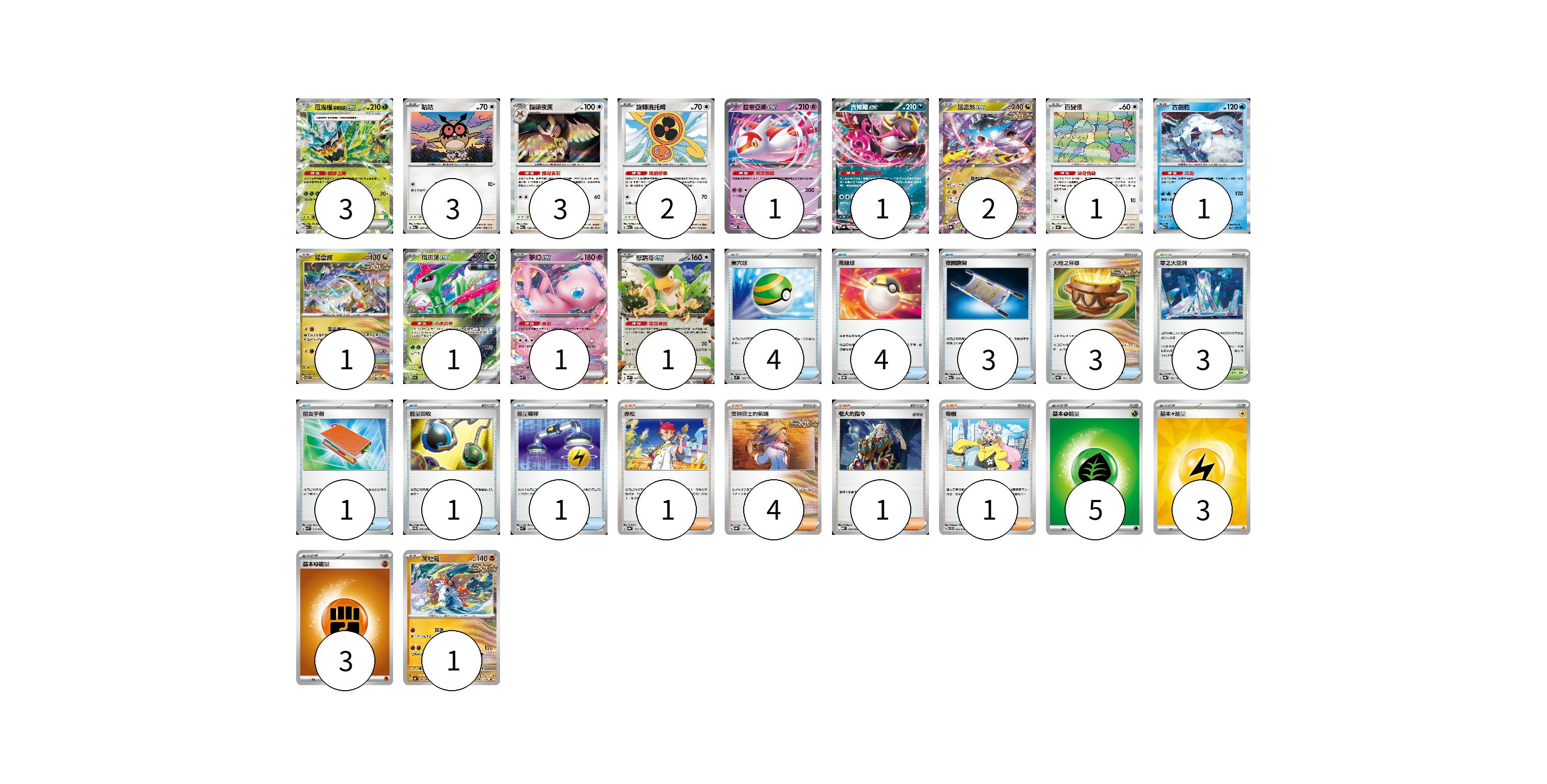 牌組構築方案 以此牌組為基礎新構築牌組 顯示卡面 顯示列表 寶可夢卡(22) 3 3 3 2 1 1 2 1 1 1 1 1 1 1 物品卡(17) 4 4 3 3 1 1 1 支援者卡(7) 1 4 1 1 競技場卡(3) 3 能量卡(11) 5 3 3 寶可夢卡(22) 卡牌名稱 張數 卡牌名稱 張數 厄鬼椪 碧草面具ex M2a 017/193 03 咕咕 M2a 137/193 03 貓頭夜鷹 M2a 138/193 03 旋轉洛托姆 M2a 139/193 02 拉帝亞斯ex MBD 003/022 01 吉雉雞ex SV8a 104/187 01 猛雷鼓ex SV8a 124/187 02 百變怪 SV4a 144/190 01 古劍豹 M2a 043/193 01 猛雷鼓 SV7 075/102 01 鐵斑葉ex SV5M 016/071 01 夢幻ex SVK 001/042 01 怒鸚哥ex SVK 006/042 01 爬地翅 SV4K 041/066 01 物品卡(17) 卡牌名稱 張數 卡牌名稱 張數 巢穴球 SVM 133/175 04 高級球 SVQP 015/023 04 夜間擔架 M2a 159/193 03 大地之容器 SV8a 143/187 03 朋友手冊 SVK 014/042 01 能量回收 SV11W 079/086 01 能量轉移 SVM 127/175 01 支援者卡(7) 卡牌名稱 張數 卡牌名稱 張數 赤松 SV8a 163/187 01 奧琳博士的氣魄 SV8a 167/187 04 老大的指令 MBD 020/022 01 奇樹 SVTH 015/018 01 競技場卡(3) 卡牌名稱 張數 卡牌名稱 張數 零之大空洞 SV8a 182/187 03 能量卡(11) 卡牌名稱 張數 卡牌名稱 張數 基本【草】能量 M-P GRA 05 基本【雷】能量 SVQP LIG 03 基本【鬥】能量 M-P FIG 03 以此牌組為基礎新構築牌組 牌組編碼 sExudJ-hbspfO-gZUSVV copy 列印牌組單 牌組編碼已複製 分享至SNS