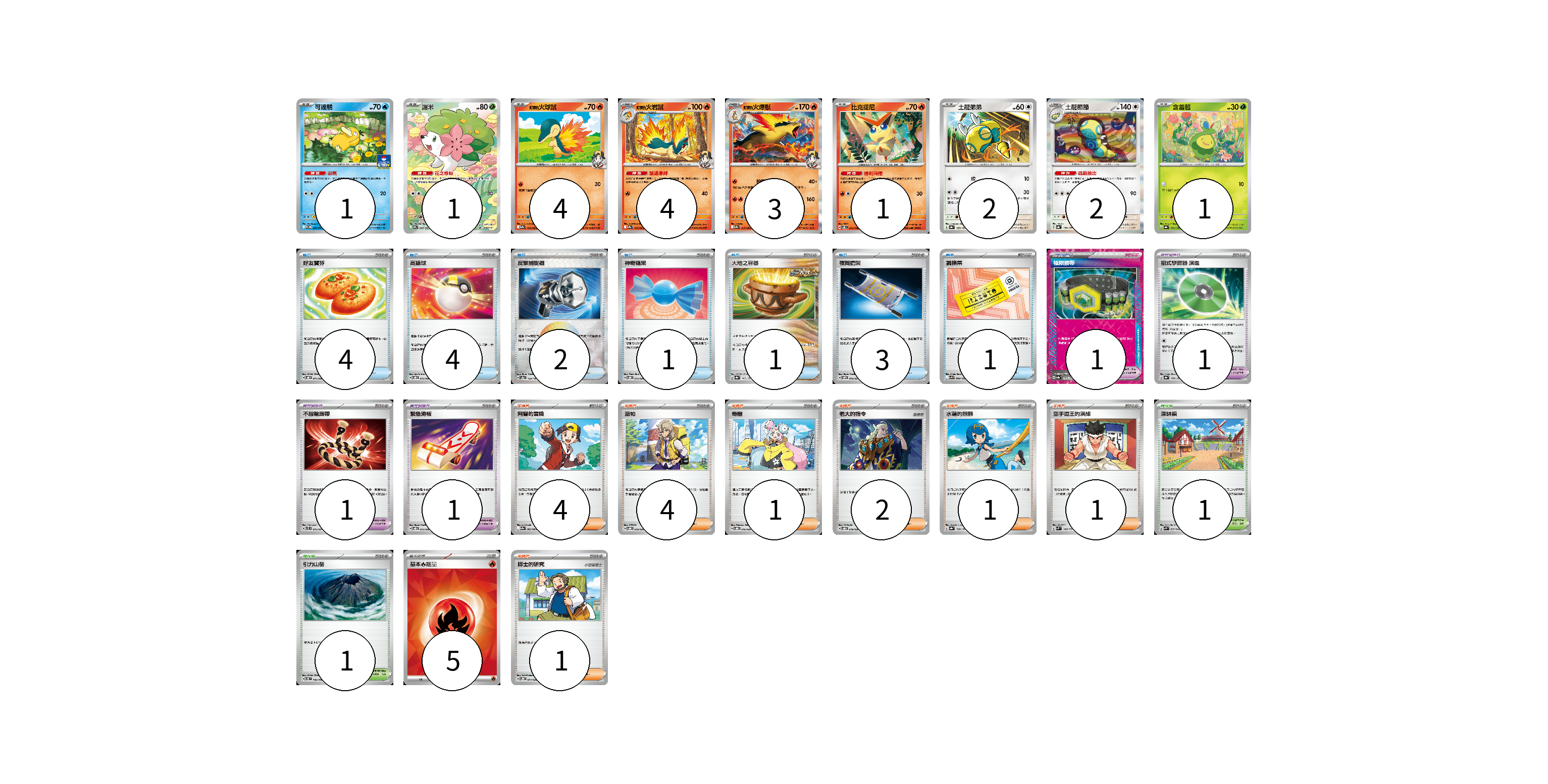 牌組構築方案 以此牌組為基礎新構築牌組 顯示卡面 顯示列表 寶可夢卡(19) 1 1 4 4 3 1 2 2 1 寶可夢道具(4) 1 1 1 1 物品卡(16) 4 4 2 1 1 3 1 支援者卡(14) 4 4 1 2 1 1 1 競技場卡(2) 1 1 能量卡(5) 5 寶可夢卡(19) 卡牌名稱 張數 卡牌名稱 張數 可達鴨 SV-P 220/SV-P 01 謝米 SV9a 066/063 01 <阿響的>火球鼠 SV9a 015/063 04 <阿響的>火岩鼠 SV9a 016/063 04 <阿響的>火爆獸 SV9a 017/063 03 比克提尼 SV8 012/106 01 土龍弟弟 SV8a 129/187 02 土龍節節 SV8a 130/187 02 含羞苞 SV8a 001/187 01 寶可夢道具(4) 卡牌名稱 張數 卡牌名稱 張數 極限腰帶 SV8a 159/187 01 招式學習器 演進 SV8a 160/187 01 不服輸頭帶 SVTL 016/021 01 緊急滑板 SVOD 015/020 01 物品卡(16) 卡牌名稱 張數 卡牌名稱 張數 好友寶芬 SVOD 011/020 04 高級球 SVOD 012/020 04 反擊捕捉器 SV8a 139/187 02 神奇糖果 SVOD 013/020 01 大地之容器 SV8a 143/187 01 夜間擔架 SVOM 016/021 03 調換票 SV9 090/100 01 支援者卡(14) 卡牌名稱 張數 卡牌名稱 張數 阿響的冒險 SV9a 063/063 04 派帕 SVOD 018/020 04 奇樹 SVOD 016/020 01 老大的指令 SVOD 019/020 02 水蓮的照顧 SV8a 168/187 01 空手道王的演練 SVM 143/175 01 博士的研究 SVOD 017/020 01 競技場卡(2) 卡牌名稱 張數 卡牌名稱 張數 深缽鎮 SVK 039/042 01 引力山岳 SV8 106/106 01 能量卡(5) 卡牌名稱 張數 卡牌名稱 張數 基本【火】能量 SVK FIR 05 以此牌組為基礎新構築牌組 牌組編碼 sGgHAy-kbyKrl-OAbzXQ copy 列印牌組單 牌組編碼已複製 分享至SNS