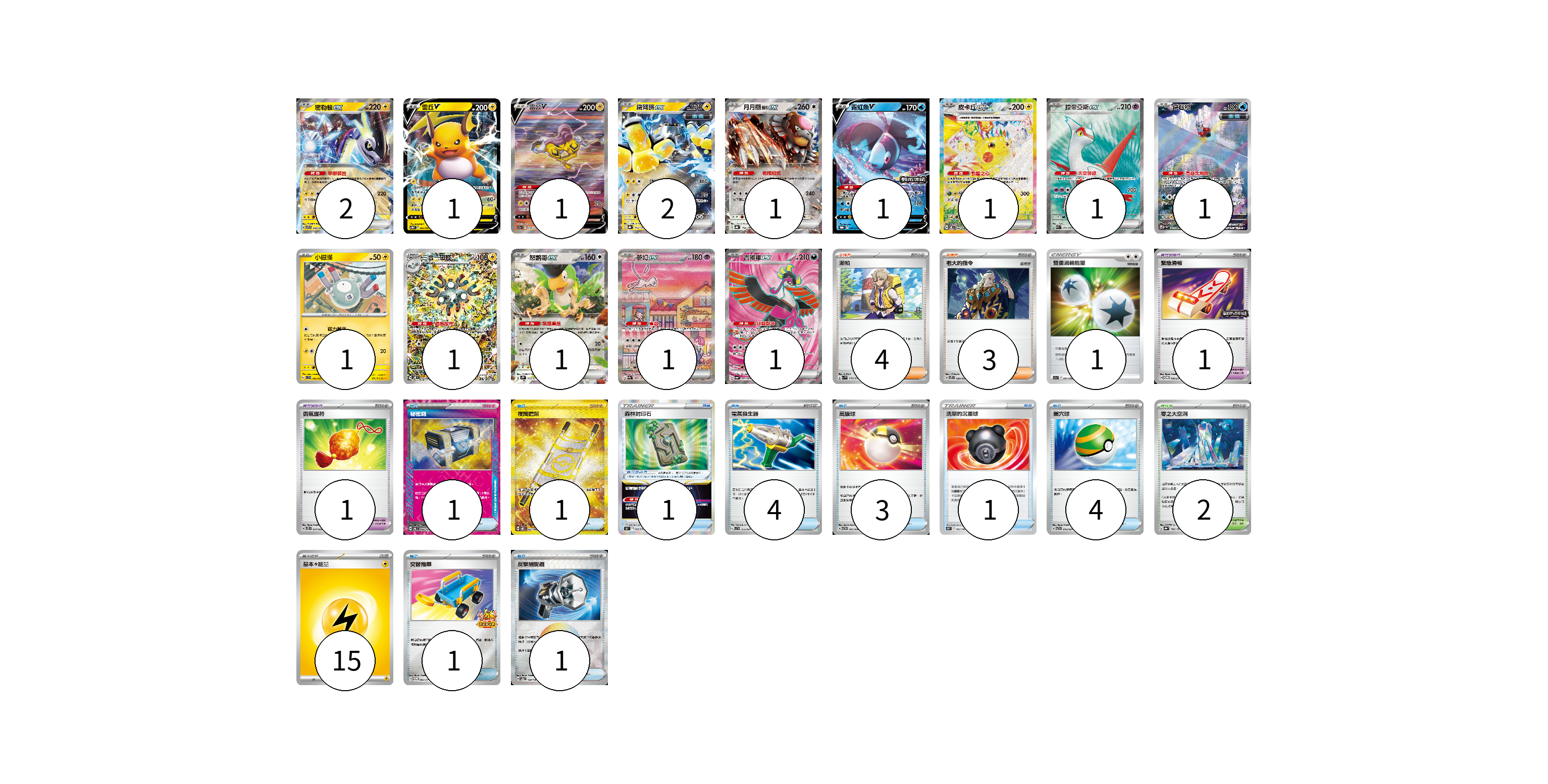 牌組構築方案 以此牌組為基礎新構築牌組 顯示卡面 顯示列表 寶可夢卡(16) 2 1 1 2 1 1 1 1 1 1 1 1 1 1 寶可夢道具(3) 1 1 1 物品卡(16) 1 1 4 3 1 4 1 1 支援者卡(7) 4 3 競技場卡(2) 2 能量卡(16) 1 15 寶可夢卡(16) 卡牌名稱 張數 卡牌名稱 張數 密勒頓ex SVTR 008/021 02 雷丘V SVTR 003/021 01 雷公V S12a 218/172 01 鐵臂膀ex SV8a 054/187 02 月月熊 赫月ex SV8a 134/187 01 霓虹魚V SV-P 134/SV-P 01 皮卡丘ex SV8 132/106 01 拉帝亞斯ex SV7a 078/064 01 鐵包袱 SV4M 071/066 01 小磁怪 SVC 002/021 01 三合一磁怪 SV8 112/106 01 怒鸚哥ex SV2P 065/071 01 夢幻ex SV2a 205/165 01 吉雉雞ex SV6a 081/064 01 寶可夢道具(3) 卡牌名稱 張數 卡牌名稱 張數 緊急滑板 SV-P 140/SV-P 01 勇氣護符 SVTS 017/022 01 森林封印石 S12 092/098 01 物品卡(16) 卡牌名稱 張數 卡牌名稱 張數 秘密箱 SV6 092/101 01 夜間擔架 SV8 137/106 01 電氣發生器 SVC 012/021 04 高級球 SVTH 011/018 03 洗翠的沉重球 S10P 062/067 01 巢穴球 SVTR 013/021 04 交替推車 SV-P 082/SV-P 01 反擊捕捉器 SV8a 139/187 01 支援者卡(7) 卡牌名稱 張數 卡牌名稱 張數 派帕 SV1V 076/078 04 老大的指令 SVTS 020/022 03 競技場卡(2) 卡牌名稱 張數 卡牌名稱 張數 零之大空洞 SV8a 182/187 02 能量卡(16) 卡牌名稱 張數 卡牌名稱 張數 雙重渦輪能量 S11a 067/068 01 基本【雷】能量 SVHM LIG 15 以此牌組為基礎新構築牌組 牌組編碼 sGlfql-oKLwDv-HGuOHN copy 列印牌組單 牌組編碼已複製 分享至SNS