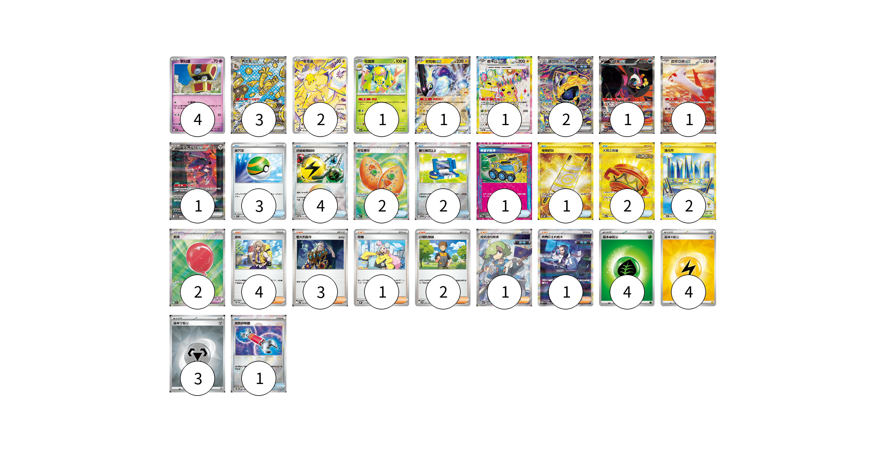牌組構築方案 以此牌組為基礎新構築牌組 顯示卡面 顯示列表 寶可夢卡(17) 4 3 2 1 1 1 2 1 1 1 寶可夢道具(2) 2 物品卡(16) 3 4 2 2 1 1 2 1 支援者卡(12) 4 3 1 2 1 1 競技場卡(2) 2 能量卡(11) 4 4 3 寶可夢卡(17) 卡牌名稱 張數 卡牌名稱 張數 索財靈 SV7a 024/064 04 賽富豪ex SV8a 220/187 03 電電蟲 SV7 108/102 02 電蜘蛛 SV6a 002/064 01 密勒頓ex SV-P 164/SV-P 01 皮卡丘ex SV8 122/106 01 鐵臂膀ex SV8a 210/187 02 吉雉雞ex SV6a 089/064 01 拉帝亞斯ex SV7a 087/064 01 蓋諾賽克特ex SV11B 172/086 01 寶可夢道具(2) 卡牌名稱 張數 卡牌名稱 張數 氣球 M1L 084/063 02 物品卡(16) 卡牌名稱 張數 卡牌名稱 張數 巢穴球 SVAW 014/023 03 超級能量回收 SV8a 141/187 04 好友寶芬 M1S 081/063 02 寶可裝置3.0 SV11B 081/086 02 貴重手推車 SVK 020/042 01 夜間擔架 SV8 137/106 01 大地之容器 SV6a 093/064 02 道具拆除器 SV11W 080/086 01 支援者卡(12) 卡牌名稱 張數 卡牌名稱 張數 派帕 SVOD 018/020 04 老大的指令 MBD 020/022 03 奇樹 SVHK 019/022 01 小剛的發掘 SV9 096/100 02 暗碼迷的解讀 SV5M 090/071 01 弗圖博士的劇本 SV4M 091/066 01 競技場卡(2) 卡牌名稱 張數 卡牌名稱 張數 釀光市 SV9a 092/063 02 能量卡(11) 卡牌名稱 張數 卡牌名稱 張數 基本【草】能量 M-P GRA 04 基本【雷】能量 SVQP LIG 04 基本【鋼】能量 SVOD MET 03 以此牌組為基礎新構築牌組 牌組編碼 sIZlnN-hGwgmy-DFCdsO copy 列印牌組單 牌組編碼已複製 分享至SNS