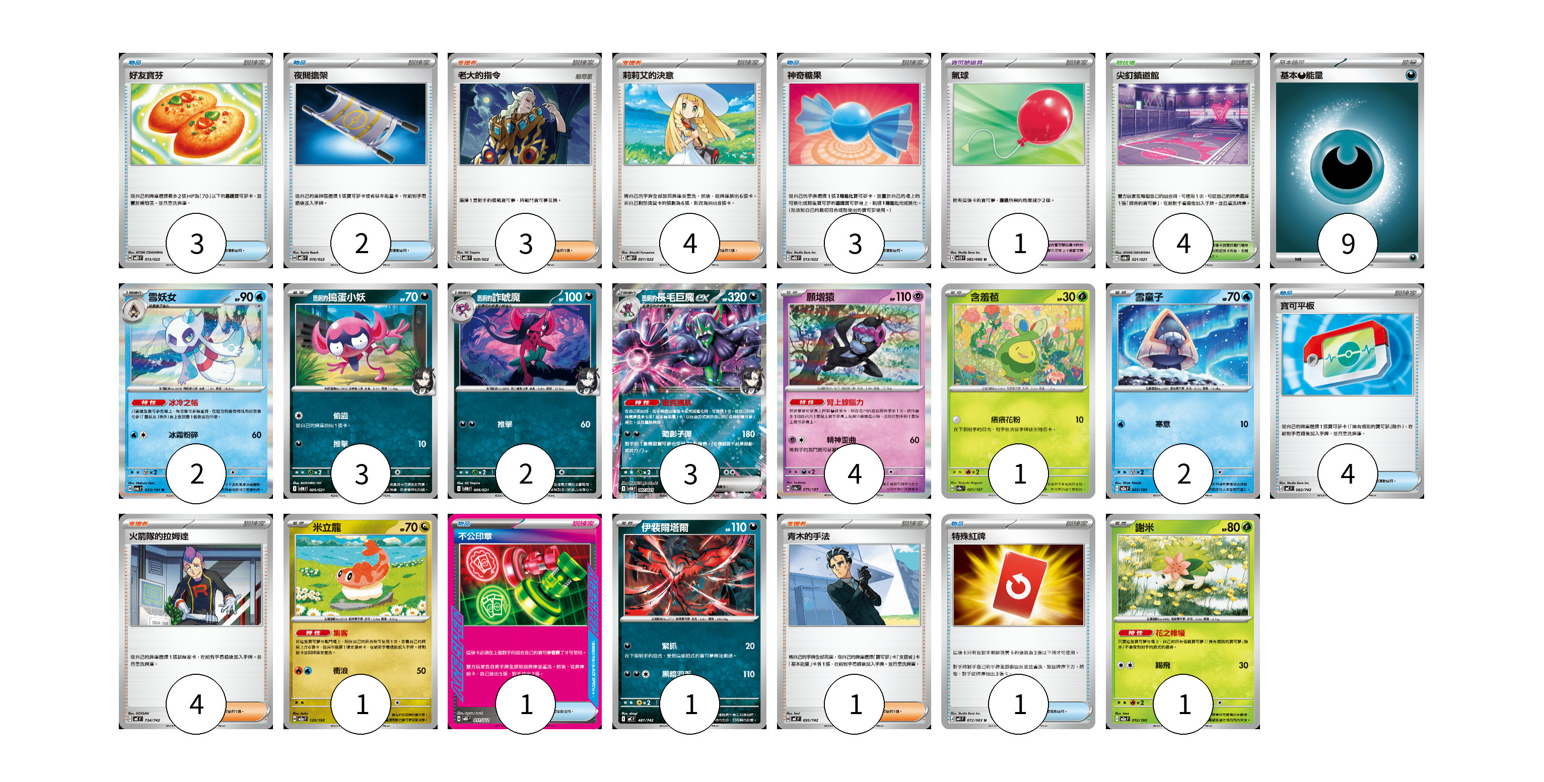 牌組構築方案 以此牌組為基礎新構築牌組 顯示卡面 顯示列表 寶可夢卡(20) 2 3 2 3 4 1 2 1 1 1 寶可夢道具(1) 1 物品卡(14) 3 2 3 4 1 1 支援者卡(12) 3 4 4 1 競技場卡(4) 4 能量卡(9) 9 寶可夢卡(20) 卡牌名稱 張數 卡牌名稱 張數 雪妖女 SV6 033/101 02 <瑪俐的>搗蛋小妖 SVOM 005/021 03 <瑪俐的>詐唬魔 SVOM 006/021 02 <瑪俐的>長毛巨魔ex SVOM 007/021 03 願增猿 SV8a 075/187 04 含羞苞 SV8a 001/187 01 雪童子 M2a 035/193 02 米立龍 M2a 135/193 01 伊裴爾塔爾 MC 481/742 01 謝米 M2a 012/193 01 寶可夢道具(1) 卡牌名稱 張數 卡牌名稱 張數 氣球 SV11B 082/086 01 物品卡(14) 卡牌名稱 張數 卡牌名稱 張數 好友寶芬 MBD 013/022 03 夜間擔架 MBD 016/022 02 神奇糖果 MBG 013/022 03 寶可平板 MC 662/742 04 不公印章 MBD 011/022 01 特殊紅牌 M4 072/083 01 支援者卡(12) 卡牌名稱 張數 卡牌名稱 張數 老大的指令 MBD 020/022 03 莉莉艾的決意 MBD 021/022 04 火箭隊的拉姆達 MC 734/742 04 青木的手法 MC 695/742 01 競技場卡(4) 卡牌名稱 張數 卡牌名稱 張數 尖釘鎮道館 SVOM 021/021 04 能量卡(9) 卡牌名稱 張數 卡牌名稱 張數 基本【惡】能量 MBG DAR 09 以此牌組為基礎新構築牌組 牌組編碼 sJRTKp-MkRRvP-fxwUaU copy 列印牌組單 牌組編碼已複製 分享至SNS