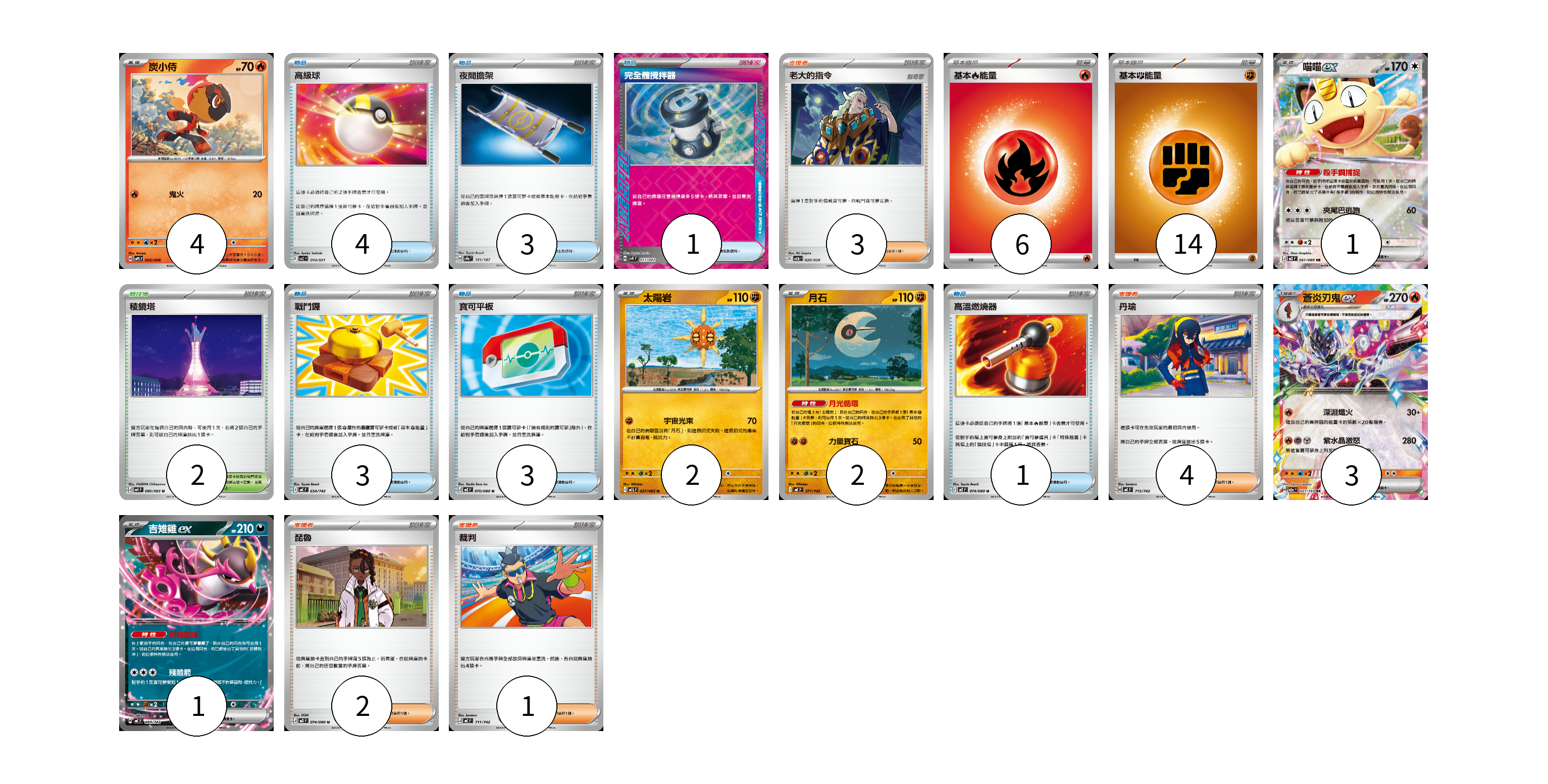 牌組構築方案 以此牌組為基礎新構築牌組 顯示卡面 顯示列表 寶可夢卡(13) 4 1 2 2 3 1 物品卡(15) 4 3 1 3 3 1 支援者卡(10) 3 4 2 1 競技場卡(2) 2 能量卡(20) 6 14 寶可夢卡(13) 卡牌名稱 張數 卡牌名稱 張數 炭小侍 SVPS 005/008 04 喵喵ex M3 061/080 01 太陽岩 M1L 027/063 02 月石 MC 371/742 02 蒼炎刃鬼ex M2a 031/193 03 吉雉雞ex MC 489/742 01 物品卡(15) 卡牌名稱 張數 卡牌名稱 張數 高級球 SVC 014/021 04 夜間擔架 SV8a 151/187 03 完全體攪拌器 SVK 017/042 01 戰鬥鑼 MC 654/742 03 寶可平板 M3 070/080 03 高溫燃燒器 M2 074/080 01 支援者卡(10) 卡牌名稱 張數 卡牌名稱 張數 老大的指令 SVEM 020/020 03 丹瑜 MC 715/742 04 琵魯 M3 074/080 02 裁判 MC 711/742 01 競技場卡(2) 卡牌名稱 張數 卡牌名稱 張數 稜鏡塔 M4 080/083 02 能量卡(20) 卡牌名稱 張數 卡牌名稱 張數 基本【火】能量 MC FIR 06 基本【鬥】能量 MC FIG 14 以此牌組為基礎新構築牌組 牌組編碼 sKTBWK-HKFkKp-NrXqAr copy 列印牌組單 牌組編碼已複製 分享至SNS