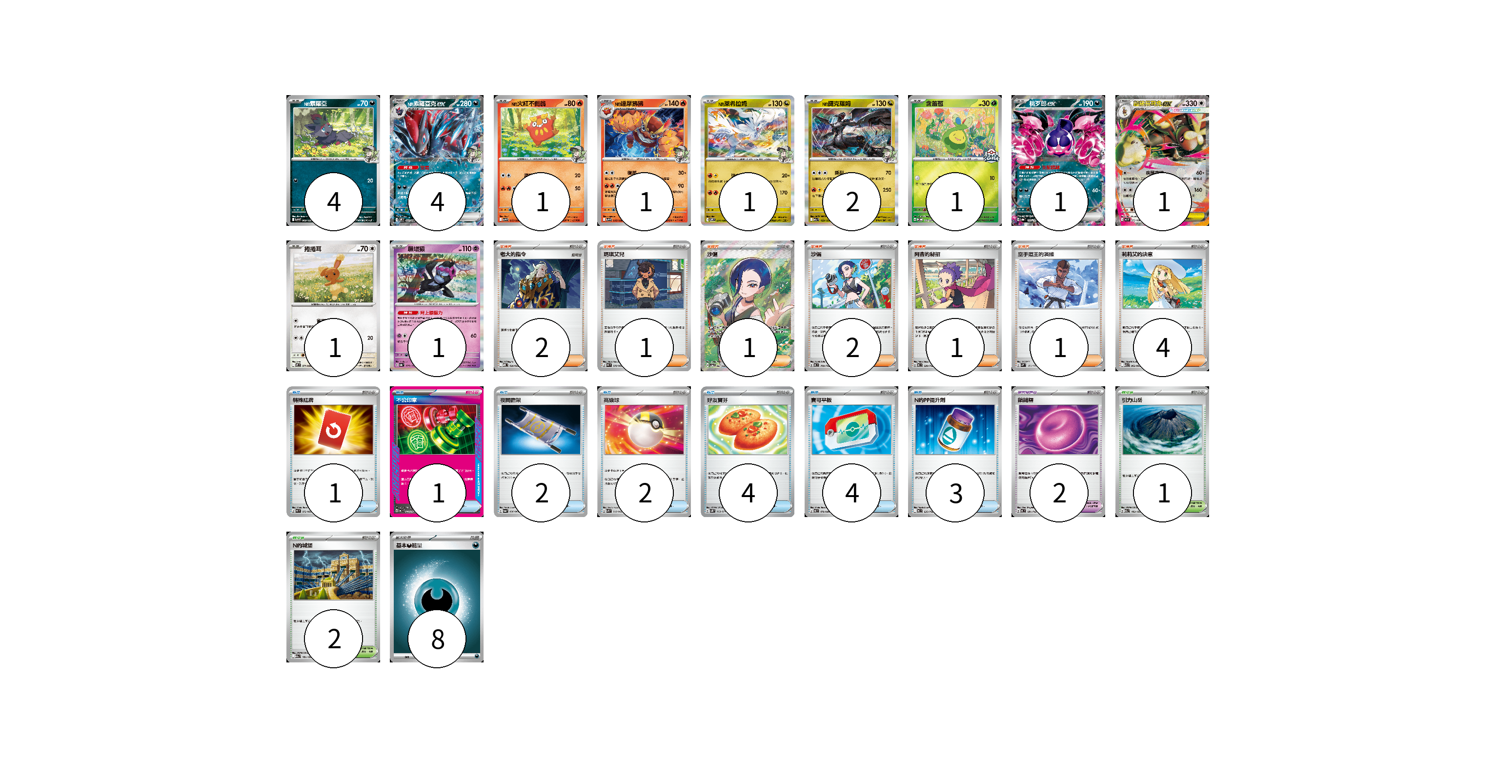 牌組構築方案 以此牌組為基礎新構築牌組 顯示卡面 顯示列表 寶可夢卡(18) 4 4 1 1 1 2 1 1 1 1 1 寶可夢道具(2) 2 物品卡(17) 1 1 2 2 4 4 3 支援者卡(12) 2 1 1 2 1 1 4 競技場卡(3) 1 2 能量卡(8) 8 寶可夢卡(18) 卡牌名稱 張數 卡牌名稱 張數 N的索羅亞 SV9 060/100 04 N的索羅亞克ex SV9 061/100 04 N的火紅不倒翁 SV9 015/100 01 N的達摩狒狒 SV9 016/100 01 N的萊希拉姆 SV9 074/100 01 N的捷克羅姆 M2a 129/193 02 含羞苞 M-P 037/M-P 01 桃歹郎ex SV8a 105/187 01 超級長耳兔ex M2 072/080 01 捲捲耳 M2 071/080 01 願增猿 SV8a 075/187 01 寶可夢道具(2) 卡牌名稱 張數 卡牌名稱 張數 鎖鏈糬 MC 681/742 02 物品卡(17) 卡牌名稱 張數 卡牌名稱 張數 特殊紅牌 M4 072/083 01 不公印章 MC 633/742 01 夜間擔架 SV6a 056/064 02 高級球 SVK 018/042 02 好友寶芬 SV5K 063/071 04 寶可平板 M3 070/080 04 N的PP提升劑 MC 635/742 03 支援者卡(12) 卡牌名稱 張數 卡牌名稱 張數 老大的指令 MBD 020/022 02 瑪琪艾兒 M4 078/083 01 沙儷 SV5a 087/066 01 沙儷 MC 709/742 02 阿杏的秘招 MC 699/742 01 空手道王的演練 SVM 151/175 01 莉莉艾的決意 M1L 062/063 04 競技場卡(3) 卡牌名稱 張數 卡牌名稱 張數 引力山岳 M2a 183/193 01 N的城堡 M2a 181/193 02 能量卡(8) 卡牌名稱 張數 卡牌名稱 張數 基本【惡】能量 MC DAR 08 以此牌組為基礎新構築牌組 牌組編碼 sSPdgW-owWVQO-ajcTHk copy 列印牌組單 牌組編碼已複製 分享至SNS