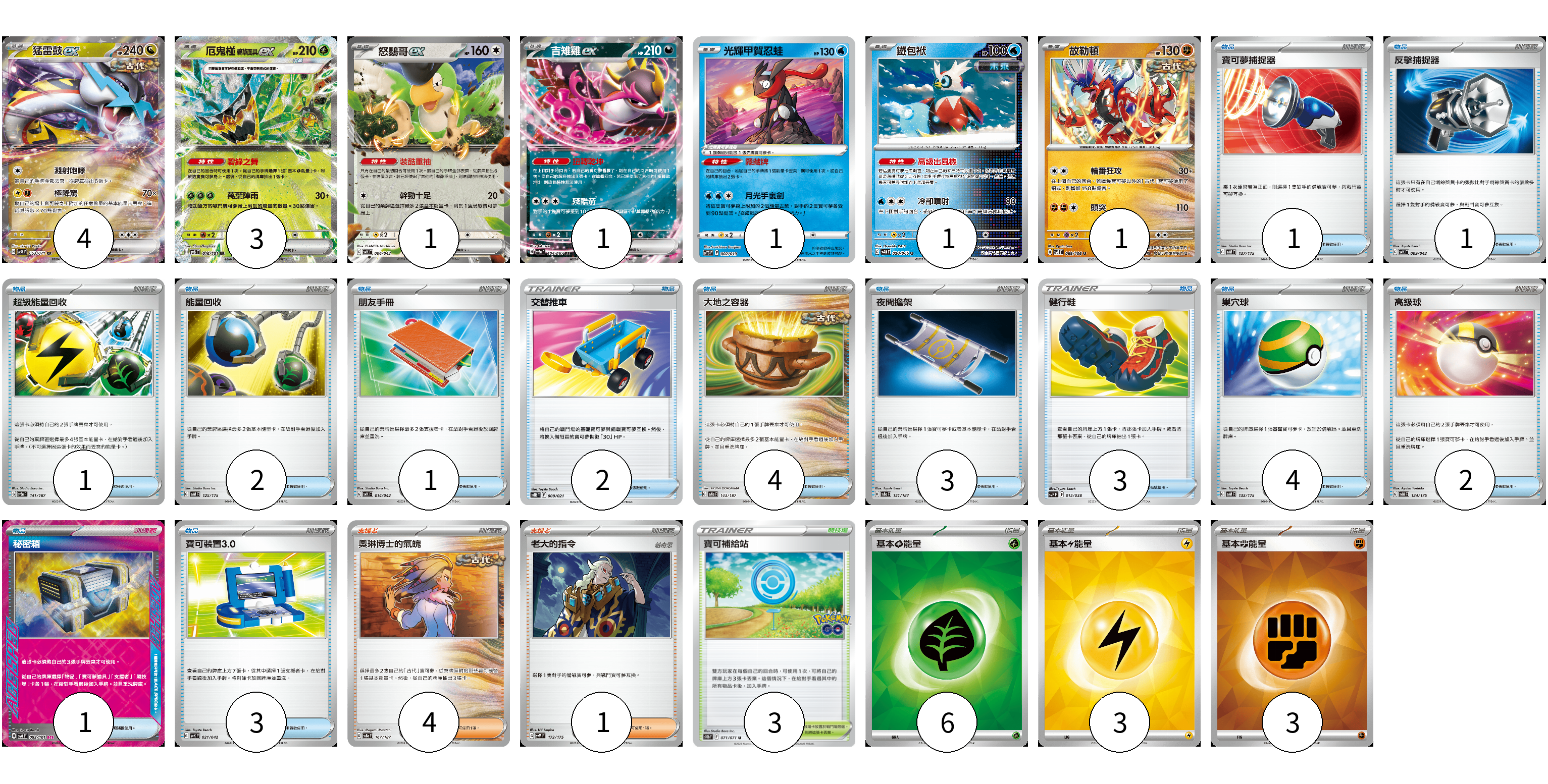 牌組構築方案 以此牌組為基礎新構築牌組 顯示卡面 顯示列表 寶可夢卡(12) 4 3 1 1 1 1 1 物品卡(28) 1 1 1 2 1 2 4 3 3 4 2 1 3 支援者卡(5) 4 1 競技場卡(3) 3 能量卡(12) 6 3 3 寶可夢卡(12) 卡牌名稱 張數 卡牌名稱 張數 猛雷鼓ex SV5K 053/071 04 厄鬼椪 碧草面具ex SV6 016/101 03 怒鸚哥ex SVK 006/042 01 吉雉雞ex SV8a 104/187 01 光輝甲賀忍蛙 SVTG 002/019 01 鐵包袱 SV4M 020/066 01 故勒頓 SV8 069/106 01 物品卡(28) 卡牌名稱 張數 卡牌名稱 張數 寶可夢捕捉器 SVM 137/175 01 反擊捕捉器 SVK 009/042 01 超級能量回收 SV8a 141/187 01 能量回收 SVM 125/175 02 朋友手冊 SVK 014/042 01 交替推車 SVTR 009/021 02 大地之容器 SV8a 143/187 04 夜間擔架 SV8a 151/187 03 健行鞋 SVF 015/038 03 巢穴球 SVM 133/175 04 高級球 SVM 134/175 02 秘密箱 SV6 092/101 01 寶可裝置3.0 SVK 021/042 03 支援者卡(5) 卡牌名稱 張數 卡牌名稱 張數 奧琳博士的氣魄 SV8a 167/187 04 老大的指令 SVM 172/175 01 競技場卡(3) 卡牌名稱 張數 卡牌名稱 張數 寶可補給站 S10b 071/071 03 能量卡(12) 卡牌名稱 張數 卡牌名稱 張數 基本【草】能量 SVK GRA 06 基本【雷】能量 SVK LIG 03 基本【鬥】能量 SVK FIG 03 以此牌組為基礎新構築牌組 牌組編碼 sSdQyy-FEdDDp-fmBWBe copy 列印牌組單 牌組編碼已複製 分享至SNS