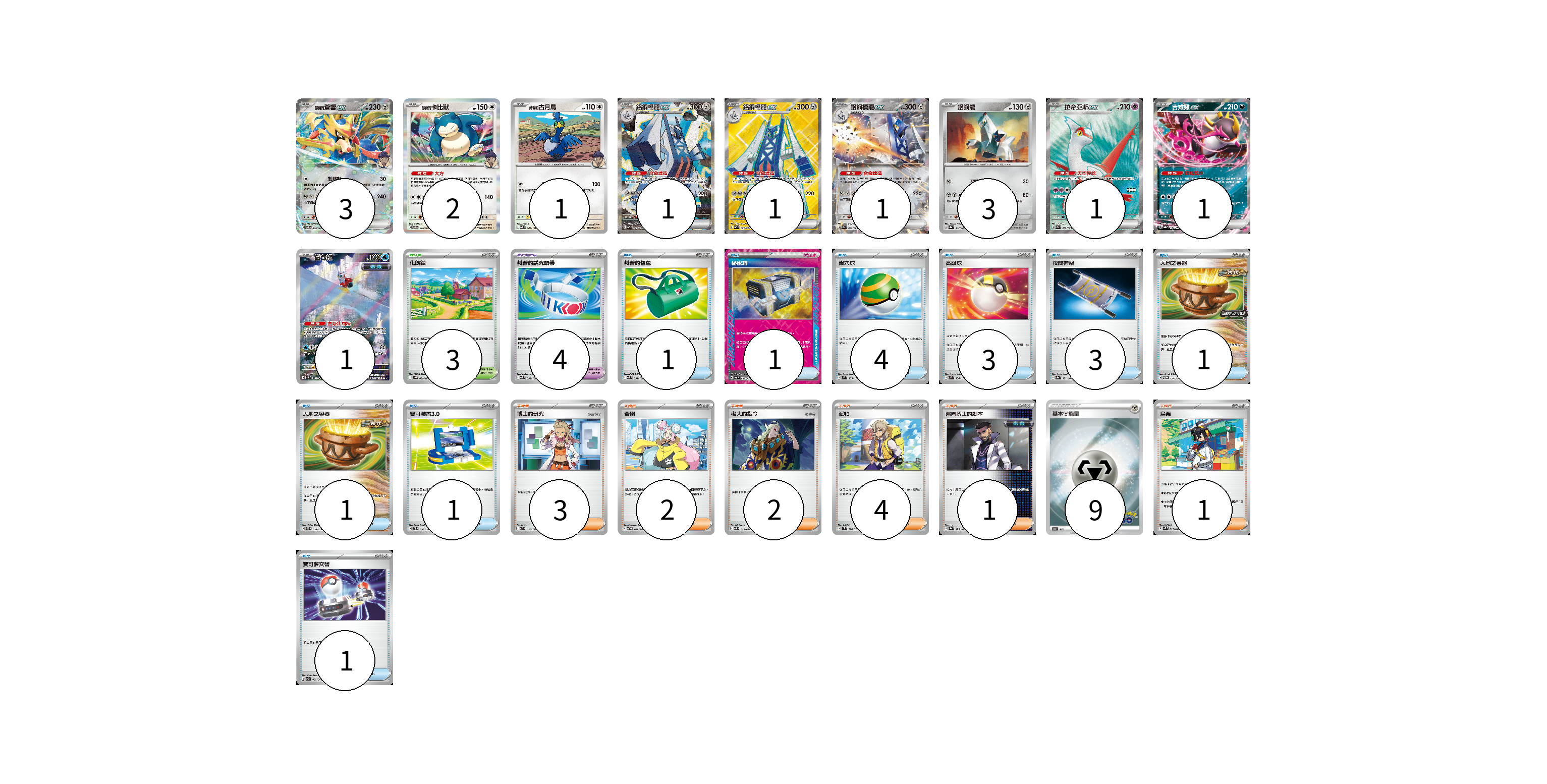 牌組構築方案 以此牌組為基礎新構築牌組 顯示卡面 顯示列表 寶可夢卡(15) 3 2 1 1 1 1 3 1 1 1 寶可夢道具(4) 4 物品卡(16) 1 1 4 3 3 1 1 1 1 支援者卡(13) 3 2 2 4 1 1 競技場卡(3) 3 能量卡(9) 9 寶可夢卡(15) 卡牌名稱 張數 卡牌名稱 張數 赫普的蒼響ex SV9 069/100 03 赫普的卡比獸 SV9 075/100 02 赫普的古月鳥 SV9 087/100 01 鋁鋼橋龍ex SV7a 088/064 01 鋁鋼橋龍ex SV7a 080/064 01 鋁鋼橋龍ex SV7a 037/064 01 鋁鋼龍 SV8a 112/187 03 拉帝亞斯ex SV7a 078/064 01 吉雉雞ex SV8a 104/187 01 鐵包袱 SV4M 071/066 01 寶可夢道具(4) 卡牌名稱 張數 卡牌名稱 張數 赫普的講究頭帶 SV9 092/100 04 物品卡(16) 卡牌名稱 張數 卡牌名稱 張數 赫普的包包 SV9 091/100 01 秘密箱 SV6 092/101 01 巢穴球 SVM 133/175 04 高級球 SVM 134/175 03 夜間擔架 SV8a 151/187 03 大地之容器 SV-P 137/SV-P 01 大地之容器 SVTG 010/019 01 寶可裝置3.0 SVTL 014/021 01 寶可夢交替 SVK 022/042 01 支援者卡(13) 卡牌名稱 張數 卡牌名稱 張數 博士的研究(奧琳博士) SVD 135/139 03 奇樹 SVTG 017/019 02 老大的指令 SVF 032/038 02 派帕 SV1V 076/078 04 弗圖博士的劇本 SV8a 175/187 01 烏栗 SVK 029/042 01 競技場卡(3) 卡牌名稱 張數 卡牌名稱 張數 化朗鎮 SV9 099/100 03 能量卡(9) 卡牌名稱 張數 卡牌名稱 張數 基本鋼能量 S10b MET 09 以此牌組為基礎新構築牌組 牌組編碼 sTCPpI-omIlny-wtylzd copy 列印牌組單 牌組編碼已複製 分享至SNS