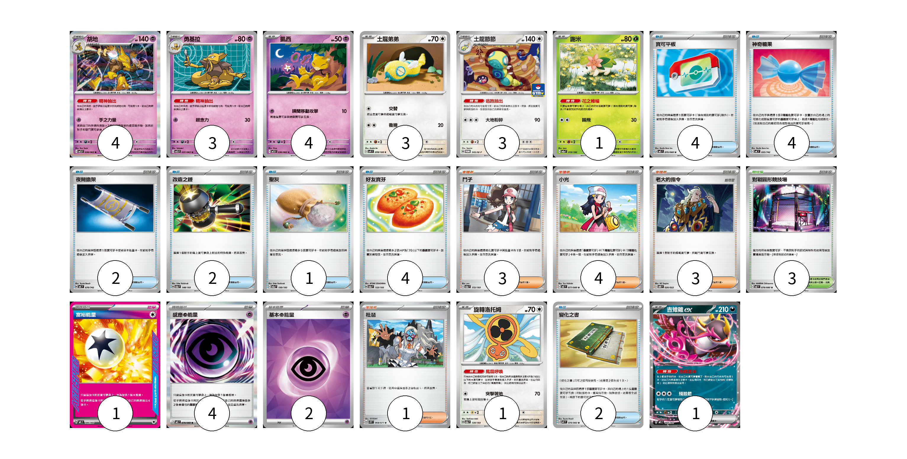 牌組構築方案 以此牌組為基礎新構築牌組 顯示卡面 顯示列表 寶可夢卡(20) 4 3 4 3 3 1 1 1 物品卡(19) 4 4 2 2 1 4 2 支援者卡(11) 3 4 3 1 競技場卡(3) 3 能量卡(7) 1 4 2 寶可夢卡(20) 卡牌名稱 張數 卡牌名稱 張數 胡地 M1S 038/063 04 勇基拉 M1S 037/063 03 凱西 M1S 036/063 04 土龍弟弟 SV9 078/100 03 土龍節節 M-P 045/M-P 03 謝米 M2a 012/193 01 旋轉洛托姆 M2a 139/193 01 吉雉雞ex MC 489/742 01 物品卡(19) 卡牌名稱 張數 卡牌名稱 張數 寶可平板 M3 070/080 04 神奇糖果 MC 655/742 04 夜間擔架 MC 670/742 02 改造之錘 M2a 148/193 02 聖灰 M2a 150/193 01 好友寶芬 M2a 153/193 04 變化之書 M4 074/083 02 支援者卡(11) 卡牌名稱 張數 卡牌名稱 張數 鬥子 M2a 172/193 03 小光 M2 077/080 04 老大的指令 MBD 020/022 03 枇琶 SV5K 068/071 01 競技場卡(3) 卡牌名稱 張數 卡牌名稱 張數 對戰圓形競技場 M2 079/080 03 能量卡(7) 卡牌名稱 張數 卡牌名稱 張數 富裕能量 MC 740/742 01 感應【超】能量 M3 079/080 04 基本【超】能量 SVOD PSY 02 以此牌組為基礎新構築牌組 牌組編碼 sTPmyw-cUmOIB-amdZOe copy 列印牌組單 牌組編碼已複製 分享至SNS