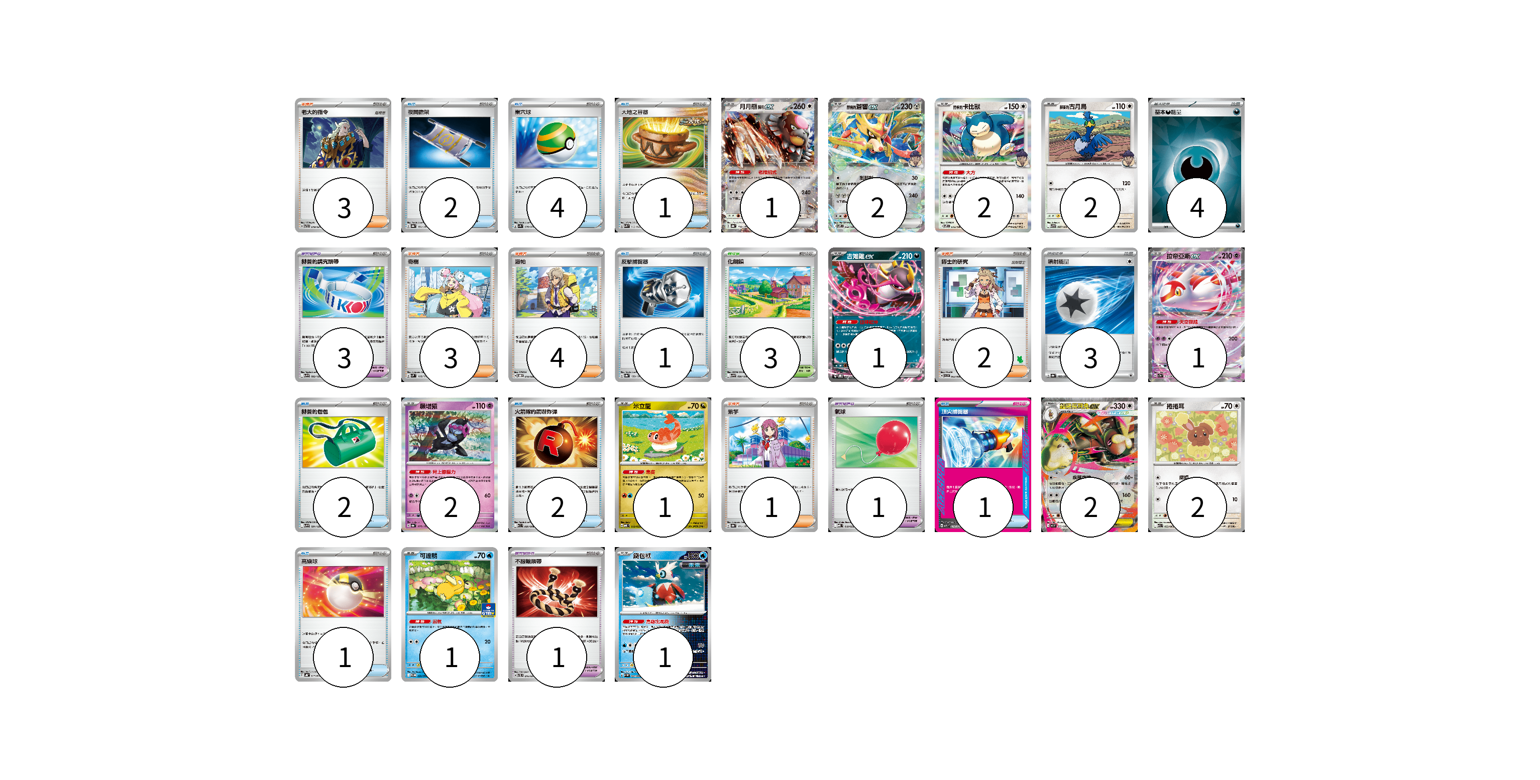牌組構築方案 以此牌組為基礎新構築牌組 顯示卡面 顯示列表 寶可夢卡(18) 1 2 2 2 1 1 2 1 2 2 1 1 寶可夢道具(4) 3 1 物品卡(15) 2 4 1 1 2 2 1 1 1 支援者卡(13) 3 3 4 2 1 競技場卡(3) 3 能量卡(7) 4 3 寶可夢卡(18) 卡牌名稱 張數 卡牌名稱 張數 月月熊 赫月ex SV8a 134/187 01 赫普的蒼響ex SV9 069/100 02 赫普的卡比獸 SV9 075/100 02 赫普的古月鳥 SV9 087/100 02 吉雉雞ex SVOD 004/020 01 拉帝亞斯ex SV7a 019/064 01 願增猿 SV8a 075/187 02 米立龍 MBD 010/022 01 超級長耳兔ex M2 072/080 02 捲捲耳 M1S 053/063 02 可達鴨 SV-P 220/SV-P 01 鐵包袱 SV4M 020/066 01 寶可夢道具(4) 卡牌名稱 張數 卡牌名稱 張數 赫普的講究頭帶 SV9 092/100 03 不服輸頭帶 SVTL 016/021 01 物品卡(15) 卡牌名稱 張數 卡牌名稱 張數 夜間擔架 SV8a 151/187 02 巢穴球 SV1S 070/078 04 大地之容器 SVK 012/042 01 反擊捕捉器 SV8a 139/187 01 赫普的包包 SV9 091/100 02 火箭隊的驚嚇炸彈 SV10 089/098 02 氣球 MBD 018/022 01 頂尖捕捉器 MBG 014/022 01 高級球 SVHK 013/022 01 支援者卡(13) 卡牌名稱 張數 卡牌名稱 張數 老大的指令 SVTR 019/021 03 奇樹 SVM 160/175 03 派帕 SVOD 018/020 04 博士的研究 SVI 063/066 02 紫竽 SV8a 171/187 01 競技場卡(3) 卡牌名稱 張數 卡牌名稱 張數 化朗鎮 SV9 099/100 03 能量卡(7) 卡牌名稱 張數 卡牌名稱 張數 基本【惡】能量 SVOM DAR 04 噴射能量 SV8a 185/187 03 以此牌組為基礎新構築牌組 牌組編碼 sUMPMh-YnUxZp-fRqCSQ copy 列印牌組單 牌組編碼已複製 分享至SNS