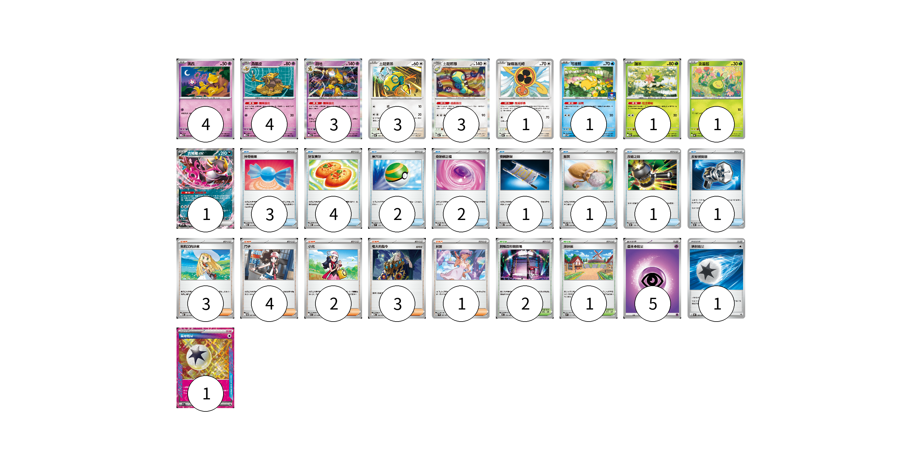 牌組構築方案 以此牌組為基礎新構築牌組 顯示卡面 顯示列表 寶可夢卡(22) 4 4 3 3 3 1 1 1 1 1 物品卡(15) 3 4 2 2 1 1 1 1 支援者卡(13) 3 4 2 3 1 競技場卡(3) 2 1 能量卡(7) 5 1 1 寶可夢卡(22) 卡牌名稱 張數 卡牌名稱 張數 凱西 M1S 036/063 04 勇基拉 M1S 037/063 04 胡地 M1S 038/063 03 土龍弟弟 SV8a 129/187 03 土龍節節 SV8a 130/187 03 旋轉洛托姆 SV8a 131/187 01 可達鴨 SV-P 220/SV-P 01 謝米 SV9a 006/063 01 含羞苞 SV8a 001/187 01 吉雉雞ex SV8a 104/187 01 物品卡(15) 卡牌名稱 張數 卡牌名稱 張數 神奇糖果 MBG 013/022 03 好友寶芬 MBD 013/022 04 巢穴球 SVM 133/175 02 奇跡修正檔 MBD 017/022 02 夜間擔架 MBD 016/022 01 聖灰 SV9a 056/063 01 改造之錘 SV8a 138/187 01 反擊捕捉器 SV8a 139/187 01 支援者卡(13) 卡牌名稱 張數 卡牌名稱 張數 莉莉艾的決意 MBD 021/022 03 鬥子 SV11W 085/086 04 小光 M2 077/080 02 老大的指令 MBD 020/022 03 莉普 SV4M 066/066 01 競技場卡(3) 卡牌名稱 張數 卡牌名稱 張數 對戰圓形競技場 M2 079/080 02 深缽鎮 SVK 039/042 01 能量卡(7) 卡牌名稱 張數 卡牌名稱 張數 基本【超】能量 MBD PSY 05 噴射能量 SV8a 185/187 01 富裕能量 SV7a 064/064 01 以此牌組為基礎新構築牌組 牌組編碼 sXTMVm-KthZZr-EBXKQg copy 列印牌組單 牌組編碼已複製 分享至SNS