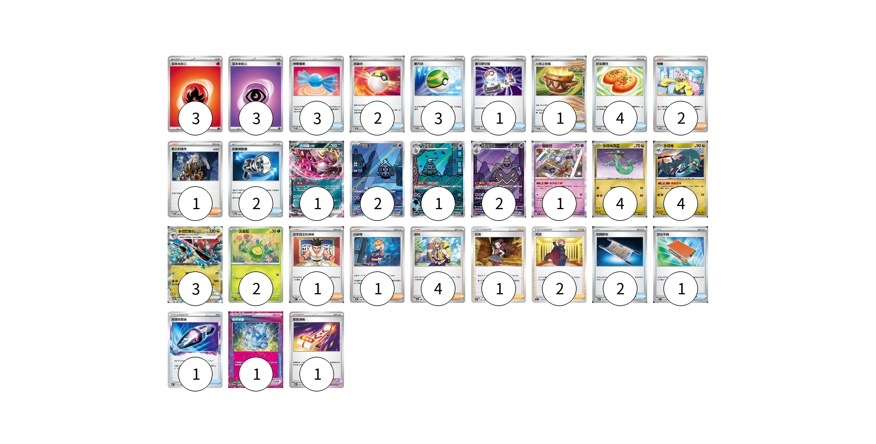 牌組構築方案 以此牌組為基礎新構築牌組 顯示卡面 顯示列表 寶可夢卡(20) 1 2 1 2 1 4 4 3 2 寶可夢道具(2) 1 1 物品卡(20) 3 2 3 1 1 4 2 2 1 1 支援者卡(12) 2 1 1 1 4 1 2 能量卡(6) 3 3 寶可夢卡(20) 卡牌名稱 張數 卡牌名稱 張數 吉雉雞ex SV6a 038/064 01 夜巡靈 SV6a 068/064 02 彷徨夜靈 SV6a 069/064 01 黑夜魔靈 SV6a 070/064 02 鑰圈兒 SV4a 087/190 01 多龍梅西亞 SV6 079/101 04 多龍奇 SV6 080/101 04 多龍巴魯托ex SV6 081/101 03 含羞苞 SV8a 001/187 02 寶可夢道具(2) 卡牌名稱 張數 卡牌名稱 張數 璀璨結晶 SV8a 152/187 01 緊急滑板 SV8a 153/187 01 物品卡(20) 卡牌名稱 張數 卡牌名稱 張數 神奇糖果 SVTS 015/022 03 高級球 SVTS 014/022 02 巢穴球 SVTS 013/022 03 寶可夢交替 SVTS 016/022 01 大地之容器 SVTS 011/022 01 好友寶芬 SVTS 012/022 04 反擊捕捉器 SVTS 009/022 02 夜間擔架 SV8a 151/187 02 朋友手冊 SVK 014/042 01 放逐吸塵器 SVB 016/028 01 支援者卡(12) 卡牌名稱 張數 卡牌名稱 張數 奇樹 SVTS 018/022 02 老大的指令 SVTS 020/022 01 空手道王的演練 SVM 143/175 01 白蕾雅 SV8a 176/187 01 派帕 SV4a 180/190 04 杜娟 SVB 021/028 01 阿渡 S12 096/098 02 能量卡(6) 卡牌名稱 張數 卡牌名稱 張數 基本【火】能量 SVTL FIR 03 基本【超】能量 SVTS PSY 03 以此牌組為基礎新構築牌組 牌組編碼 sebrMW-KlVxpU-JXKgGQ copy 列印牌組單 牌組編碼已複製 分享至SNS