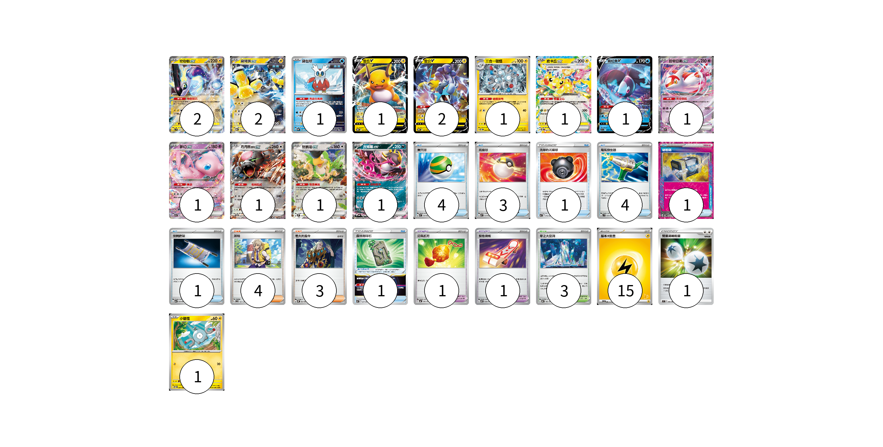 牌組構築方案 以此牌組為基礎新構築牌組 顯示卡面 顯示列表 寶可夢卡(17) 2 2 1 1 2 1 1 1 1 1 1 1 1 1 寶可夢道具(2) 1 1 物品卡(15) 4 3 1 4 1 1 1 支援者卡(7) 4 3 競技場卡(3) 3 能量卡(16) 15 1 寶可夢卡(17) 卡牌名稱 張數 卡牌名稱 張數 密勒頓ex SV1V 037/078 02 鐵臂膀ex SV8a 054/187 02 鐵包袱 SV8a 047/187 01 雷丘V SVTR 003/021 01 雷公V SVTR 005/021 02 三合一磁怪 SV8 035/106 01 皮卡丘ex SV8 033/106 01 霓虹魚V S9 030/100 01 拉帝亞斯ex SV7a 019/064 01 夢幻ex SV2a 151/165 01 月月熊 赫月 ex SV5a 052/066 01 怒鸚哥ex SV2P 065/071 01 吉雉雞ex SV8a 104/187 01 小磁怪 SV8 034/106 01 寶可夢道具(2) 卡牌名稱 張數 卡牌名稱 張數 勇氣護符 SV4a 169/190 01 緊急滑板 SV5K 064/071 01 物品卡(15) 卡牌名稱 張數 卡牌名稱 張數 巢穴球 SVK 016/042 04 高級球 SVK 018/042 03 洗翠的沉重球 SVF 019/038 01 電氣發生器 SV1V 069/078 04 秘密箱 SV6 092/101 01 夜間擔架 SV6a 056/064 01 森林封印石 SVF 024/038 01 支援者卡(7) 卡牌名稱 張數 卡牌名稱 張數 派帕 SVD 137/139 04 老大的指令 SVHK 022/022 03 競技場卡(3) 卡牌名稱 張數 卡牌名稱 張數 零之大空洞 SV8a 182/187 03 能量卡(16) 卡牌名稱 張數 卡牌名稱 張數 基本【雷】能量 SVI LIG 15 雙重渦輪能量 S9 100/100 01 以此牌組為基礎新構築牌組 牌組編碼 setsks-cfrQEG-ijewOb copy 列印牌組單 牌組編碼已複製 分享至SNS