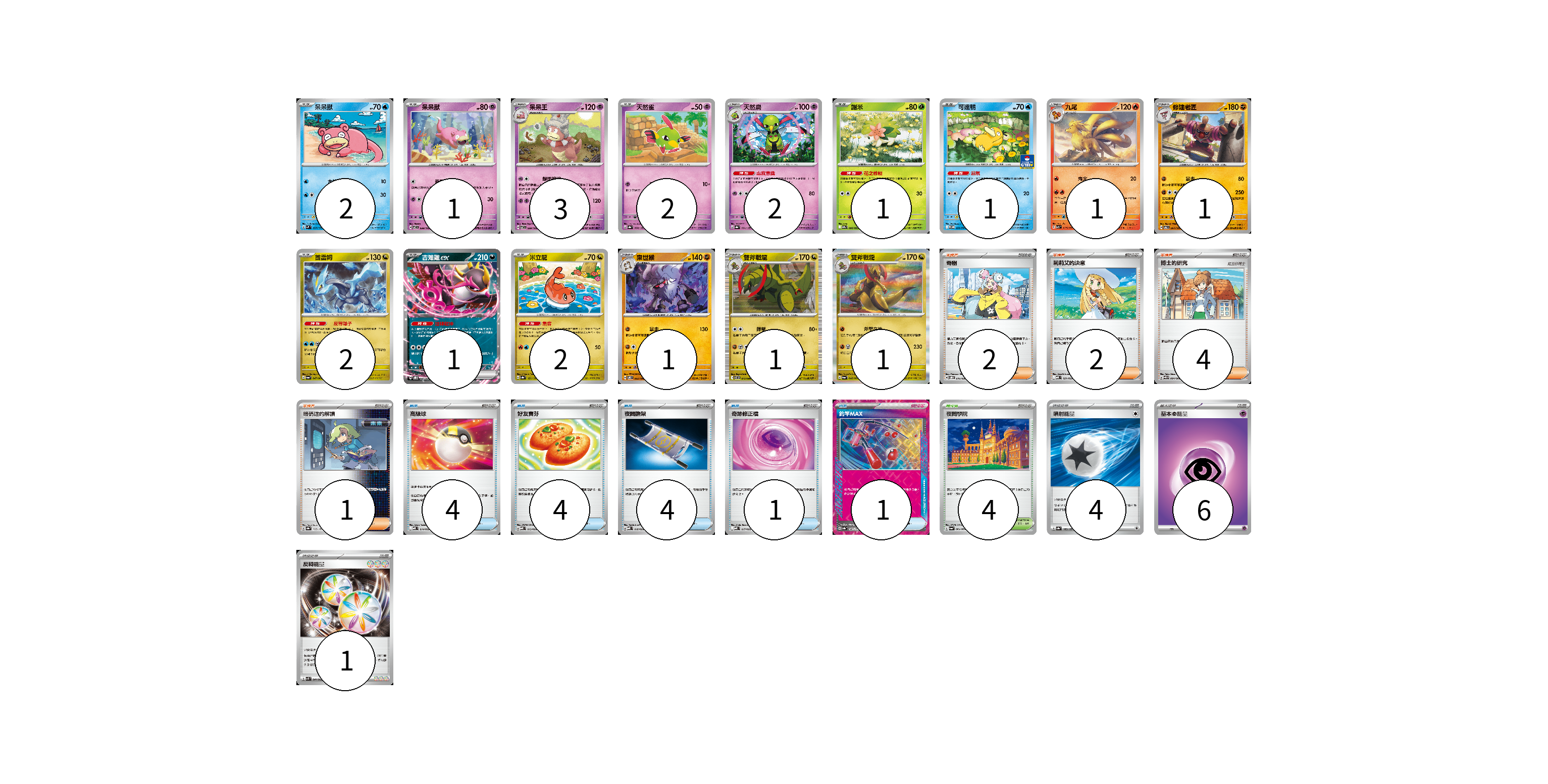 牌組構築方案 以此牌組為基礎新構築牌組 顯示卡面 顯示列表 寶可夢卡(22) 2 1 3 2 2 1 1 1 1 2 1 2 1 1 1 物品卡(14) 4 4 4 1 1 支援者卡(9) 2 2 4 1 競技場卡(4) 4 能量卡(11) 4 6 1 寶可夢卡(22) 卡牌名稱 張數 卡牌名稱 張數 呆呆獸 SVM 027/175 02 呆呆獸 SV7 038/102 01 呆呆王 SV7 039/102 03 天然雀 SV8a 060/187 02 天然鳥 SV8a 061/187 02 謝米 SV9a 006/063 01 可達鴨 SV-P 220/SV-P 01 九尾 SV3 015/108 01 修建老匠 SV6 061/101 01 酋雷姆 SV6a 047/064 02 吉雉雞ex SVOD 004/020 01 米立龍 SV8a 121/187 02 棄世猴 SV8 062/106 01 雙斧戰龍 SV11B 072/086 01 雙斧戰龍 SV6a 046/064 01 物品卡(14) 卡牌名稱 張數 卡牌名稱 張數 高級球 MBD 014/022 04 好友寶芬 MBD 013/022 04 夜間擔架 MBD 016/022 04 奇跡修正檔 MBD 017/022 01 釣竿MAX SV8a 142/187 01 支援者卡(9) 卡牌名稱 張數 卡牌名稱 張數 奇樹 SVOD 016/020 02 莉莉艾的決意 MBD 021/022 02 博士的研究 SV11B 084/086 04 暗碼迷的解讀 SV8a 165/187 01 競技場卡(4) 卡牌名稱 張數 卡牌名稱 張數 夜間學院 SV6a 064/064 04 能量卡(11) 卡牌名稱 張數 卡牌名稱 張數 噴射能量 SV8a 185/187 04 基本超能量 sv-p PSY 06 反轉能量 SVK 041/042 01 以此牌組為基礎新構築牌組 牌組編碼 shytNk-XwJngt-wqYsvo copy 列印牌組單 牌組編碼已複製 分享至SNS