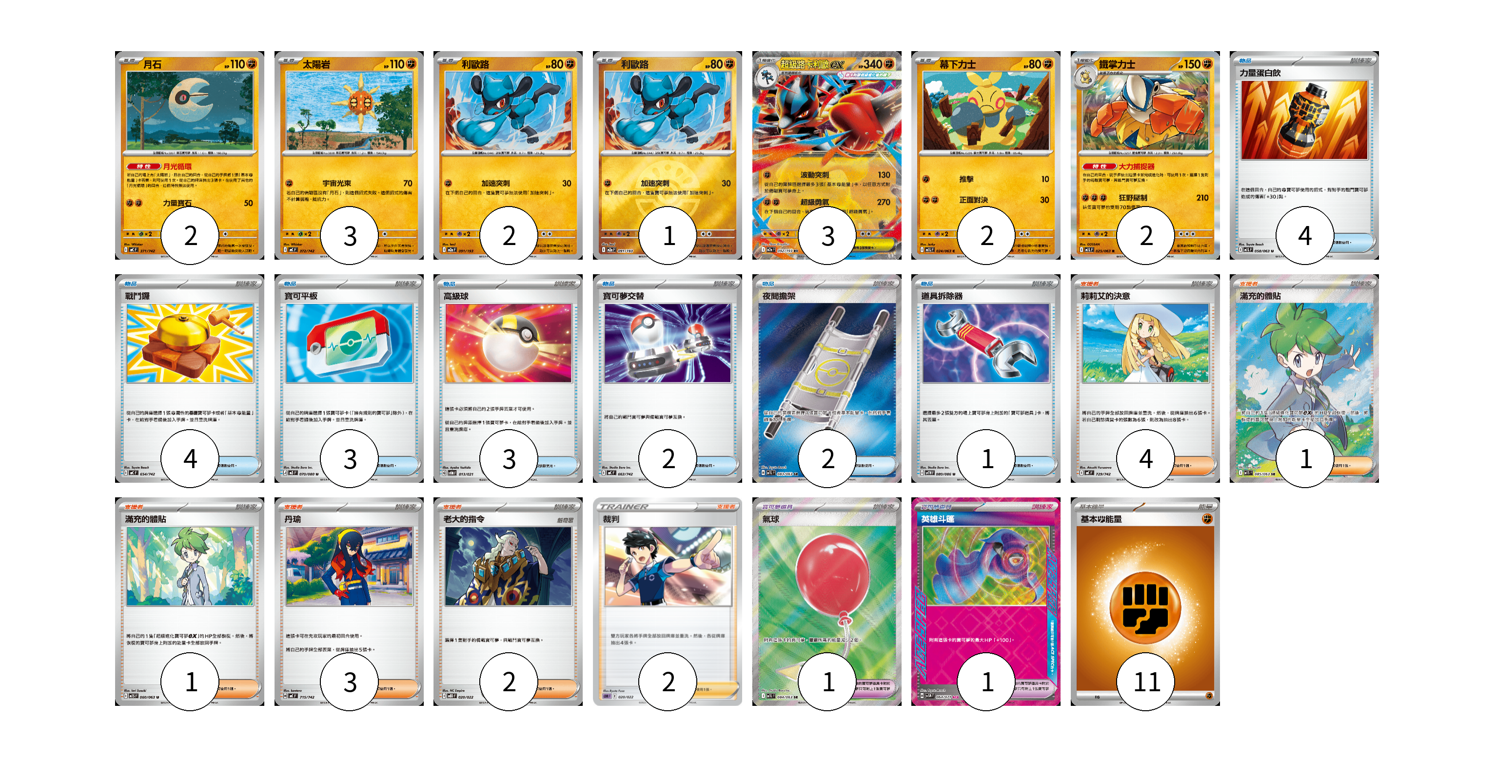 牌組構築方案 以此牌組為基礎新構築牌組 顯示卡面 顯示列表 寶可夢卡(15) 2 3 2 1 3 2 2 寶可夢道具(2) 1 1 物品卡(19) 4 4 3 3 2 2 1 支援者卡(13) 4 1 1 3 2 2 能量卡(11) 11 寶可夢卡(15) 卡牌名稱 張數 卡牌名稱 張數 月石 MC 371/742 02 太陽岩 MC 372/742 03 利歐路 M2a 091/193 02 利歐路 M2a 091/193 01 超級路卡利歐ex M2a 092/193 03 幕下力士 M1L 024/063 02 鐵掌力士 M1L 025/063 02 寶可夢道具(2) 卡牌名稱 張數 卡牌名稱 張數 氣球 M1L 084/063 01 英雄斗篷 SV5M 064/071 01 物品卡(19) 卡牌名稱 張數 卡牌名稱 張數 力量蛋白飲 M1L 058/063 04 戰鬥鑼 MC 654/742 04 寶可平板 M3 070/080 03 高級球 SVOM 013/021 03 寶可夢交替 MC 663/742 02 夜間擔架 M1L 083/063 02 道具拆除器 SV11W 080/086 01 支援者卡(13) 卡牌名稱 張數 卡牌名稱 張數 莉莉艾的決意 MC 729/742 04 滿充的體貼 M1S 085/063 01 滿充的體貼 M1S 060/063 01 丹瑜 MC 715/742 03 老大的指令 MBD 020/022 02 裁判 SDM 020/022 02 能量卡(11) 卡牌名稱 張數 卡牌名稱 張數 基本【鬥】能量 MC FIG 11 以此牌組為基礎新構築牌組 牌組編碼 skmzlq-JjcKtu-OFeuqv copy 列印牌組單 牌組編碼已複製 分享至SNS