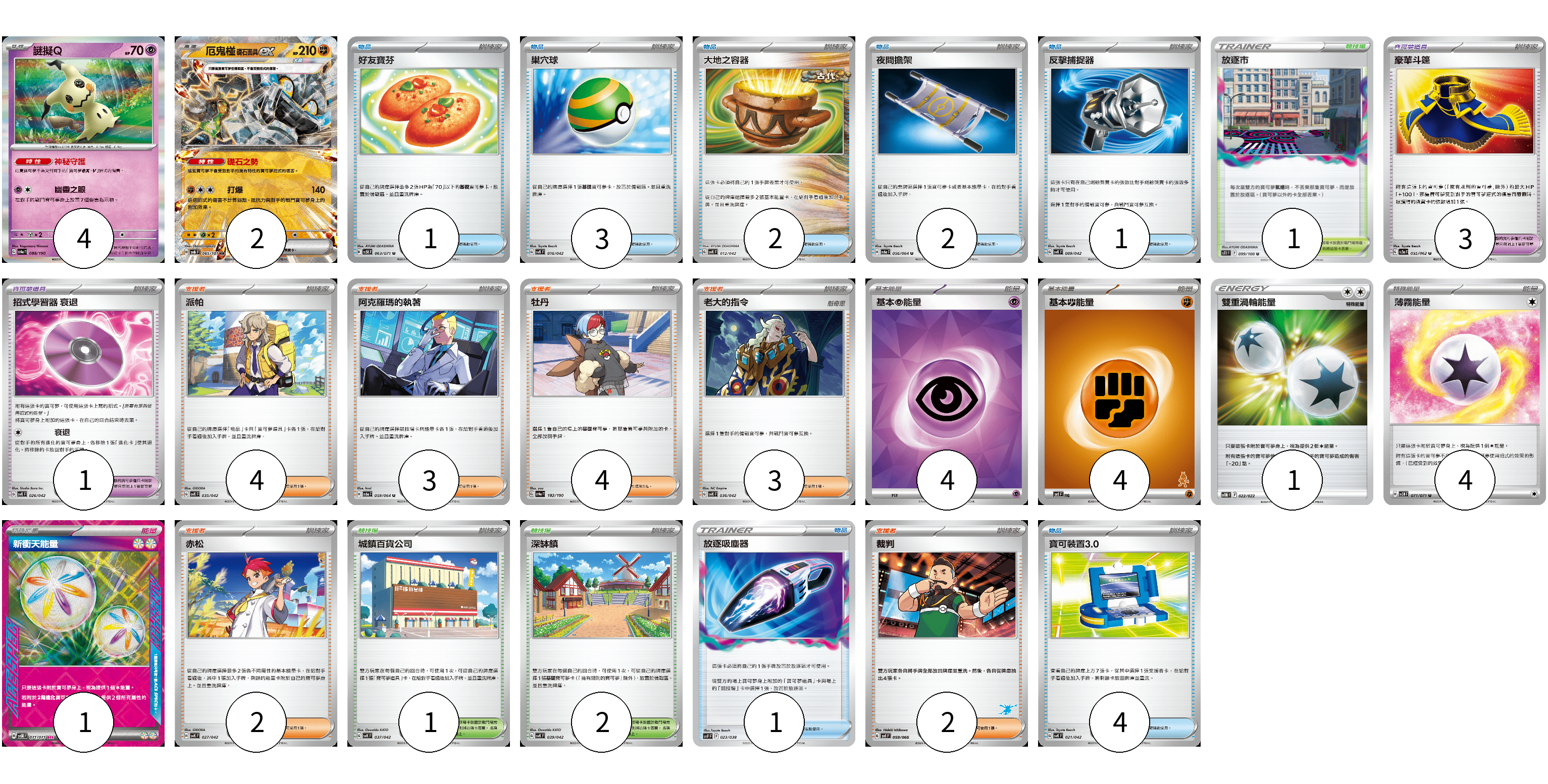 牌組構築方案 以此牌組為基礎新構築牌組 顯示卡面 顯示列表 寶可夢卡(6) 4 2 寶可夢道具(4) 3 1 物品卡(14) 1 3 2 2 1 1 4 支援者卡(18) 4 3 4 3 2 2 競技場卡(4) 1 1 2 能量卡(14) 4 4 1 4 1 寶可夢卡(6) 卡牌名稱 張數 卡牌名稱 張數 謎擬Q SV4a 088/190 04 厄鬼椪 礎石面具ex SV6 065/101 02 寶可夢道具(4) 卡牌名稱 張數 卡牌名稱 張數 豪華斗篷 SV3a 055/062 03 招式學習器 衰退 SVK 026/042 01 物品卡(14) 卡牌名稱 張數 卡牌名稱 張數 好友寶芬 SV5K 063/071 01 巢穴球 SVK 016/042 03 大地之容器 SVK 012/042 02 夜間擔架 SV6a 056/064 02 反擊捕捉器 SVK 009/042 01 放逐吸塵器 SVF 023/038 01 寶可裝置3.0 SVK 021/042 04 支援者卡(18) 卡牌名稱 張數 卡牌名稱 張數 派帕 SVK 035/042 04 阿克羅瑪的執著 SV6a 059/064 03 牡丹 SV4a 182/190 04 老大的指令 SVK 036/042 03 赤松 SVK 027/042 02 裁判 SVI 059/066 02 競技場卡(4) 卡牌名稱 張數 卡牌名稱 張數 放逐市 S11 099/100 01 城鎮百貨公司 SVK 037/042 01 深缽鎮 SVK 039/042 02 能量卡(14) 卡牌名稱 張數 卡牌名稱 張數 基本【超】能量 SVK PSY 04 基本【鬥】能量 SVI FIG 04 雙重渦輪能量 SVTM 022/022 01 薄霧能量 SV5M 071/071 04 新衝天能量 SV5K 071/071 01 以此牌組為基礎新構築牌組 牌組編碼 slnbCW-YrclUx-jyIOSk copy 列印牌組單 牌組編碼已複製 分享至SNS