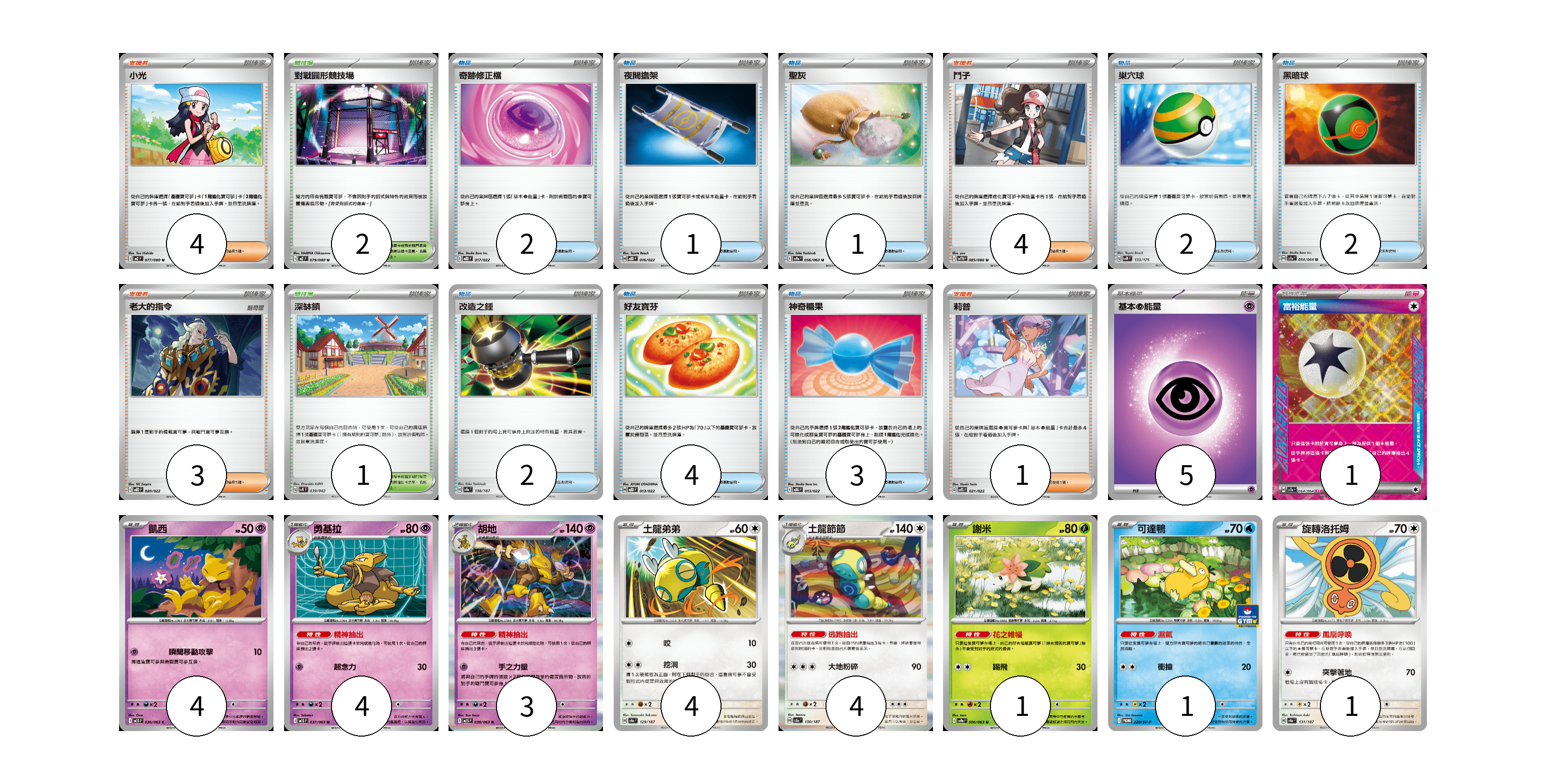 牌組構築方案 以此牌組為基礎新構築牌組 顯示卡面 顯示列表 寶可夢卡(22) 4 4 3 4 4 1 1 1 物品卡(17) 2 1 1 2 2 2 4 3 支援者卡(12) 4 4 3 1 競技場卡(3) 2 1 能量卡(6) 5 1 寶可夢卡(22) 卡牌名稱 張數 卡牌名稱 張數 凱西 M1S 036/063 04 勇基拉 M1S 037/063 04 胡地 M1S 038/063 03 土龍弟弟 SV8a 129/187 04 土龍節節 SV8a 130/187 04 謝米 SV9a 006/063 01 可達鴨 SV-P 220/SV-P 01 旋轉洛托姆 SV8a 131/187 01 物品卡(17) 卡牌名稱 張數 卡牌名稱 張數 奇跡修正檔 MBD 017/022 02 夜間擔架 MBD 016/022 01 聖灰 SV9a 056/063 01 巢穴球 SVM 133/175 02 黑暗球 SV7a 054/064 02 改造之錘 SV8a 138/187 02 好友寶芬 MBD 013/022 04 神奇糖果 MBG 013/022 03 支援者卡(12) 卡牌名稱 張數 卡牌名稱 張數 小光 M2 077/080 04 鬥子 SV11W 085/086 04 老大的指令 MBD 020/022 03 莉普 SVTS 021/022 01 競技場卡(3) 卡牌名稱 張數 卡牌名稱 張數 對戰圓形競技場 M2 079/080 02 深缽鎮 SVK 039/042 01 能量卡(6) 卡牌名稱 張數 卡牌名稱 張數 基本【超】能量 MBD PSY 05 富裕能量 SV7a 064/064 01 以此牌組為基礎新構築牌組 牌組編碼 snBCDb-WoJaXL-ISFSKm copy 列印牌組單 牌組編碼已複製 分享至SNS