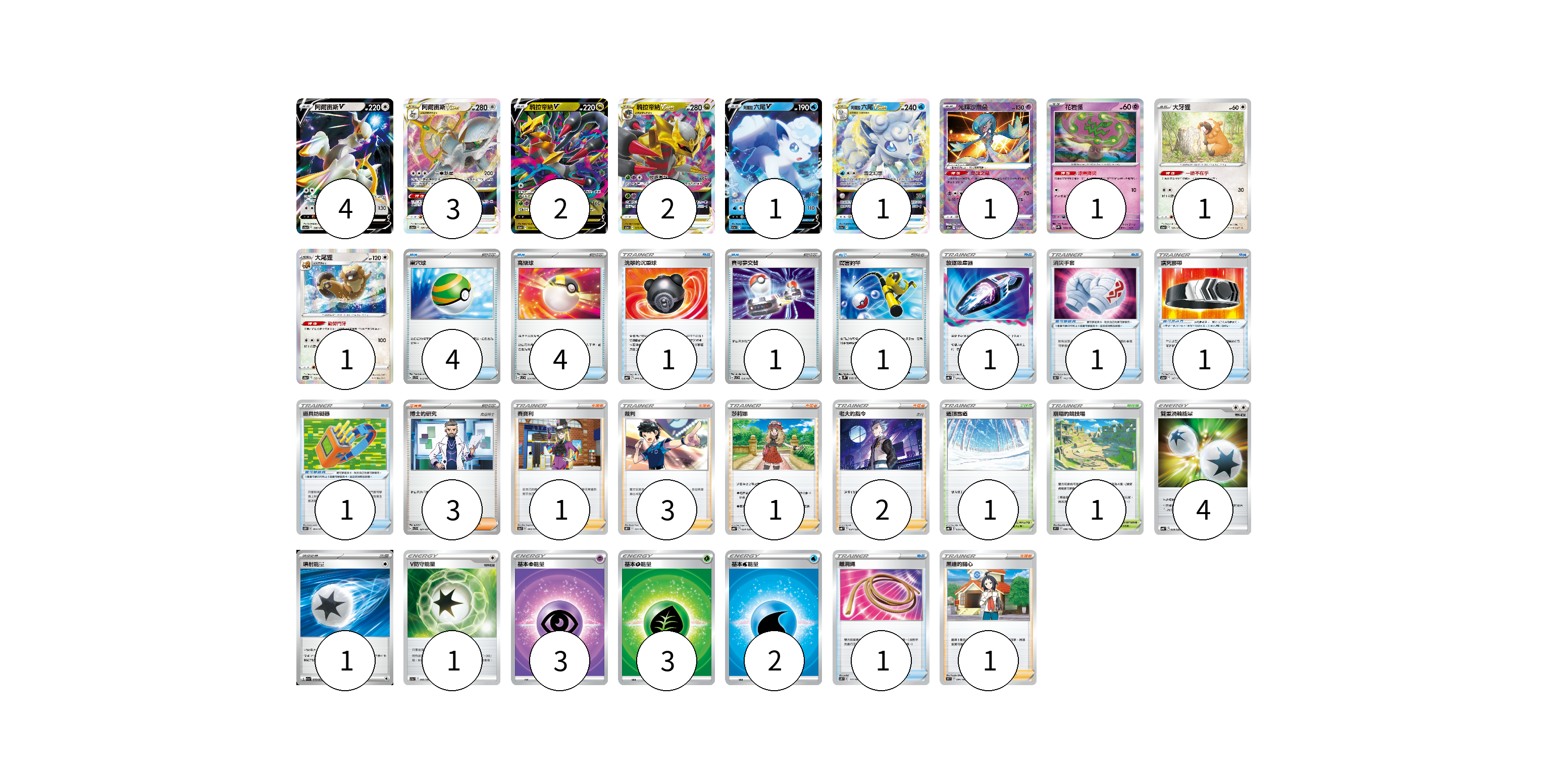 牌組構築方案 以此牌組為基礎新構築牌組 顯示卡面 顯示列表 寶可夢卡(17) 4 3 2 2 1 1 1 1 1 1 寶可夢道具(3) 1 1 1 物品卡(13) 4 4 1 1 1 1 1 支援者卡(11) 3 1 3 1 2 1 競技場卡(2) 1 1 能量卡(14) 4 1 1 3 3 2 寶可夢卡(17) 卡牌名稱 張數 卡牌名稱 張數 阿爾宙斯V S12a 126/172 04 阿爾宙斯VSTAR S12a 127/172 03 騎拉帝納V S12a 110/172 02 騎拉帝納VSTAR S12a 111/172 02 阿羅拉 六尾V S11a 022/068 01 阿羅拉 六尾VSTAR S11a 023/068 01 光輝沙奈朵 S12a 055/172 01 花岩怪 SV2D 028/071 01 大牙狸 S12a 121/172 01 大尾狸 S12a 122/172 01 寶可夢道具(3) 卡牌名稱 張數 卡牌名稱 張數 消災手套 S8b 142/184 01 講究腰帶 S12a 145/172 01 道具妨礙器 S5R 064/070 01 物品卡(13) 卡牌名稱 張數 卡牌名稱 張數 巢穴球 SVC 013/021 04 高級球 SVC 014/021 04 洗翠的沉重球 SVB 014/028 01 寶可夢交替 SVC 016/021 01 厲害釣竿 SV2P 066/071 01 放逐吸塵器 SVB 016/028 01 離洞繩 SCB 117/156 01 支援者卡(11) 卡牌名稱 張數 卡牌名稱 張數 博士的研究(弗圖博士) SVC 021/021 03 賽寶利 S5a 068/070 01 裁判 SN 021/024 03 莎莉娜 SVB 020/028 01 老大的指令(赤日) SVB 024/028 02 黑連的關心 S9 094/100 01 競技場卡(2) 卡牌名稱 張數 卡牌名稱 張數 通頂雪道 SVB 026/028 01 崩塌的競技場 S9 098/100 01 能量卡(14) 卡牌名稱 張數 卡牌名稱 張數 雙重渦輪能量 SVB 028/028 04 噴射能量 SV1a 072/073 01 V防守能量 S11a 068/068 01 基本【超】能量 SI PSY 03 基本【草】能量 SI GRA 03 基本【水】能量 SI WAT 02 以此牌組為基礎新構築牌組 牌組編碼 srKlbq-zCIWsd-awTVTh copy 列印牌組單 牌組編碼已複製 分享至SNS