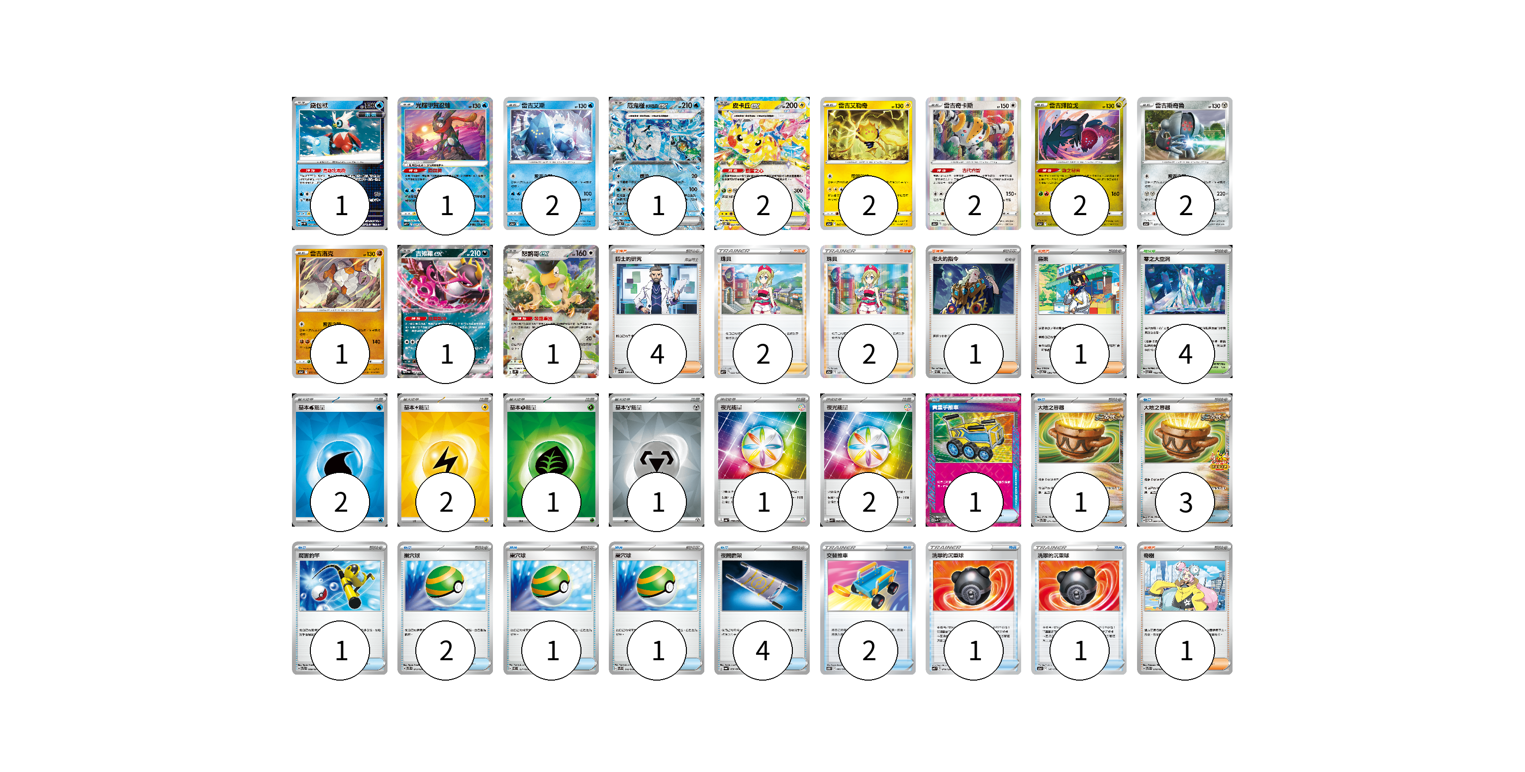 牌組構築方案 以此牌組為基礎新構築牌組 顯示卡面 顯示列表 寶可夢卡(18) 1 1 2 1 2 2 2 2 2 1 1 1 物品卡(18) 1 1 3 1 2 1 1 4 2 1 1 支援者卡(11) 4 2 2 1 1 1 競技場卡(4) 4 能量卡(9) 2 2 1 1 1 2 寶可夢卡(18) 卡牌名稱 張數 卡牌名稱 張數 鐵包袱 SV4M 020/066 01 光輝甲賀忍蛙 SVF 004/038 01 雷吉艾斯 S12a 025/172 02 厄鬼椪 水井面具ex SV6 038/101 01 皮卡丘ex SV8 033/106 02 雷吉艾勒奇 S12a 045/172 02 雷吉奇卡斯 S12a 123/172 02 雷吉鐸拉戈 S12a 116/172 02 雷吉斯奇魯 S12a 097/172 02 雷吉洛克 S12a 075/172 01 吉雉雞ex SV6a 038/064 01 怒鸚哥ex SV2P 065/071 01 物品卡(18) 卡牌名稱 張數 卡牌名稱 張數 貴重手推車 SVK 020/042 01 大地之容器 SVTS 011/022 01 大地之容器 SV-P 084/SV-P 03 厲害釣竿 SVTL 009/021 01 巢穴球 SVTS 013/022 02 巢穴球 SVEL 011/020 01 巢穴球 SVF 016/038 01 夜間擔架 SV6a 056/064 04 交替推車 S10D 060/067 02 洗翠的沉重球 SVF 019/038 01 洗翠的沉重球 S12a 140/172 01 支援者卡(11) 卡牌名稱 張數 卡牌名稱 張數 博士的研究 SVHM 020/022 04 珠貝 SVF 025/038 02 珠貝 S12a 149/172 02 老大的指令 SVEL 019/020 01 烏栗 SV6 096/101 01 奇樹 SVTS 018/022 01 競技場卡(4) 卡牌名稱 張數 卡牌名稱 張數 零之大空洞 SV7 102/102 04 能量卡(9) 卡牌名稱 張數 卡牌名稱 張數 基本【水】能量 SVK WAT 02 基本【雷】能量 SVK LIG 02 基本【草】能量 SVK GRA 01 基本【鋼】能量 SVK MET 01 夜光能量 SV4a 190/190 01 夜光能量 SVK 042/042 02 以此牌組為基礎新構築牌組 牌組編碼 ssuMmz-mGaJGY-YsDSVF copy 列印牌組單 牌組編碼已複製 分享至SNS