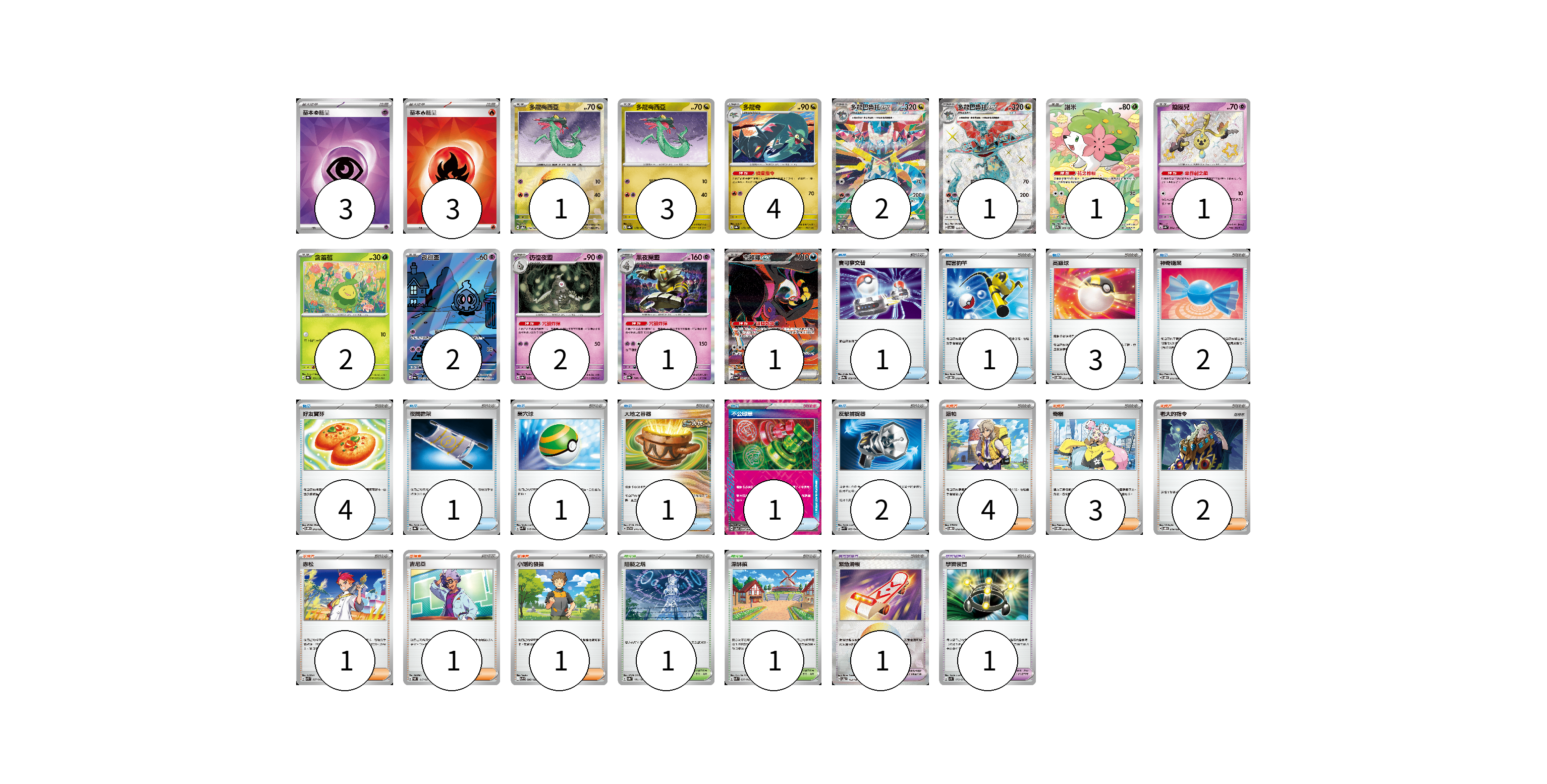 牌組構築方案 以此牌組為基礎新構築牌組 顯示卡面 顯示列表 寶可夢卡(21) 1 3 4 2 1 1 1 2 2 2 1 1 寶可夢道具(2) 1 1 物品卡(17) 1 1 3 2 4 1 1 1 1 2 支援者卡(12) 4 3 2 1 1 1 競技場卡(2) 1 1 能量卡(6) 3 3 寶可夢卡(21) 卡牌名稱 張數 卡牌名稱 張數 多龍梅西亞 SV8a 118/187 01 多龍梅西亞 SV8a 118/187 03 多龍奇 SV8a 119/187 04 多龍巴魯托ex SV8a 221/187 02 多龍巴魯托ex SV6 120/101 01 謝米 SV9a 066/063 01 鑰圈兒 SV4a 264/190 01 含羞苞 SV8a 001/187 02 夜巡靈 SV6a 068/064 02 彷徨夜靈 SV8a 065/187 02 黑夜魔靈 SV8a 066/187 01 吉雉雞ex SV6a 089/064 01 寶可夢道具(2) 卡牌名稱 張數 卡牌名稱 張數 緊急滑板 SV8a 153/187 01 學習裝置 SV1S 072/078 01 物品卡(17) 卡牌名稱 張數 卡牌名稱 張數 寶可夢交替 SV9a 058/063 01 厲害釣竿 SVOD 010/020 01 高級球 SVOD 012/020 03 神奇糖果 SVOD 013/020 02 好友寶芬 SVOM 012/021 04 夜間擔架 SV8a 151/187 01 巢穴球 SVK 016/042 01 大地之容器 SVTG 010/019 01 不公印章 SV5a 053/066 01 反擊捕捉器 SVK 009/042 02 支援者卡(12) 卡牌名稱 張數 卡牌名稱 張數 派帕 SVOD 018/020 04 奇樹 SVOM 018/021 03 老大的指令 SVOD 019/020 02 赤松 SVK 027/042 01 吉尼亞 SVAL 017/021 01 小剛的發掘 SV9 096/100 01 競技場卡(2) 卡牌名稱 張數 卡牌名稱 張數 阻礙之塔 SV8a 181/187 01 深缽鎮 SVK 039/042 01 能量卡(6) 卡牌名稱 張數 卡牌名稱 張數 基本【超】能量 SVOD PSY 03 基本【火】能量 SVK FIR 03 以此牌組為基礎新構築牌組 牌組編碼 swhhPL-mlZeIA-xBEMGL copy 列印牌組單 牌組編碼已複製 分享至SNS
