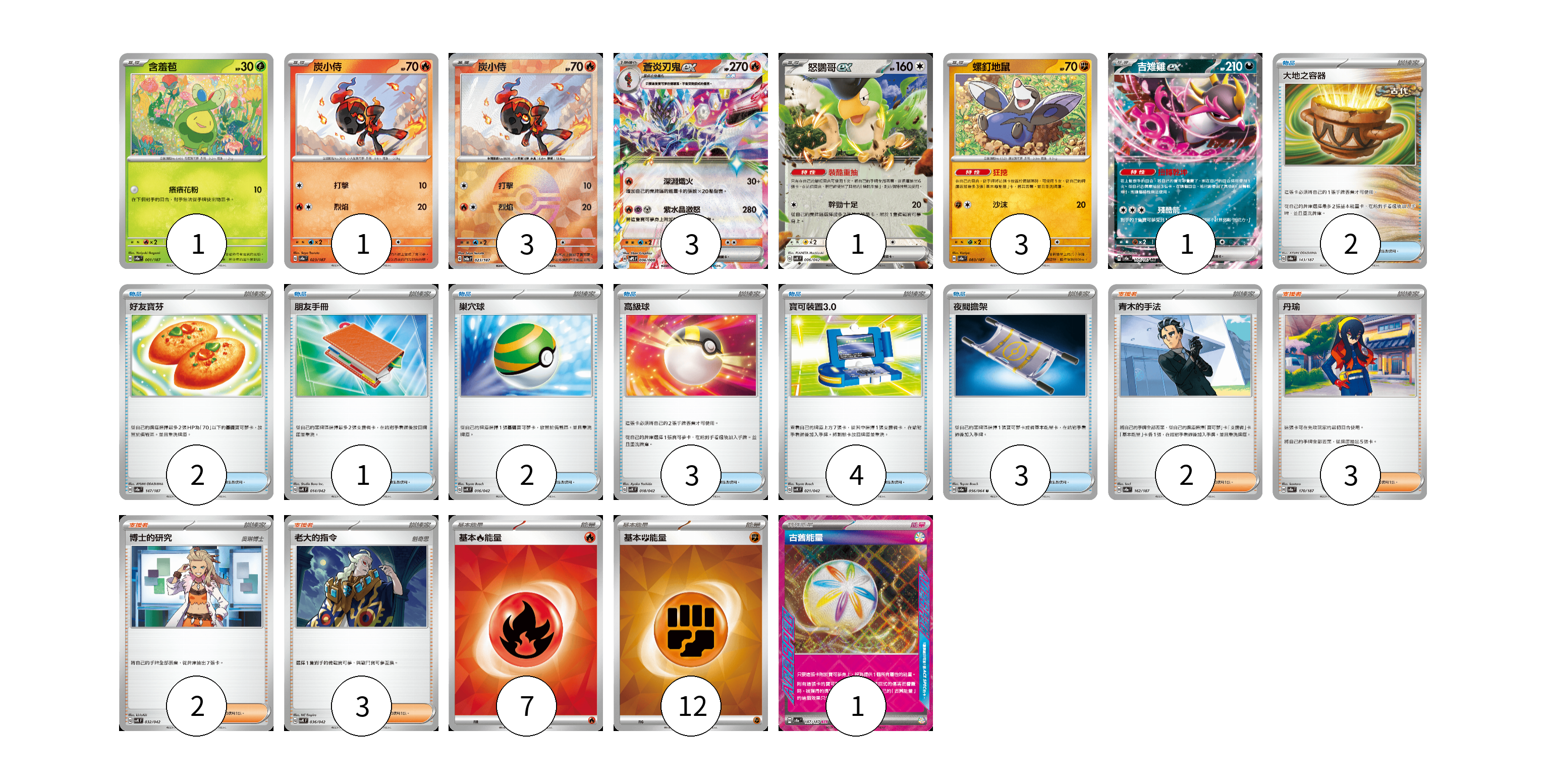 牌組構築方案 以此牌組為基礎新構築牌組 顯示卡面 顯示列表 寶可夢卡(13) 1 1 3 3 1 3 1 物品卡(17) 2 2 1 2 3 4 3 支援者卡(10) 2 3 2 3 能量卡(20) 7 12 1 寶可夢卡(13) 卡牌名稱 張數 卡牌名稱 張數 含羞苞 SV8a 001/187 01 炭小侍 SV8a 023/187 01 炭小侍 SV8a 023/187 03 蒼炎刃鬼ex SVPS 006/008 03 怒鸚哥ex SVK 006/042 01 螺釘地鼠 SV8a 083/187 03 吉雉雞ex SV8a 104/187 01 物品卡(17) 卡牌名稱 張數 卡牌名稱 張數 大地之容器 SV8a 143/187 02 好友寶芬 SV8a 147/187 02 朋友手冊 SVK 014/042 01 巢穴球 SVK 016/042 02 高級球 SVK 018/042 03 寶可裝置3.0 SVK 021/042 04 夜間擔架 SV6a 056/064 03 支援者卡(10) 卡牌名稱 張數 卡牌名稱 張數 青木的手法 SV8a 162/187 02 丹瑜 SV8a 170/187 03 博士的研究 SVK 032/042 02 老大的指令 SVK 036/042 03 能量卡(20) 卡牌名稱 張數 卡牌名稱 張數 基本【火】能量 SVK FIR 07 基本【鬥】能量 SVK FIG 12 古舊能量 SV8a 187/187 01 以此牌組為基礎新構築牌組 牌組編碼 swrDYO-bXIzeT-lqqRvh copy 列印牌組單 牌組編碼已複製 分享至SNS