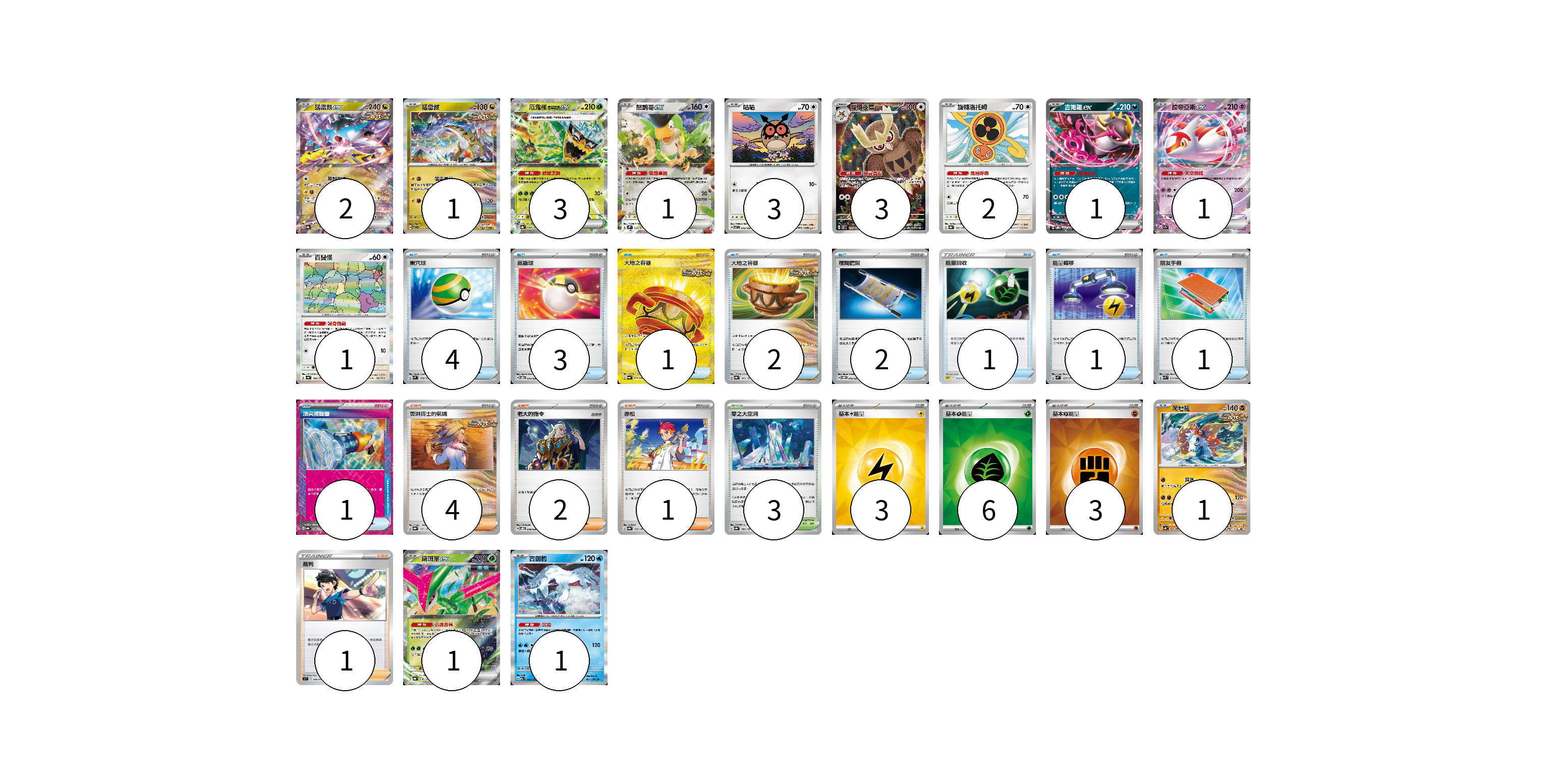 牌組構築方案 以此牌組為基礎新構築牌組 顯示卡面 顯示列表 寶可夢卡(21) 2 1 3 1 3 3 2 1 1 1 1 1 1 物品卡(16) 4 3 1 2 2 1 1 1 1 支援者卡(8) 4 2 1 1 競技場卡(3) 3 能量卡(12) 3 6 3 寶可夢卡(21) 卡牌名稱 張數 卡牌名稱 張數 猛雷鼓ex SV8a 124/187 02 猛雷鼓 SV7 075/102 01 厄鬼椪 碧草面具ex SV8a 020/187 03 怒鸚哥ex SV2P 065/071 01 咕咕 SV7 076/102 03 貓頭夜鷹 SV7 114/102 03 旋轉洛托姆 SV8a 131/187 02 吉雉雞ex SVOD 004/020 01 拉帝亞斯ex SV7a 019/064 01 百變怪 SV4a 144/190 01 爬地翅 SV4K 041/066 01 鐵斑葉ex SV8a 016/187 01 古劍豹 M2a 043/193 01 物品卡(16) 卡牌名稱 張數 卡牌名稱 張數 巢穴球 SVM 133/175 04 高級球 SVOD 012/020 03 大地之容器 SV6a 093/064 01 大地之容器 SV8a 143/187 02 夜間擔架 SVOM 016/021 02 能量回收 SDP 013/022 01 能量轉移 SVM 127/175 01 朋友手冊 SVK 014/042 01 頂尖捕捉器 SV8a 148/187 01 支援者卡(8) 卡牌名稱 張數 卡牌名稱 張數 奧琳博士的氣魄 SV8a 167/187 04 老大的指令 SVOD 019/020 02 赤松 SV8a 163/187 01 裁判 SI 398/414 01 競技場卡(3) 卡牌名稱 張數 卡牌名稱 張數 零之大空洞 SV8a 182/187 03 能量卡(12) 卡牌名稱 張數 卡牌名稱 張數 基本【雷】能量 SVK LIG 03 基本【草】能量 SVK GRA 06 基本【鬥】能量 SVK FIG 03 以此牌組為基礎新構築牌組 牌組編碼 szpeop-tZXlNP-OEqIzD copy 列印牌組單 牌組編碼已複製 分享至SNS