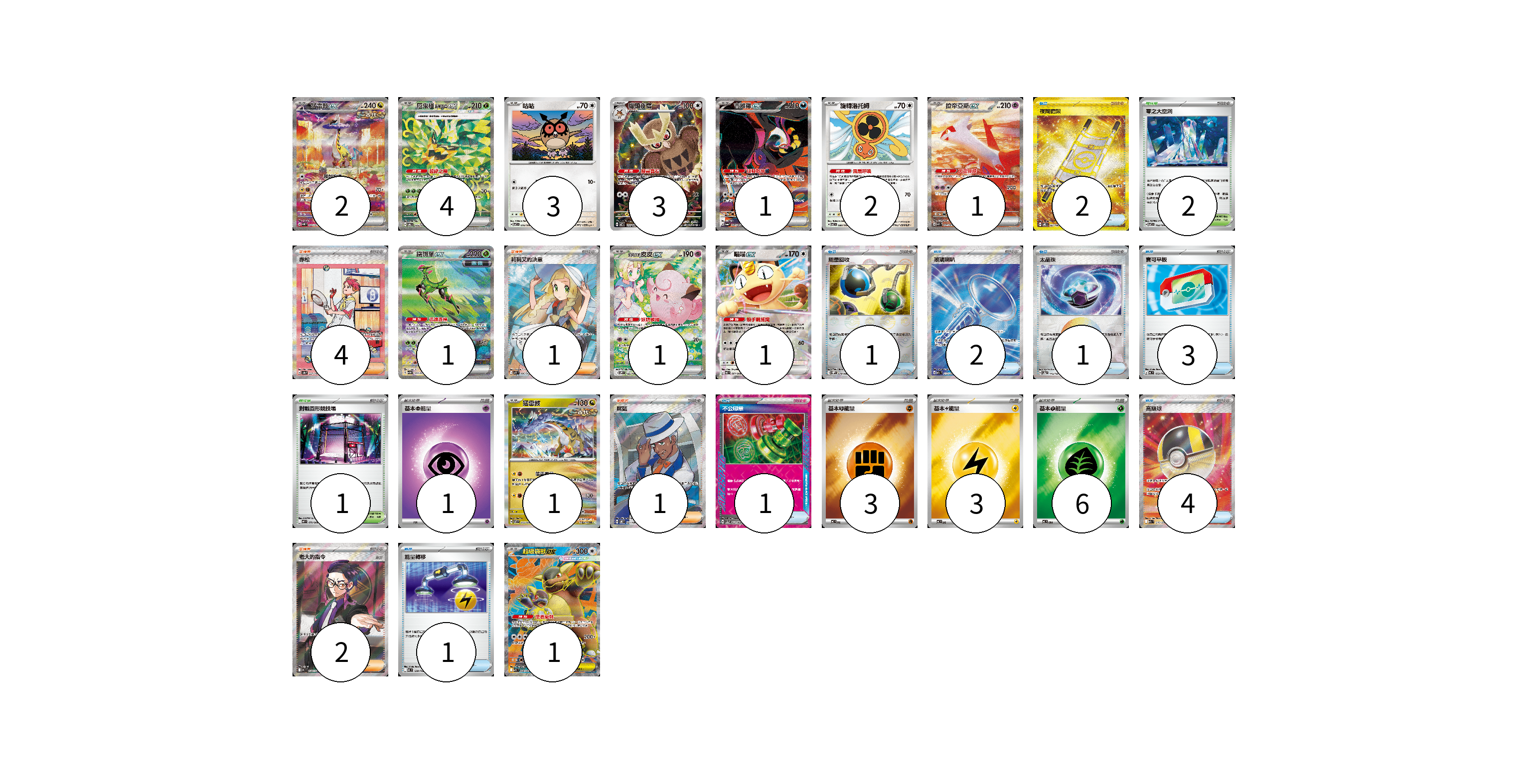 牌組構築方案 以此牌組為基礎新構築牌組 顯示卡面 顯示列表 寶可夢卡(21) 2 4 3 3 1 2 1 1 1 1 1 1 物品卡(15) 2 1 2 1 3 1 4 1 支援者卡(8) 4 1 1 2 競技場卡(3) 2 1 能量卡(13) 1 3 3 6 寶可夢卡(21) 卡牌名稱 張數 卡牌名稱 張數 猛雷鼓ex SV5K 095/071 02 厄鬼椪 碧草面具ex SV6 125/101 04 咕咕 SV7 076/102 03 貓頭夜鷹 SV7 114/102 03 吉雉雞ex SV6a 089/064 01 旋轉洛托姆 SV7 080/102 02 拉帝亞斯ex SV7a 087/064 01 鐵斑葉ex SV5M 093/071 01 莉莉艾的皮皮ex SV9 126/100 01 喵喵ex M3 061/080 01 猛雷鼓 SV7 075/102 01 超級袋獸ex M1S 080/063 01 物品卡(15) 卡牌名稱 張數 卡牌名稱 張數 夜間擔架 SV8 137/106 02 能量回收 SV11W 079/086 01 玻璃喇叭 M2a 215/193 02 太晶珠 SV8a 145/187 01 寶可平板 MC 662/742 03 不公印章 SV5a 053/066 01 高級球 M2a 216/193 04 能量轉移 MC 638/742 01 支援者卡(8) 卡牌名稱 張數 卡牌名稱 張數 赤松 SV8a 227/187 04 莉莉艾的決意 M1L 086/063 01 席藍 SV8 127/106 01 老大的指令(烏羽) MC 760/742 02 競技場卡(3) 卡牌名稱 張數 卡牌名稱 張數 零之大空洞 SV7 102/102 02 對戰圓形競技場 M2 079/080 01 能量卡(13) 卡牌名稱 張數 卡牌名稱 張數 基本【超】能量 MC PSY 01 基本【鬥】能量 MC FIG 03 基本【雷】能量 MC LIG 03 基本【草】能量 MC GRA 06 以此牌組為基礎新構築牌組 牌組編碼 tAkCWN-QIojLG-tcUjra copy 列印牌組單 牌組編碼已複製 分享至SNS