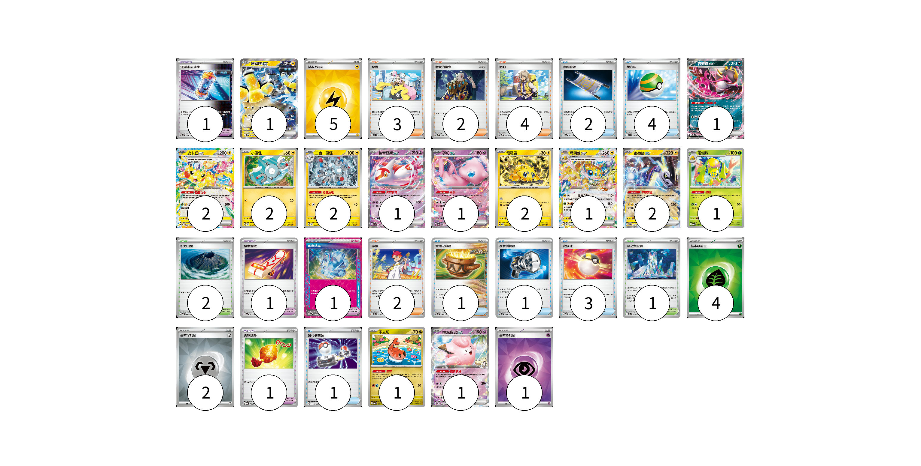 牌組構築方案 以此牌組為基礎新構築牌組 顯示卡面 顯示列表 寶可夢卡(18) 1 1 2 2 2 1 1 2 1 2 1 1 1 寶可夢道具(4) 1 1 1 1 物品卡(12) 2 4 1 1 3 1 支援者卡(11) 3 2 4 2 競技場卡(3) 2 1 能量卡(12) 5 4 2 1 寶可夢卡(18) 卡牌名稱 張數 卡牌名稱 張數 鐵臂膀ex SV4M 027/066 01 吉雉雞ex SV8a 104/187 01 皮卡丘ex SV8 033/106 02 小磁怪 SV8 034/106 02 三合一磁怪 SV8 035/106 02 拉帝亞斯ex SV7a 019/064 01 夢幻ex SVK 001/042 01 電電蟲 SV7 032/102 02 電蜘蛛ex SV7 033/102 01 密勒頓ex SVTR 008/021 02 電蜘蛛 SV6a 002/064 01 米立龍 SV8a 121/187 01 莉莉艾的皮皮ex SV9 033/100 01 寶可夢道具(4) 卡牌名稱 張數 卡牌名稱 張數 驅勁能量 未來 SV8a 158/187 01 緊急滑板 SV8a 153/187 01 璀璨結晶 SV8a 152/187 01 勇氣護符 SV2D 067/071 01 物品卡(12) 卡牌名稱 張數 卡牌名稱 張數 夜間擔架 SV8a 151/187 02 巢穴球 SVK 016/042 04 大地之容器 SV8a 143/187 01 反擊捕捉器 SV8a 139/187 01 高級球 SVTG 013/019 03 寶可夢交替 SVOD 014/020 01 支援者卡(11) 卡牌名稱 張數 卡牌名稱 張數 奇樹 SVM 160/175 03 老大的指令 SVM 172/175 02 派帕 SVK 035/042 04 赤松 SV8a 163/187 02 競技場卡(3) 卡牌名稱 張數 卡牌名稱 張數 引力山岳 SV8 106/106 02 零之大空洞 SV8a 182/187 01 能量卡(12) 卡牌名稱 張數 卡牌名稱 張數 基本【雷】能量 SVK LIG 05 基本【草】能量 SVK GRA 04 基本【鋼】能量 SVK MET 02 基本【超】能量 SVOD PSY 01 以此牌組為基礎新構築牌組 牌組編碼 tBFOhP-kwocXz-ycNjCJ copy 列印牌組單 牌組編碼已複製 分享至SNS