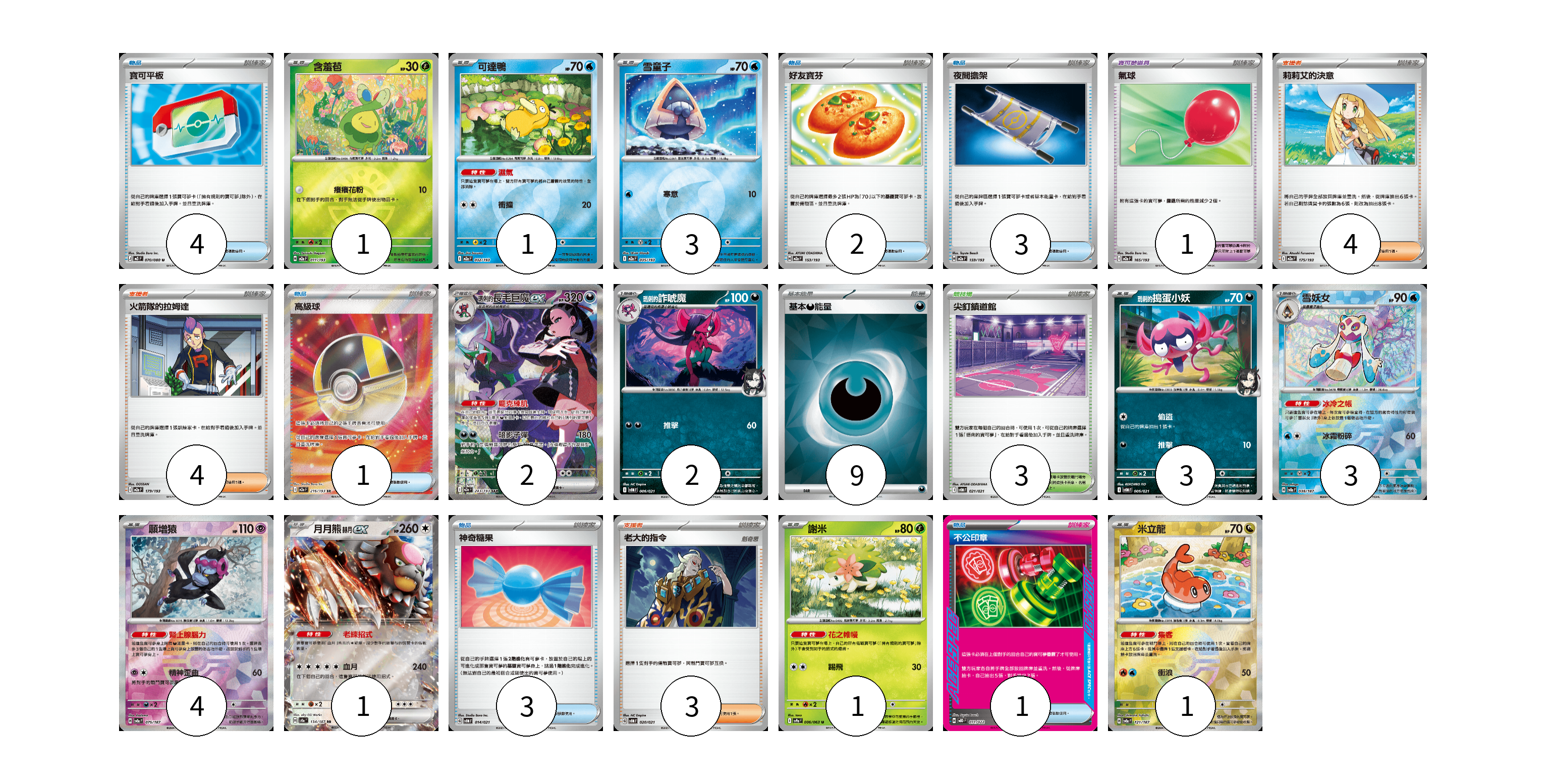 牌組構築方案 以此牌組為基礎新構築牌組 顯示卡面 顯示列表 寶可夢卡(22) 1 1 3 2 2 3 3 4 1 1 1 寶可夢道具(1) 1 物品卡(14) 4 2 3 1 3 1 支援者卡(11) 4 4 3 競技場卡(3) 3 能量卡(9) 9 寶可夢卡(22) 卡牌名稱 張數 卡牌名稱 張數 含羞苞 M2a 011/193 01 可達鴨 M2a 032/193 01 雪童子 M2a 035/193 03 <瑪俐的>長毛巨魔ex M2a 243/193 02 <瑪俐的>詐唬魔 SVOM 006/021 02 <瑪俐的>搗蛋小妖 SVOM 005/021 03 雪妖女 SV8a 038/187 03 願增猿 SV8a 075/187 04 月月熊 赫月ex SV8a 134/187 01 謝米 SV9a 006/063 01 米立龍 SV8a 121/187 01 寶可夢道具(1) 卡牌名稱 張數 卡牌名稱 張數 氣球 M2a 165/193 01 物品卡(14) 卡牌名稱 張數 卡牌名稱 張數 寶可平板 M3 070/080 04 好友寶芬 M2a 153/193 02 夜間擔架 M2a 159/193 03 高級球 M2a 216/193 01 神奇糖果 SVOM 014/021 03 不公印章 MBD 011/022 01 支援者卡(11) 卡牌名稱 張數 卡牌名稱 張數 莉莉艾的決意 M2a 175/193 04 火箭隊的拉姆達 M2a 179/193 04 老大的指令 SVOM 020/021 03 競技場卡(3) 卡牌名稱 張數 卡牌名稱 張數 尖釘鎮道館 SVOM 021/021 03 能量卡(9) 卡牌名稱 張數 卡牌名稱 張數 基本【惡】能量 SVOM DAR 09 以此牌組為基礎新構築牌組 牌組編碼 tDWLqc-STtRrb-yzRGyX copy 列印牌組單 牌組編碼已複製 分享至SNS