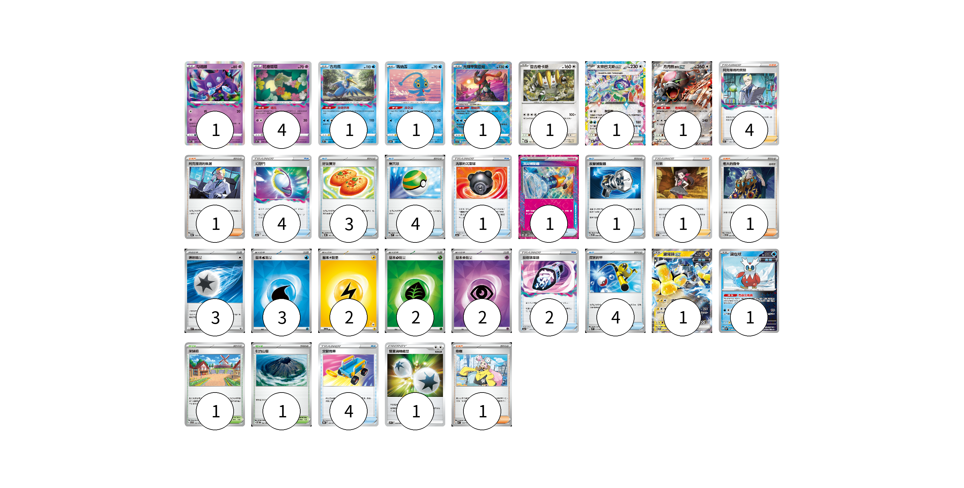 牌組構築方案 以此牌組為基礎新構築牌組 顯示卡面 顯示列表 寶可夢卡(13) 1 4 1 1 1 1 1 1 1 1 物品卡(24) 4 3 4 1 1 1 2 4 4 支援者卡(8) 4 1 1 1 1 競技場卡(2) 1 1 能量卡(13) 3 3 2 2 2 1 寶可夢卡(13) 卡牌名稱 張數 卡牌名稱 張數 勾魂眼 S11 044/100 01 花療環環 S11 049/100 04 古月鳥 S11 033/100 01 瑪納霏 S12a 029/172 01 光輝甲賀忍蛙 S9a 026/067 01 雷吉奇卡斯 SV8a 132/187 01 太樂巴戈斯ex SV8a 136/187 01 月月熊 赫月 ex SV5a 052/066 01 鐵臂膀ex SVTR 007/021 01 鐵包袱 SV8a 047/187 01 物品卡(24) 卡牌名稱 張數 卡牌名稱 張數 幻想門 S12a 141/172 04 好友寶芬 SV8a 147/187 03 巢穴球 SVM 133/175 04 洗翠的沉重球 S12a 140/172 01 頂尖捕捉器 SV5M 062/071 01 反擊捕捉器 SVTS 009/022 01 放逐吸塵器 S12a 144/172 02 厲害釣竿 SVK 011/042 04 交替推車 SVTR 009/021 04 支援者卡(8) 卡牌名稱 張數 卡牌名稱 張數 阿克羅瑪的實驗 S11 095/100 04 阿克羅瑪的執著 SV8a 164/187 01 杜娟 S9a 065/067 01 老大的指令 SVTL 021/021 01 奇樹 SVM 160/175 01 競技場卡(2) 卡牌名稱 張數 卡牌名稱 張數 深缽鎮 SVF 036/038 01 引力山岳 SV8 106/106 01 能量卡(13) 卡牌名稱 張數 卡牌名稱 張數 噴射能量 SVK 040/042 03 基本【水】能量 SVK WAT 03 基本【雷】能量 SVI LIG 02 基本【草】能量 SVK GRA 02 基本【超】能量 SVK PSY 02 雙重渦輪能量 SVTM 022/022 01 以此牌組為基礎新構築牌組 牌組編碼 tDlFCw-zilVfL-AuKADp copy 列印牌組單 牌組編碼已複製 分享至SNS