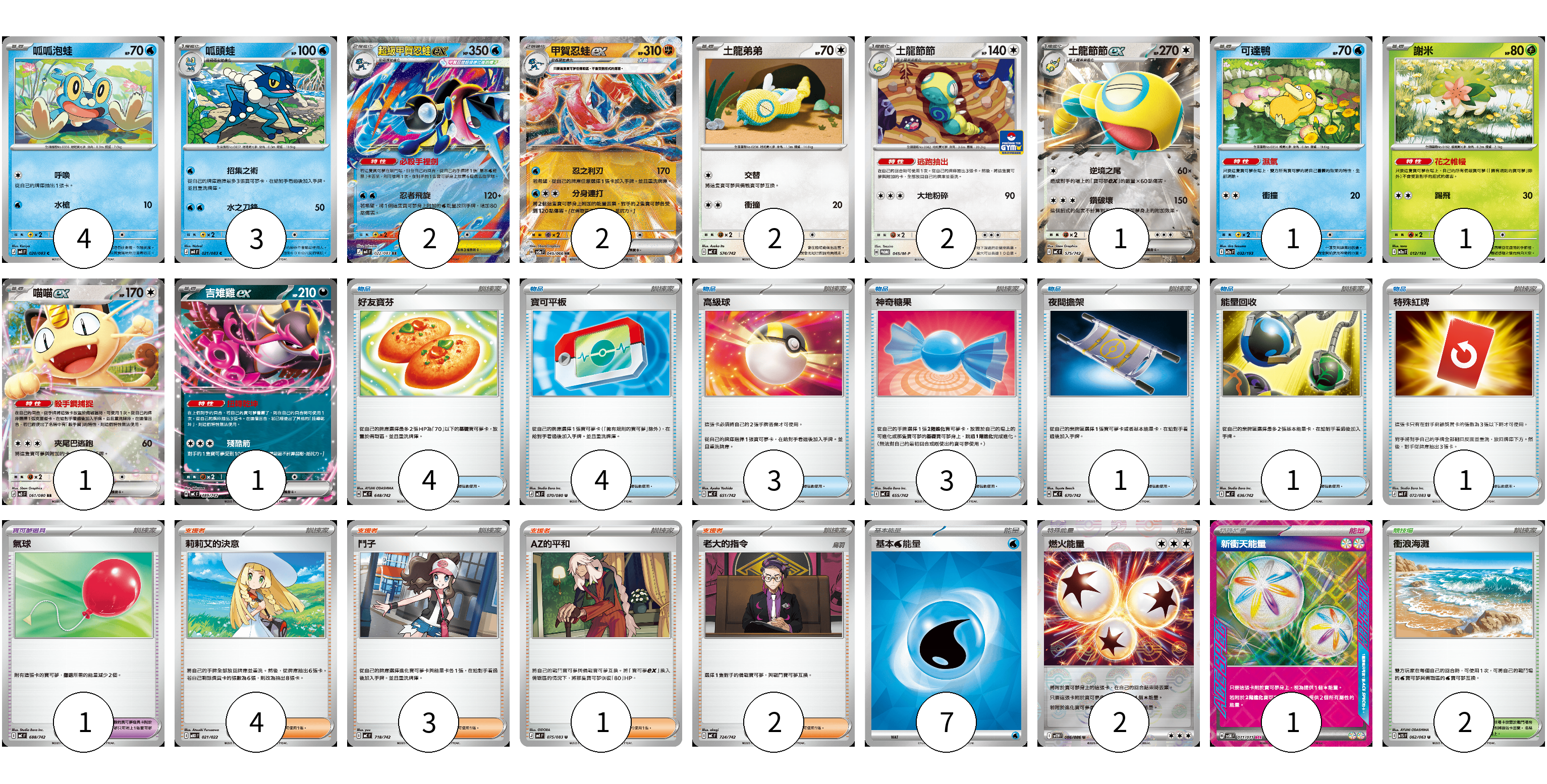 牌組構築方案 以此牌組為基礎新構築牌組 顯示卡面 顯示列表 寶可夢卡(20) 4 3 2 2 2 2 1 1 1 1 1 寶可夢道具(1) 1 物品卡(17) 4 4 3 3 1 1 1 支援者卡(10) 4 3 1 2 競技場卡(2) 2 能量卡(10) 7 2 1 寶可夢卡(20) 卡牌名稱 張數 卡牌名稱 張數 呱呱泡蛙 M4 020/083 04 呱頭蛙 M4 021/083 03 超級甲賀忍蛙ex M4 022/083 02 甲賀忍蛙ex SV5a 045/066 02 土龍弟弟 MC 574/742 02 土龍節節 M-P 045/M-P 02 土龍節節ex MC 575/742 01 可達鴨 M2a 032/193 01 謝米 M2a 012/193 01 喵喵ex M3 061/080 01 吉雉雞ex MC 489/742 01 寶可夢道具(1) 卡牌名稱 張數 卡牌名稱 張數 氣球 MC 688/742 01 物品卡(17) 卡牌名稱 張數 卡牌名稱 張數 好友寶芬 MC 648/742 04 寶可平板 M3 070/080 04 高級球 MC 651/742 03 神奇糖果 MC 655/742 03 夜間擔架 MC 670/742 01 能量回收 MC 636/742 01 特殊紅牌 M4 072/083 01 支援者卡(10) 卡牌名稱 張數 卡牌名稱 張數 莉莉艾的決意 MBD 021/022 04 鬥子 MC 718/742 03 AZ的平和 M4 075/083 01 老大的指令 MC 724/742 02 競技場卡(2) 卡牌名稱 張數 卡牌名稱 張數 衝浪海灘 M1S 062/063 02 能量卡(10) 卡牌名稱 張數 卡牌名稱 張數 基本【水】能量 SVK WAT 07 燃火能量 SV11W 086/086 02 新衝天能量 SV5K 071/071 01 以此牌組為基礎新構築牌組 牌組編碼 tFyTCP-ejaPFe-TGdJUT copy 列印牌組單 牌組編碼已複製 分享至SNS