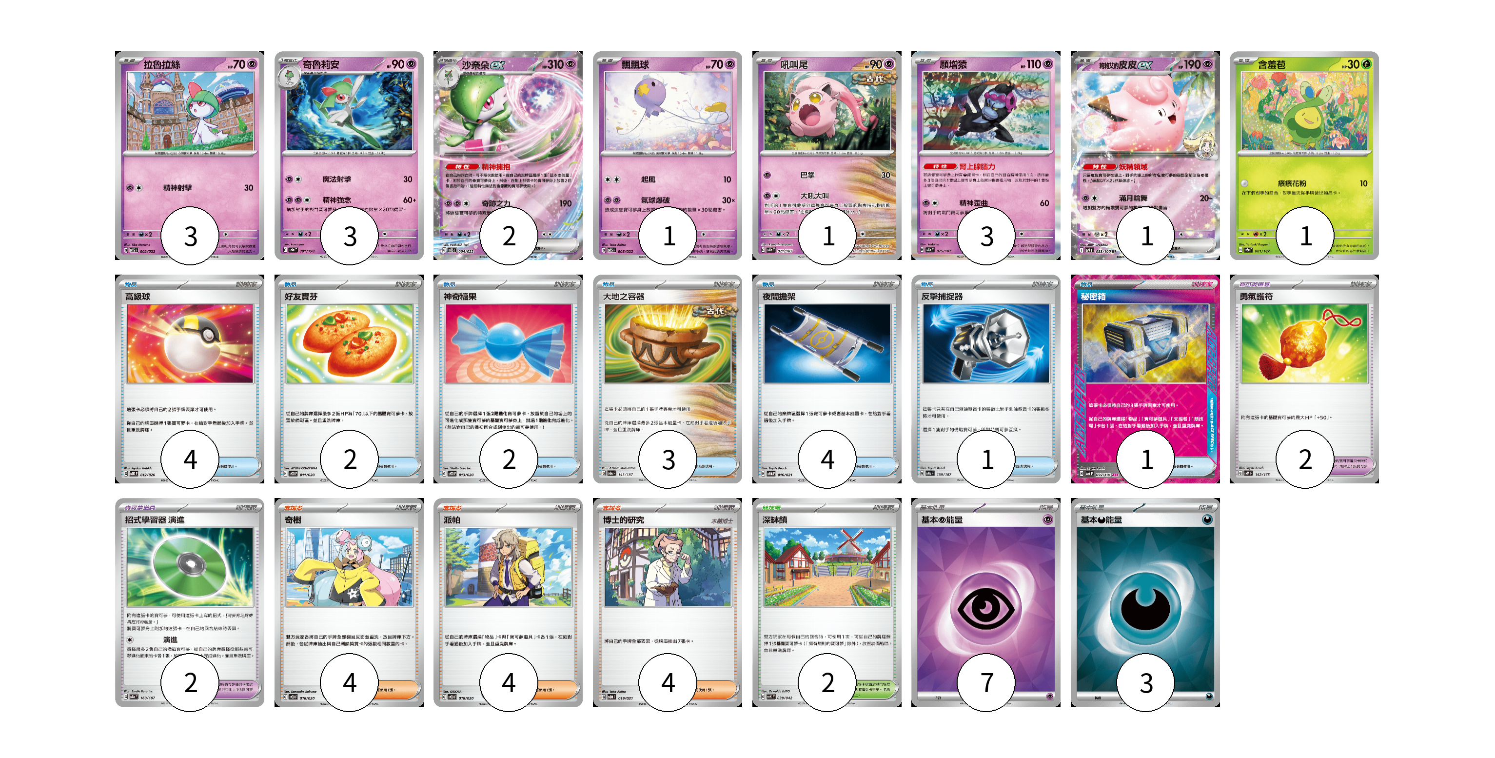 牌組構築方案 以此牌組為基礎新構築牌組 顯示卡面 顯示列表 寶可夢卡(15) 3 3 2 1 1 3 1 1 寶可夢道具(4) 2 2 物品卡(17) 4 2 2 3 4 1 1 支援者卡(12) 4 4 4 競技場卡(2) 2 能量卡(10) 7 3 寶可夢卡(15) 卡牌名稱 張數 卡牌名稱 張數 拉魯拉絲 SVTS 002/022 03 奇魯莉安 SV4a 081/190 03 沙奈朵ex SVTS 004/022 02 飄飄球 SVTS 005/022 01 吼叫尾 SV8a 071/187 01 願增猿 SV8a 075/187 03 莉莉艾的皮皮ex SV9 033/100 01 含羞苞 SV8a 001/187 01 寶可夢道具(4) 卡牌名稱 張數 卡牌名稱 張數 勇氣護符 SVM 142/175 02 招式學習器 演進 SV8a 160/187 02 物品卡(17) 卡牌名稱 張數 卡牌名稱 張數 高級球 SVOD 012/020 04 好友寶芬 SVOD 011/020 02 神奇糖果 SVOD 013/020 02 大地之容器 SV8a 143/187 03 夜間擔架 SVOM 016/021 04 反擊捕捉器 SV8a 139/187 01 秘密箱 SV6 092/101 01 支援者卡(12) 卡牌名稱 張數 卡牌名稱 張數 奇樹 SVOD 016/020 04 派帕 SVOD 018/020 04 博士的研究 SVOM 019/021 04 競技場卡(2) 卡牌名稱 張數 卡牌名稱 張數 深缽鎮 SVK 039/042 02 能量卡(10) 卡牌名稱 張數 卡牌名稱 張數 基本【超】能量 SVOD PSY 07 基本【惡】能量 SVOM DAR 03 以此牌組為基礎新構築牌組 牌組編碼 tHSQaX-GqgISQ-EuyyES copy 列印牌組單 牌組編碼已複製 分享至SNS