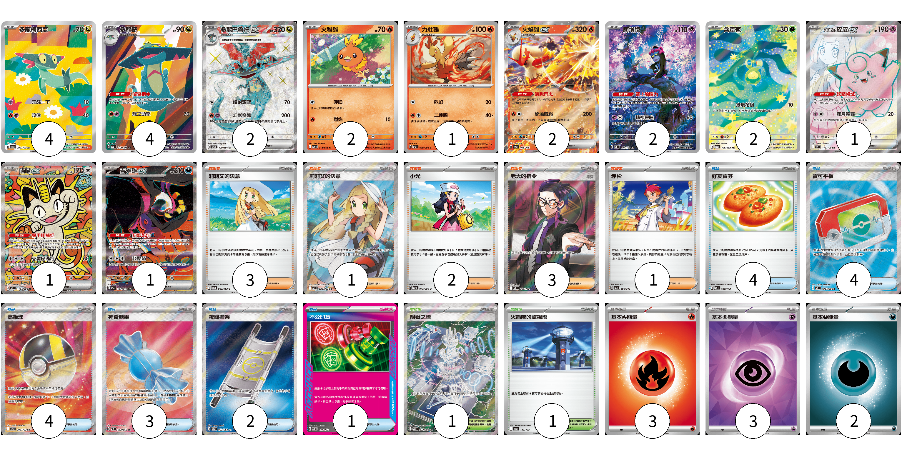 牌組構築方案 以此牌組為基礎新構築牌組 顯示卡面 顯示列表 寶可夢卡(22) 4 4 2 2 1 2 2 2 1 1 1 物品卡(18) 4 4 4 3 2 1 支援者卡(10) 3 1 2 3 1 競技場卡(2) 1 1 能量卡(8) 3 3 2 寶可夢卡(22) 卡牌名稱 張數 卡牌名稱 張數 多龍梅西亞 M2a 211/193 04 多龍奇 M2a 212/193 04 多龍巴魯托ex SV6 120/101 02 火稚雞 SV10 018/098 02 力壯雞 SV10 019/098 01 火焰雞ex SVM 016/175 02 願增猿 SV6 107/101 02 含羞苞 M2a 196/193 02 莉莉艾的皮皮ex SV9 115/100 01 喵喵ex M3 114/080 01 吉雉雞ex SV6a 089/064 01 物品卡(18) 卡牌名稱 張數 卡牌名稱 張數 好友寶芬 MC 648/742 04 寶可平板 M3 103/080 04 高級球 M2a 216/193 04 神奇糖果 M1S 082/063 03 夜間擔架 M1L 083/063 02 不公印章 MBD 011/022 01 支援者卡(10) 卡牌名稱 張數 卡牌名稱 張數 莉莉艾的決意 M1L 062/063 03 莉莉艾的決意 M1L 086/063 01 小光 M2 077/080 02 老大的指令(烏羽) MC 760/742 03 赤松 MC 696/742 01 競技場卡(2) 卡牌名稱 張數 卡牌名稱 張數 阻礙之塔 M2a 222/193 01 火箭隊的監視塔 M2a 189/193 01 能量卡(8) 卡牌名稱 張數 卡牌名稱 張數 基本【火】能量 MC FIR 03 基本【超】能量 SVOD PSY 03 基本【惡】能量 MC DAR 02 以此牌組為基礎新構築牌組 牌組編碼 tIoqIF-UbTTAs-QSXGGm copy 列印牌組單 牌組編碼已複製 分享至SNS