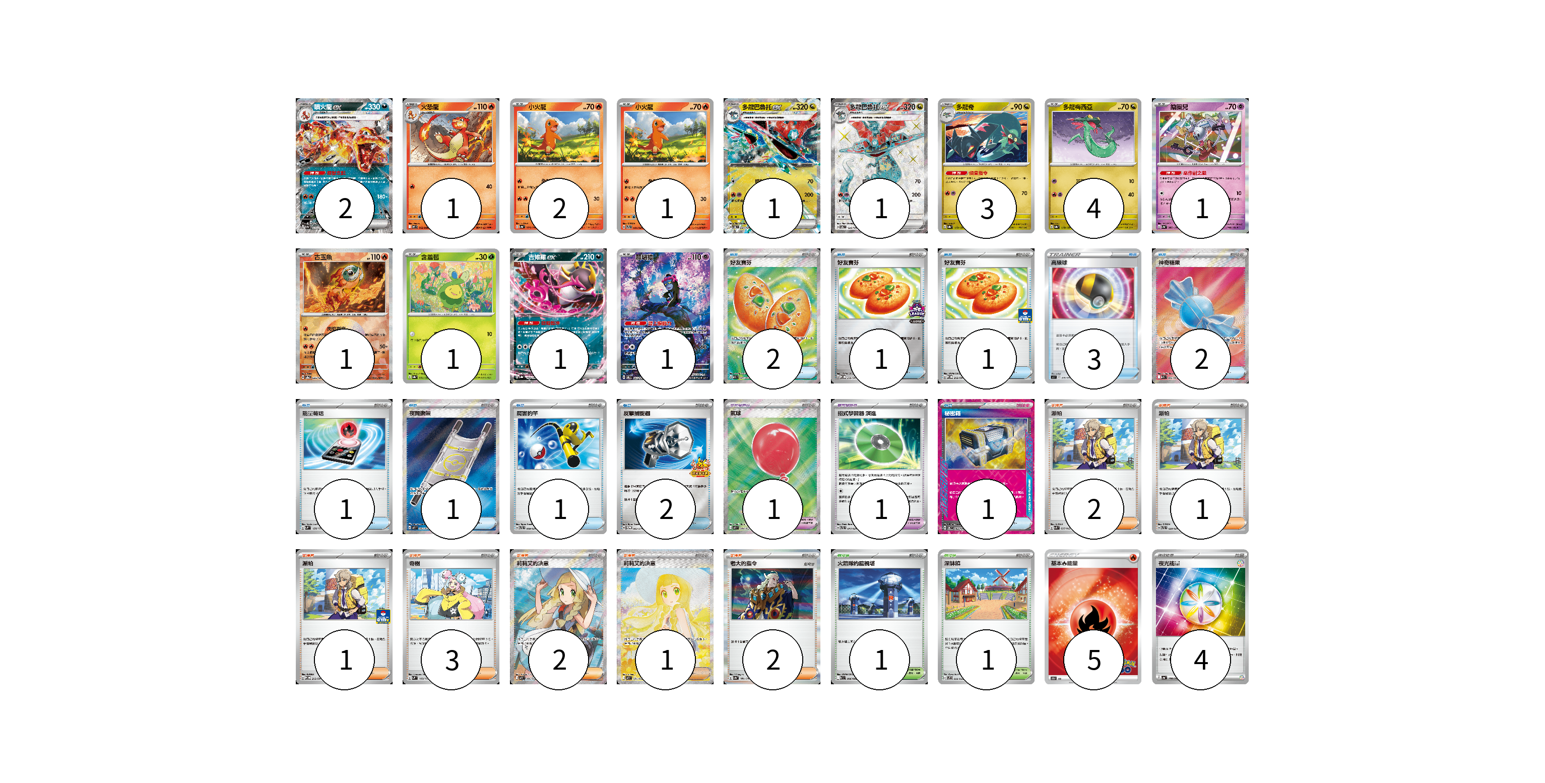 牌組構築方案 以此牌組為基礎新構築牌組 顯示卡面 顯示列表 寶可夢卡(20) 2 1 2 1 1 1 3 4 1 1 1 1 1 寶可夢道具(2) 1 1 物品卡(15) 2 1 1 3 2 1 1 1 2 1 支援者卡(12) 2 1 1 3 2 1 2 競技場卡(2) 1 1 能量卡(9) 5 4 寶可夢卡(20) 卡牌名稱 張數 卡牌名稱 張數 噴火龍ex SV4a 115/190 02 火恐龍 M2 012/080 01 小火龍 SV4a 025/190 02 小火龍 SVTL 001/021 01 多龍巴魯托ex SV6 081/101 01 多龍巴魯托ex SV6 120/101 01 多龍奇 SV8a 119/187 03 多龍梅西亞 SV8a 118/187 04 鑰圈兒 SV4a 087/190 01 古玉魚 SV8a 025/187 01 含羞苞 SV8a 001/187 01 吉雉雞ex SV8a 104/187 01 願增猿 SV6 107/101 01 寶可夢道具(2) 卡牌名稱 張數 卡牌名稱 張數 氣球 M1L 084/063 01 招式學習器 演進 SVTL 017/021 01 物品卡(15) 卡牌名稱 張數 卡牌名稱 張數 好友寶芬 M1S 081/063 02 好友寶芬 SV-P 230/SV-P 01 好友寶芬 SV-P 212/SV-P 01 高級球 SI 375/414 03 神奇糖果 M1S 082/063 02 能量輸送 SVM 128/175 01 夜間擔架 M1L 083/063 01 厲害釣竿 SVTL 009/021 01 反擊捕捉器 SV-P 083/SV-P 02 秘密箱 SV6 092/101 01 支援者卡(12) 卡牌名稱 張數 卡牌名稱 張數 派帕 SVK 035/042 02 派帕 SVTL 020/021 01 派帕 SV-P 213/SV-P 01 奇樹 SVM 160/175 03 莉莉艾的決意 M1L 086/063 02 莉莉艾的決意 M1L 091/063 01 老大的指令 SV4a 181/190 02 競技場卡(2) 卡牌名稱 張數 卡牌名稱 張數 火箭隊的監視塔 SV10 096/098 01 深缽鎮 SVF 036/038 01 能量卡(9) 卡牌名稱 張數 卡牌名稱 張數 基本火能量 S10b FIR 05 夜光能量 SV4a 190/190 04 以此牌組為基礎新構築牌組 牌組編碼 tMxTrn-DdPsQS-StLbjh copy 列印牌組單 牌組編碼已複製 分享至SNS