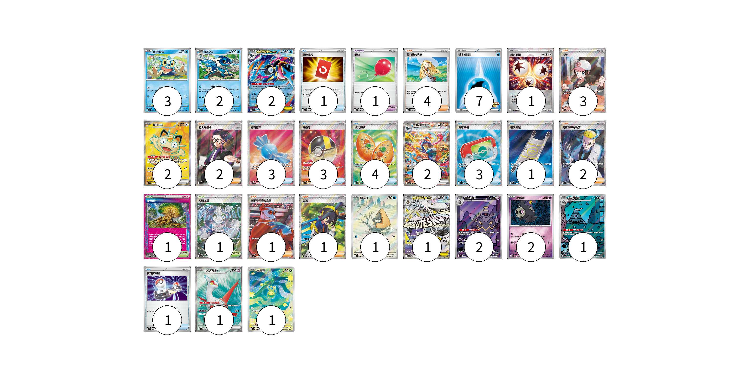 牌組構築方案 以此牌組為基礎新構築牌組 顯示卡面 顯示列表 寶可夢卡(20) 3 2 2 2 2 1 1 2 2 1 1 1 寶可夢道具(1) 1 物品卡(16) 1 3 3 4 3 1 1 支援者卡(13) 4 3 2 2 1 1 競技場卡(2) 1 1 能量卡(8) 7 1 寶可夢卡(20) 卡牌名稱 張數 卡牌名稱 張數 呱呱泡蛙 M4 020/083 03 呱頭蛙 M4 021/083 02 超級甲賀忍蛙ex M4 022/083 02 喵喵ex M3 100/080 02 甲賀忍蛙ex SV5a 090/066 02 雪童子 M2a 200/193 01 超級雪妖女ex M2a 224/193 01 黑夜魔靈 SV6a 070/064 02 夜巡靈 M2a 072/193 02 彷徨夜靈 SV6a 069/064 01 拉帝亞斯ex SV7a 078/064 01 含羞苞 M2a 196/193 01 寶可夢道具(1) 卡牌名稱 張數 卡牌名稱 張數 氣球 MC 688/742 01 物品卡(16) 卡牌名稱 張數 卡牌名稱 張數 特殊紅牌 M4 072/083 01 神奇糖果 M1S 082/063 03 高級球 M2a 216/193 03 好友寶芬 M1S 081/063 04 寶可平板 M3 103/080 03 夜間擔架 M1L 083/063 01 寶可夢交替 MJ 019/022 01 支援者卡(13) 卡牌名稱 張數 卡牌名稱 張數 莉莉艾的決意 MC 729/742 04 鬥子 SV11W 166/086 03 老大的指令(烏羽) MC 760/742 02 阿克羅瑪的執著 SV6a 083/064 02 庫瑟洛斯奇的企圖 SV6a 086/064 01 烏栗 SV6 122/101 01 競技場卡(2) 卡牌名稱 張數 卡牌名稱 張數 壯偉碩木 SV7 101/102 01 阻礙之塔 M2a 222/193 01 能量卡(8) 卡牌名稱 張數 卡牌名稱 張數 基本【水】能量 SV-P 259/SV-P 07 燃火能量 SV11W 086/086 01 以此牌組為基礎新構築牌組 牌組編碼 tNABdG-cDlZGC-EEqXEP copy 列印牌組單 牌組編碼已複製 分享至SNS