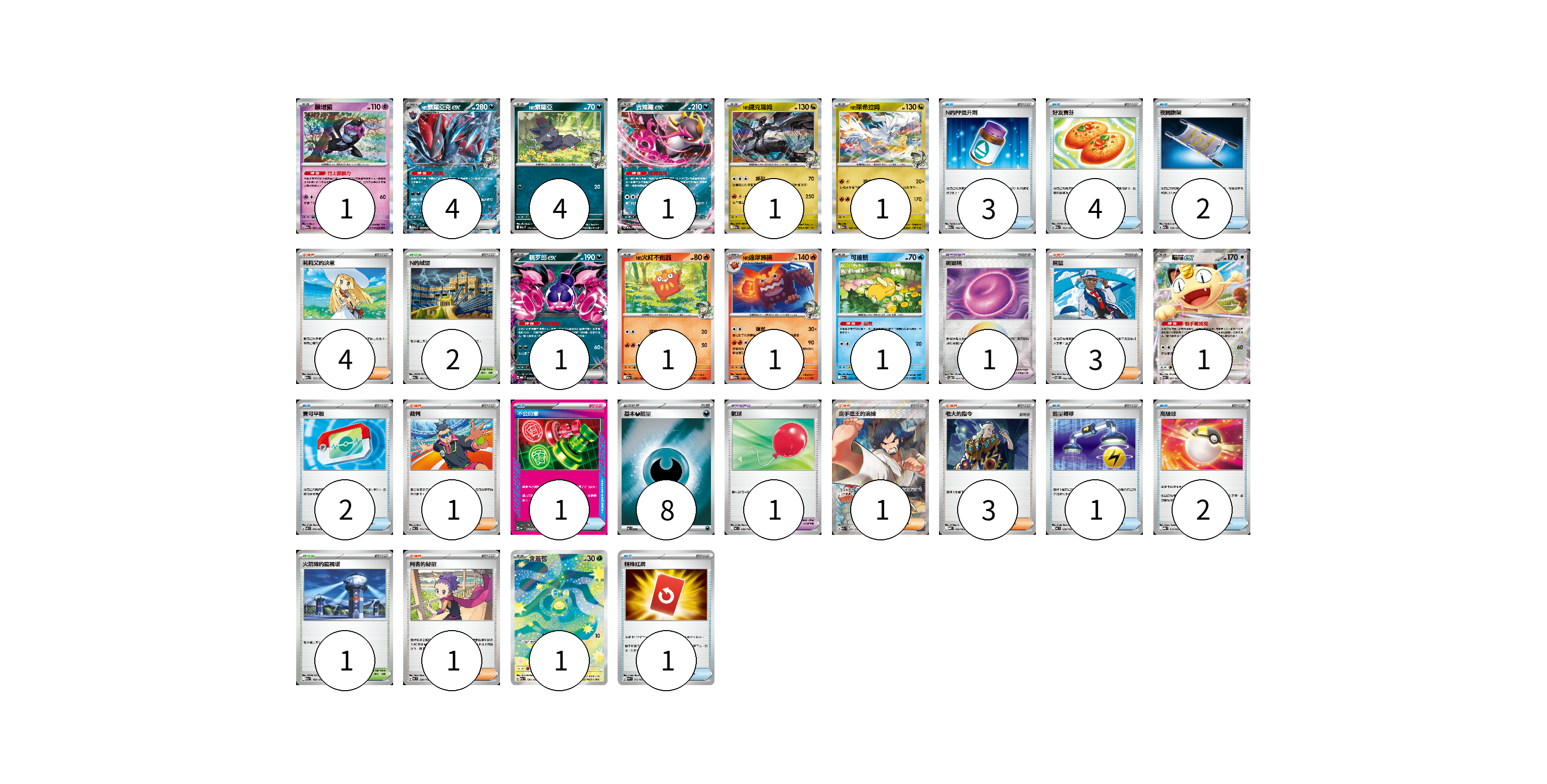 牌組構築方案 以此牌組為基礎新構築牌組 顯示卡面 顯示列表 寶可夢卡(18) 1 4 4 1 1 1 1 1 1 1 1 1 寶可夢道具(2) 1 1 物品卡(16) 3 4 2 2 1 1 2 1 支援者卡(13) 4 3 1 1 3 1 競技場卡(3) 2 1 能量卡(8) 8 寶可夢卡(18) 卡牌名稱 張數 卡牌名稱 張數 願增猿 M2a 081/193 01 N的索羅亞克ex M2a 112/193 04 N的索羅亞 M2a 111/193 04 吉雉雞ex M2a 114/193 01 N的捷克羅姆 M2a 129/193 01 N的萊希拉姆 M2a 128/193 01 桃歹郎ex MBG 009/022 01 N的火紅不倒翁 M2a 027/193 01 N的達摩狒狒 M2a 028/193 01 可達鴨 M2a 032/193 01 喵喵ex M3 061/080 01 含羞苞 M2a 196/193 01 寶可夢道具(2) 卡牌名稱 張數 卡牌名稱 張數 鎖鏈糬 SV8a 154/187 01 氣球 MC 688/742 01 物品卡(16) 卡牌名稱 張數 卡牌名稱 張數 N的PP提升劑 M2a 146/193 03 好友寶芬 M2a 153/193 04 夜間擔架 M2a 159/193 02 寶可平板 M3 070/080 02 不公印章 MC 633/742 01 能量轉移 MC 638/742 01 高級球 MBG 012/022 02 特殊紅牌 M4 072/083 01 支援者卡(13) 卡牌名稱 張數 卡牌名稱 張數 莉莉艾的決意 M2a 175/193 04 席藍 SV8 102/106 03 裁判 MC 711/742 01 空手道王的演練 M2a 220/193 01 老大的指令 MBD 020/022 03 阿杏的秘招 MC 699/742 01 競技場卡(3) 卡牌名稱 張數 卡牌名稱 張數 N的城堡 M2a 181/193 02 火箭隊的監視塔 M2a 189/193 01 能量卡(8) 卡牌名稱 張數 卡牌名稱 張數 基本【惡】能量 MC DAR 08 以此牌組為基礎新構築牌組 牌組編碼 tObeAF-ZLXsDm-bKwTla copy 列印牌組單 牌組編碼已複製 分享至SNS
