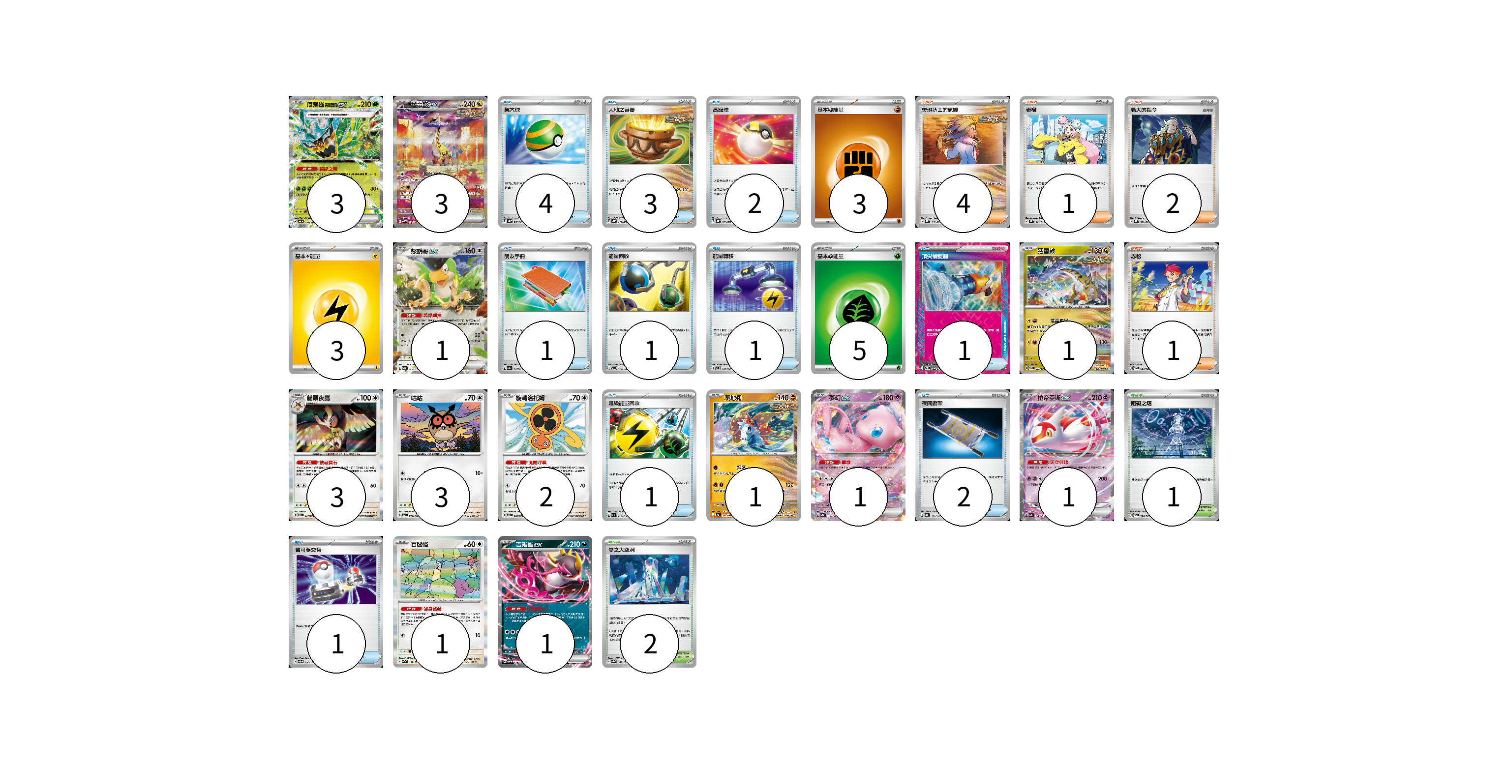 牌組構築方案 以此牌組為基礎新構築牌組 顯示卡面 顯示列表 寶可夢卡(21) 3 3 1 1 3 3 2 1 1 1 1 1 物品卡(17) 4 3 2 1 1 1 1 1 2 1 支援者卡(8) 4 1 2 1 競技場卡(3) 1 2 能量卡(11) 3 3 5 寶可夢卡(21) 卡牌名稱 張數 卡牌名稱 張數 厄鬼椪 碧草面具ex SV6 016/101 03 猛雷鼓ex SV5K 095/071 03 怒鸚哥ex SV4a 154/190 01 猛雷鼓 SV7 075/102 01 貓頭夜鷹 SV7 077/102 03 咕咕 SV7 076/102 03 旋轉洛托姆 SV7 080/102 02 爬地翅 SV4K 041/066 01 夢幻ex SV2a 151/165 01 拉帝亞斯ex SV7a 019/064 01 百變怪 SV2a 132/165 01 吉雉雞ex SVOM 009/021 01 物品卡(17) 卡牌名稱 張數 卡牌名稱 張數 巢穴球 SVHK 012/022 04 大地之容器 SVHK 011/022 03 高級球 SVHK 013/022 02 朋友手冊 SV1S 069/078 01 能量回收 SVD 110/139 01 能量轉移 SVC 011/021 01 頂尖捕捉器 SV5M 062/071 01 超級能量回收 SV1a 064/073 01 夜間擔架 SV8a 151/187 02 寶可夢交替 SVOD 014/020 01 支援者卡(8) 卡牌名稱 張數 卡牌名稱 張數 奧琳博士的氣魄 SVHK 017/022 04 奇樹 SVHK 019/022 01 老大的指令 SVHK 022/022 02 赤松 SV7 097/102 01 競技場卡(3) 卡牌名稱 張數 卡牌名稱 張數 阻礙之塔 SV6 100/101 01 零之大空洞 SV8a 182/187 02 能量卡(11) 卡牌名稱 張數 卡牌名稱 張數 基本【鬥】能量 SVHK FIG 03 基本【雷】能量 SVHM LIG 03 基本草能量 sv-p GRA 05 以此牌組為基礎新構築牌組 牌組編碼 tPBiNm-FRSvRJ-xnIJQN copy 列印牌組單 牌組編碼已複製 分享至SNS