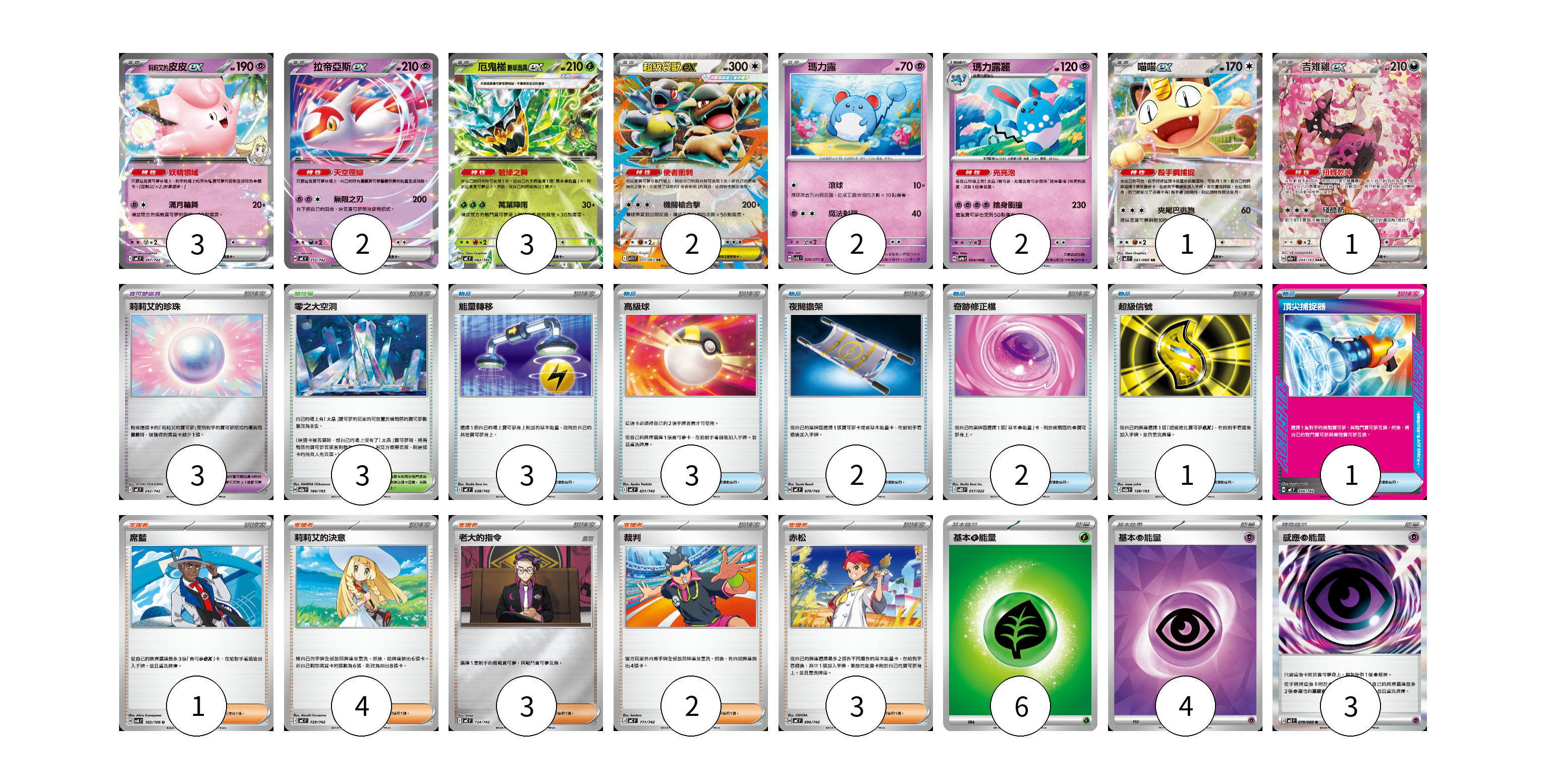 牌組構築方案 以此牌組為基礎新構築牌組 顯示卡面 顯示列表 寶可夢卡(16) 3 2 3 2 2 2 1 1 寶可夢道具(3) 3 物品卡(12) 3 3 2 2 1 1 支援者卡(13) 1 4 3 2 3 競技場卡(3) 3 能量卡(13) 6 4 3 寶可夢卡(16) 卡牌名稱 張數 卡牌名稱 張數 莉莉艾的皮皮ex MC 287/742 03 拉帝亞斯ex MC 312/742 02 厄鬼椪 碧草面具ex MC 082/742 03 超級袋獸ex M1S 051/063 02 瑪力露 SV5K 026/071 02 瑪力露麗 SVPN 004/008 02 喵喵ex M3 061/080 01 吉雉雞ex M2a 244/193 01 寶可夢道具(3) 卡牌名稱 張數 卡牌名稱 張數 莉莉艾的珍珠 MC 692/742 03 物品卡(12) 卡牌名稱 張數 卡牌名稱 張數 能量轉移 MC 638/742 03 高級球 MC 651/742 03 夜間擔架 MC 670/742 02 奇跡修正檔 MBD 017/022 02 超級信號 M2a 158/193 01 頂尖捕捉器 MC 656/742 01 支援者卡(13) 卡牌名稱 張數 卡牌名稱 張數 席藍 SV8 102/106 01 莉莉艾的決意 MC 729/742 04 老大的指令 MC 724/742 03 裁判 MC 711/742 02 赤松 MC 696/742 03 競技場卡(3) 卡牌名稱 張數 卡牌名稱 張數 零之大空洞 M2a 184/193 03 能量卡(13) 卡牌名稱 張數 卡牌名稱 張數 基本【草】能量 MJ GRA 06 基本【超】能量 SVOD PSY 04 感應【超】能量 M3 079/080 03 以此牌組為基礎新構築牌組 牌組編碼 tQxWxD-OHGJZv-LtlbqZ copy 列印牌組單 牌組編碼已複製 分享至SNS