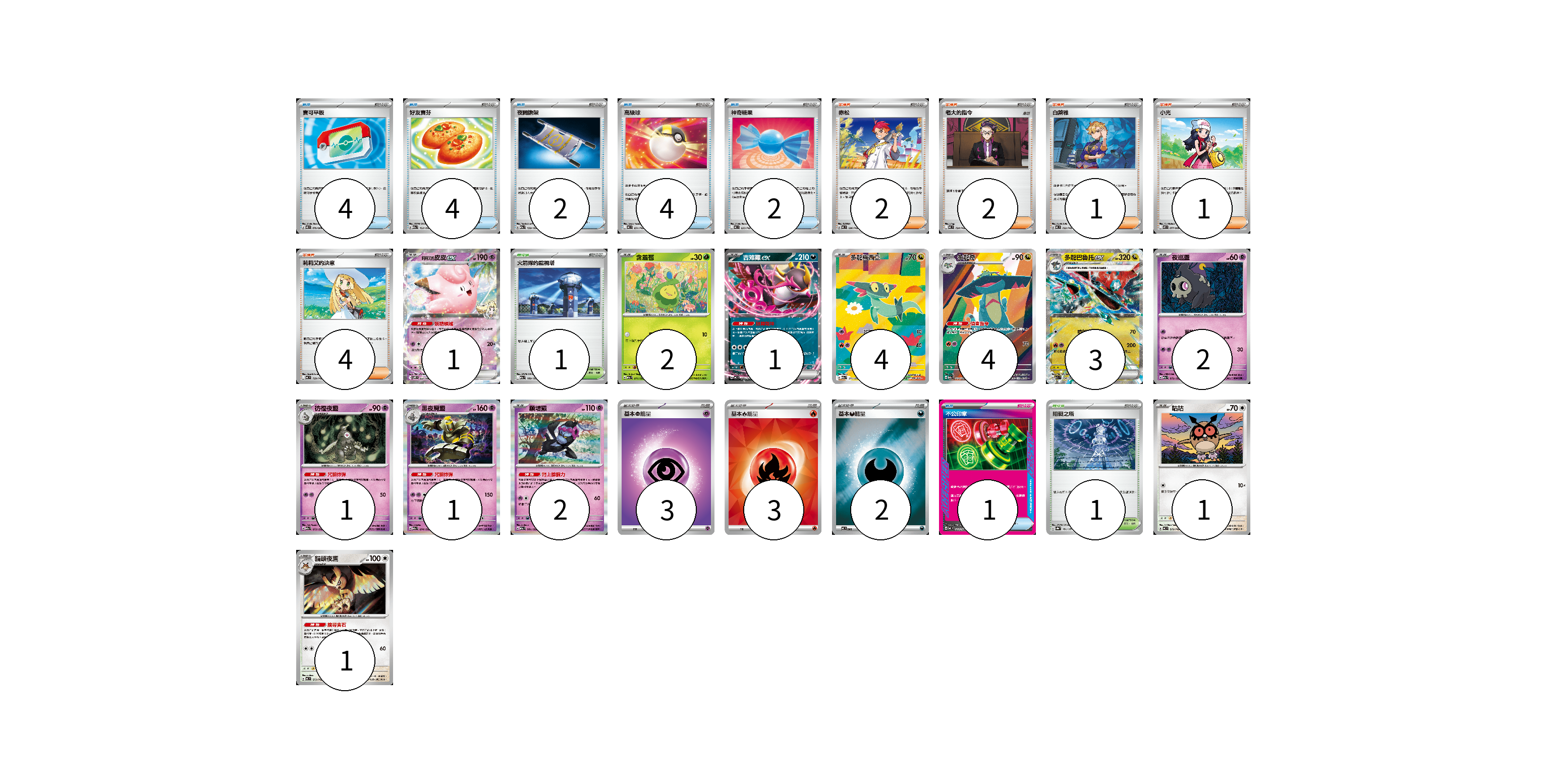 牌組構築方案 以此牌組為基礎新構築牌組 顯示卡面 顯示列表 寶可夢卡(23) 1 2 1 4 4 3 2 1 1 2 1 1 物品卡(17) 4 4 2 4 2 1 支援者卡(10) 2 2 1 1 4 競技場卡(2) 1 1 能量卡(8) 3 3 2 寶可夢卡(23) 卡牌名稱 張數 卡牌名稱 張數 莉莉艾的皮皮ex SV9 033/100 01 含羞苞 M2a 011/193 02 吉雉雞ex MC 489/742 01 多龍梅西亞 M2a 211/193 04 多龍奇 M2a 212/193 04 多龍巴魯托ex M2a 134/193 03 夜巡靈 M2a 072/193 02 彷徨夜靈 M2a 073/193 01 黑夜魔靈 M2a 074/193 01 願增猿 M2a 081/193 02 咕咕 MC 572/742 01 貓頭夜鷹 MC 573/742 01 物品卡(17) 卡牌名稱 張數 卡牌名稱 張數 寶可平板 M3 070/080 04 好友寶芬 M2a 153/193 04 夜間擔架 M2a 159/193 02 高級球 MC 651/742 04 神奇糖果 MC 655/742 02 不公印章 MC 633/742 01 支援者卡(10) 卡牌名稱 張數 卡牌名稱 張數 赤松 MC 696/742 02 老大的指令 MC 724/742 02 白蕾雅 MC 722/742 01 小光 M2 077/080 01 莉莉艾的決意 MC 729/742 04 競技場卡(2) 卡牌名稱 張數 卡牌名稱 張數 火箭隊的監視塔 M2a 189/193 01 阻礙之塔 SV8a 181/187 01 能量卡(8) 卡牌名稱 張數 卡牌名稱 張數 基本【超】能量 M-P PSY 03 基本【火】能量 SVQL FIR 03 基本【惡】能量 MC DAR 02 以此牌組為基礎新構築牌組 牌組編碼 tSLirR-qWUFEg-pluacZ copy 列印牌組單 牌組編碼已複製 分享至SNS