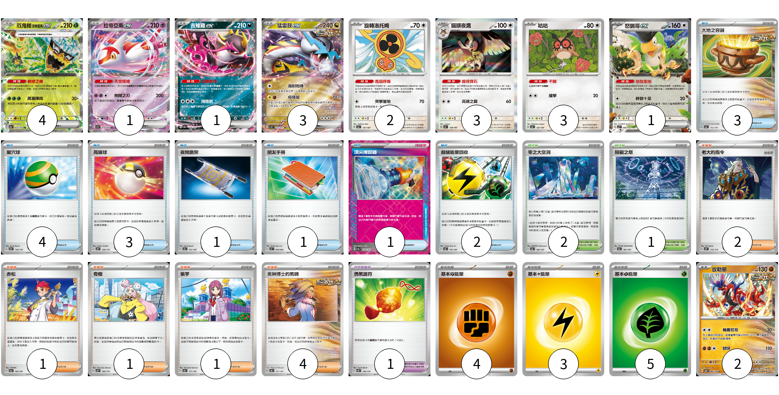 牌組構築方案 以此牌組為基礎新構築牌組 顯示卡面 顯示列表 寶可夢卡(20) 4 1 1 3 2 3 3 1 2 寶可夢道具(1) 1 物品卡(15) 3 4 3 1 1 1 2 支援者卡(9) 2 1 1 1 4 競技場卡(3) 2 1 能量卡(12) 4 3 5 寶可夢卡(20) 卡牌名稱 張數 卡牌名稱 張數 厄鬼椪 碧草面具ex SV8a 020/187 04 拉帝亞斯ex SV7a 019/064 01 吉雉雞ex SV8a 104/187 01 猛雷鼓ex SV5K 053/071 03 旋轉洛托姆 SV8a 131/187 02 貓頭夜鷹 SV8a 128/187 03 咕咕 SV8a 127/187 03 怒鸚哥ex SVK 006/042 01 故勒頓 SV8 069/106 02 寶可夢道具(1) 卡牌名稱 張數 卡牌名稱 張數 勇氣護符 SVM 142/175 01 物品卡(15) 卡牌名稱 張數 卡牌名稱 張數 大地之容器 SV8a 143/187 03 巢穴球 SVM 133/175 04 高級球 SVM 134/175 03 夜間擔架 SV8a 151/187 01 朋友手冊 SVK 014/042 01 頂尖捕捉器 SV8a 148/187 01 超級能量回收 SV8a 141/187 02 支援者卡(9) 卡牌名稱 張數 卡牌名稱 張數 老大的指令 SVM 172/175 02 赤松 SV8a 163/187 01 奇樹 SVM 160/175 01 紫竽 SV8a 171/187 01 奧琳博士的氣魄 SV8a 167/187 04 競技場卡(3) 卡牌名稱 張數 卡牌名稱 張數 零之大空洞 SV8a 182/187 02 阻礙之塔 SV8a 181/187 01 能量卡(12) 卡牌名稱 張數 卡牌名稱 張數 基本【鬥】能量 SVTG FIG 04 基本【雷】能量 SVTR LIG 03 基本【草】能量 SVTM GRA 05 以此牌組為基礎新構築牌組 牌組編碼 tUdwvZ-lMGKgI-AVmvhy copy 列印牌組單 牌組編碼已複製 分享至SNS