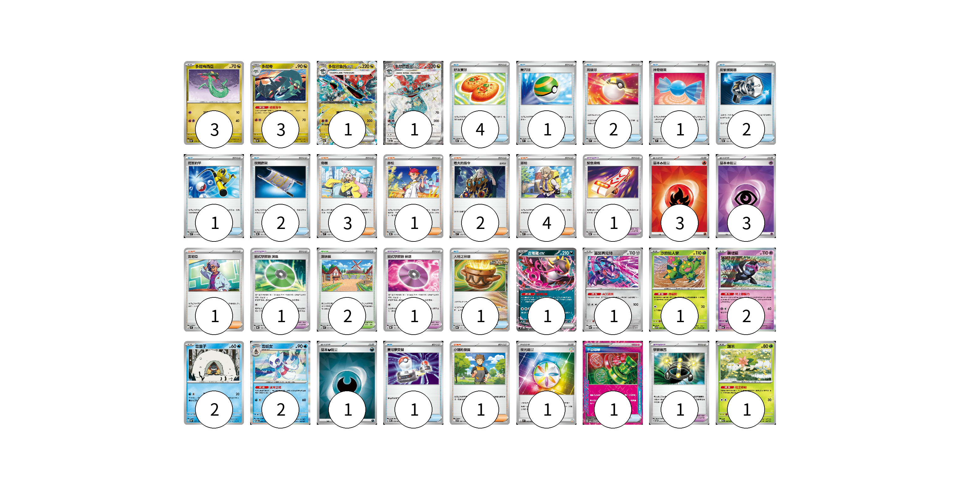 牌組構築方案 以此牌組為基礎新構築牌組 顯示卡面 顯示列表 寶可夢卡(18) 3 3 1 1 1 1 1 2 2 2 1 寶可夢道具(4) 1 1 1 1 物品卡(16) 4 1 2 1 2 1 2 1 1 1 支援者卡(12) 3 1 2 4 1 1 競技場卡(2) 2 能量卡(8) 3 3 1 1 寶可夢卡(18) 卡牌名稱 張數 卡牌名稱 張數 多龍梅西亞 SV8a 118/187 03 多龍奇 SV8a 119/187 03 多龍巴魯托ex SV8a 120/187 01 多龍巴魯托ex SV6 120/101 01 吉雉雞ex SVOD 004/020 01 蓋諾賽克特 SV6a 040/064 01 沙鈴仙人掌 SV9 006/100 01 願增猿 SV8a 075/187 02 雪童子 SV8a 037/187 02 雪妖女 SV6 033/101 02 謝米 SV9a 006/063 01 寶可夢道具(4) 卡牌名稱 張數 卡牌名稱 張數 緊急滑板 SV8a 153/187 01 招式學習器 演進 SV8a 160/187 01 招式學習器 衰退 SV8a 161/187 01 學習裝置 SVTM 016/022 01 物品卡(16) 卡牌名稱 張數 卡牌名稱 張數 好友寶芬 SV8a 147/187 04 巢穴球 SVM 133/175 01 高級球 SVM 134/175 02 神奇糖果 SVM 135/175 01 反擊捕捉器 SV8a 139/187 02 厲害釣竿 SVK 011/042 01 夜間擔架 SV8a 151/187 02 大地之容器 SV8a 143/187 01 寶可夢交替 SV9a 058/063 01 不公印章 SV5a 053/066 01 支援者卡(12) 卡牌名稱 張數 卡牌名稱 張數 奇樹 SVM 160/175 03 赤松 SV8a 163/187 01 老大的指令 SVM 172/175 02 派帕 SVK 035/042 04 吉尼亞 SV1S 074/078 01 小剛的發掘 SV9 096/100 01 競技場卡(2) 卡牌名稱 張數 卡牌名稱 張數 深缽鎮 SVK 039/042 02 能量卡(8) 卡牌名稱 張數 卡牌名稱 張數 基本【火】能量 SVK FIR 03 基本【超】能量 SVK PSY 03 基本【惡】能量 SVOM DAR 01 夜光能量 SVK 042/042 01 以此牌組為基礎新構築牌組 牌組編碼 tUqYcN-xnDeIn-XaECIJ copy 列印牌組單 牌組編碼已複製 分享至SNS