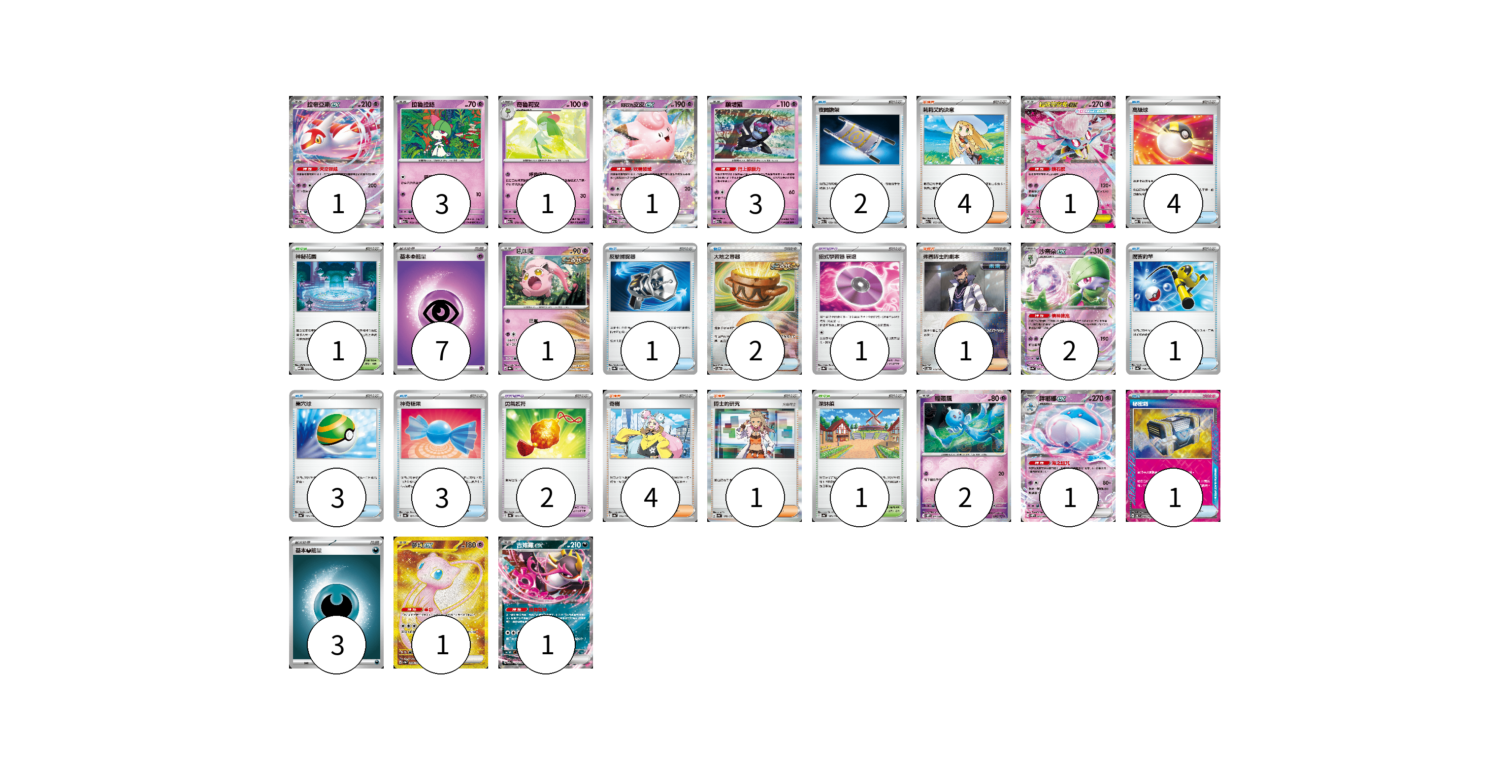 牌組構築方案 以此牌組為基礎新構築牌組 顯示卡面 顯示列表 寶可夢卡(18) 1 3 1 1 3 1 1 2 2 1 1 1 寶可夢道具(3) 1 2 物品卡(17) 2 4 1 2 1 3 3 1 支援者卡(10) 4 1 4 1 競技場卡(2) 1 1 能量卡(10) 7 3 寶可夢卡(18) 卡牌名稱 張數 卡牌名稱 張數 拉帝亞斯ex M2a 075/193 01 拉魯拉絲 M2a 069/193 03 奇魯莉安 M2a 070/193 01 莉莉艾的皮皮ex M2a 060/193 01 願增猿 M2a 081/193 03 超級蒂安希ex MBD 006/022 01 吼叫尾 SV8a 071/187 01 沙奈朵ex SV4a 082/190 02 輕飄飄 SV11W 041/086 02 胖嘟嘟ex SV11W 042/086 01 夢幻ex SV2a 208/165 01 吉雉雞ex M2a 114/193 01 寶可夢道具(3) 卡牌名稱 張數 卡牌名稱 張數 招式學習器 衰退 SV8a 161/187 01 勇氣護符 SV4a 169/190 02 物品卡(17) 卡牌名稱 張數 卡牌名稱 張數 夜間擔架 M2a 159/193 02 高級球 MBD 014/022 04 反擊捕捉器 SV8a 139/187 01 大地之容器 SV8a 143/187 02 厲害釣竿 SV4a 158/190 01 巢穴球 SV4a 159/190 03 神奇糖果 SV4a 163/190 03 秘密箱 SV6 092/101 01 支援者卡(10) 卡牌名稱 張數 卡牌名稱 張數 莉莉艾的決意 M2a 175/193 04 弗圖博士的劇本 SV8a 175/187 01 奇樹 SV4a 174/190 04 博士的研究 SV4a 176/190 01 競技場卡(2) 卡牌名稱 張數 卡牌名稱 張數 神秘花園 MBD 022/022 01 深缽鎮 SV4a 185/190 01 能量卡(10) 卡牌名稱 張數 卡牌名稱 張數 基本【超】能量 MBD PSY 07 基本【惡】能量 MBG DAR 03 以此牌組為基礎新構築牌組 牌組編碼 tUrZso-AGFJFv-tPgvoQ copy 列印牌組單 牌組編碼已複製 分享至SNS